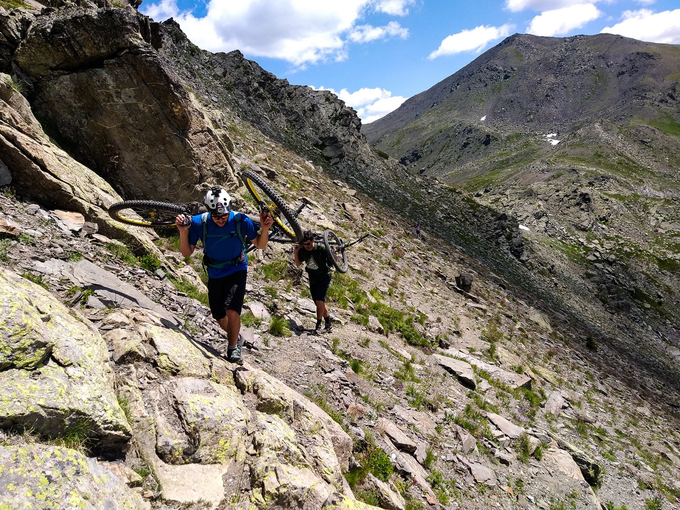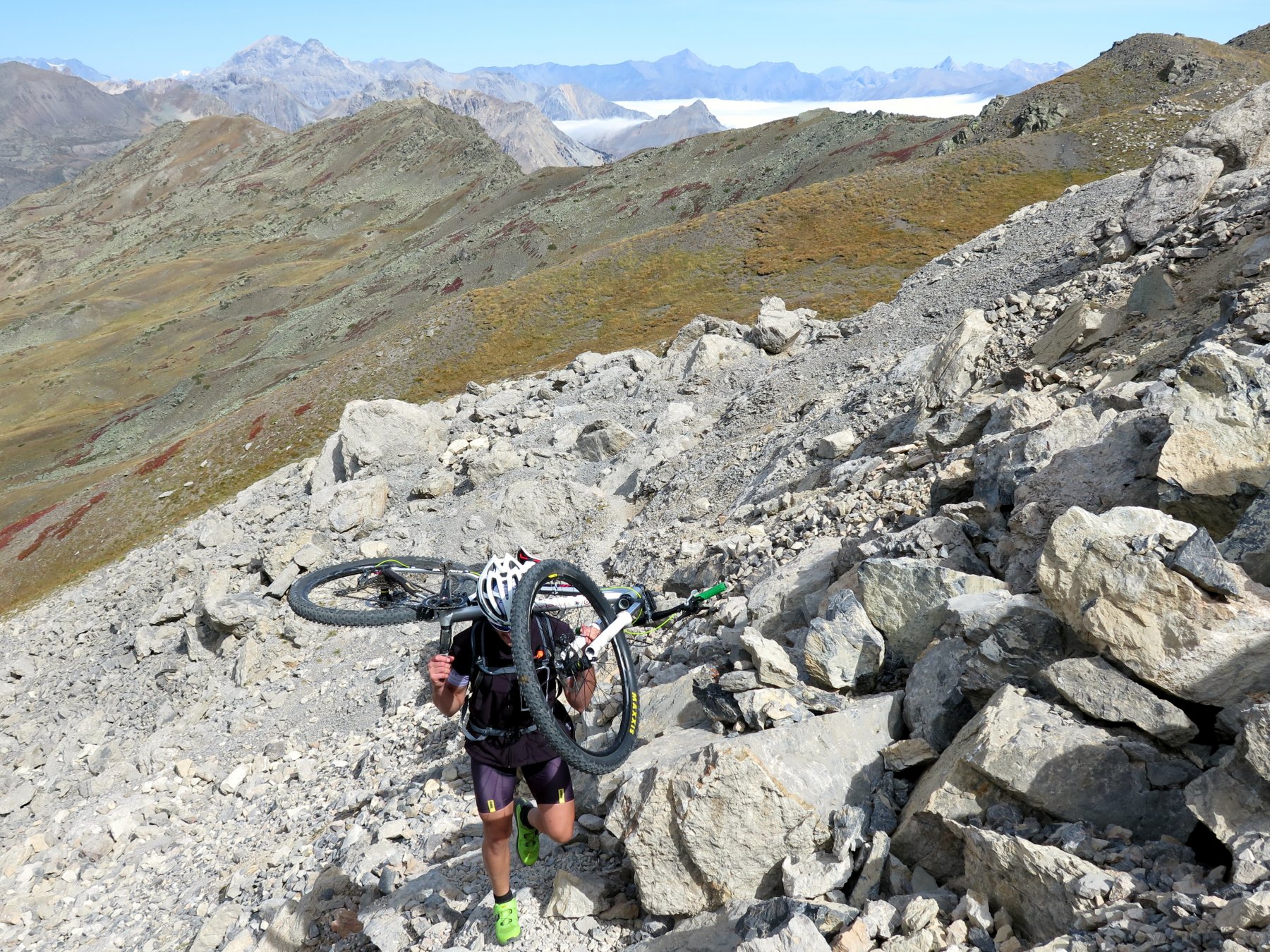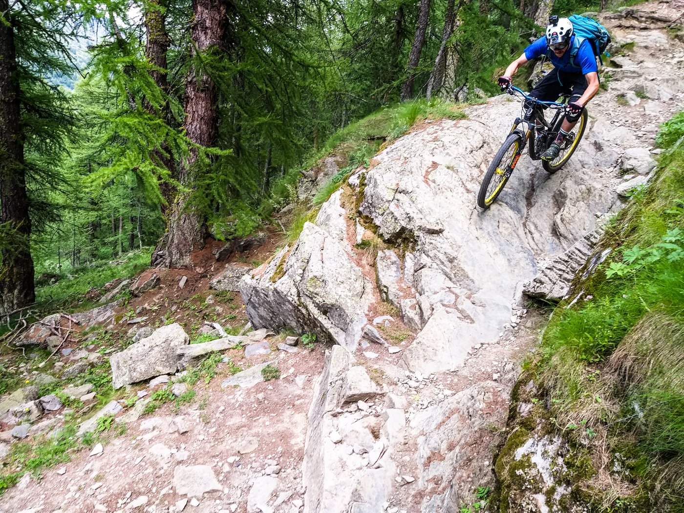 scendere alcuni metri fino al bivio sotto la vetta e seguire le indicazioni x il Col de Buffère: inizia ora un bellissimo single-track con difficoltà media di S2 e brevi tratti S3 che ci porterà fino al colle a quota 2427.