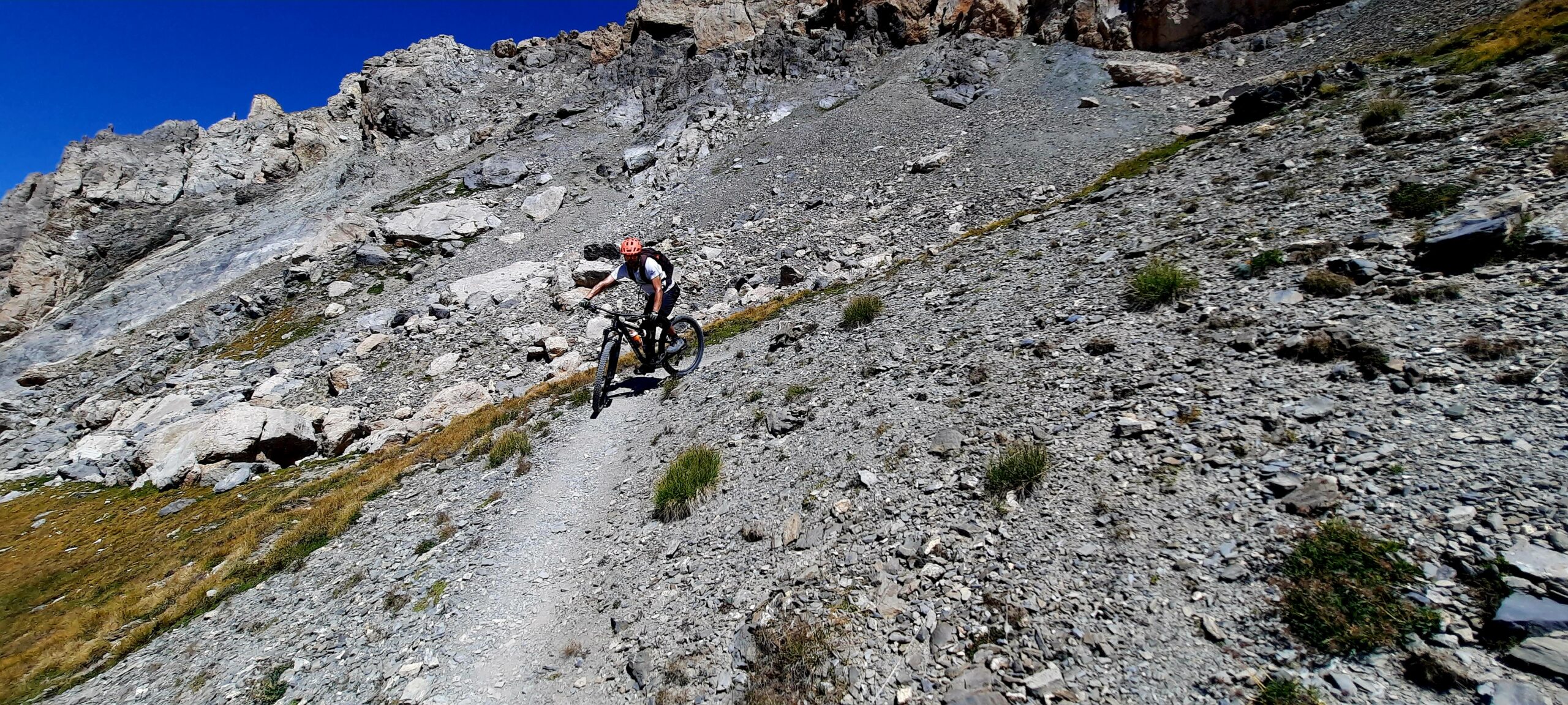 Dal colle seguire il GR57 verso il Ref. de Buffère dapprima con un lungo tratto molto tecnico e roccioso (S3) poi più scorrevole (S1-2).