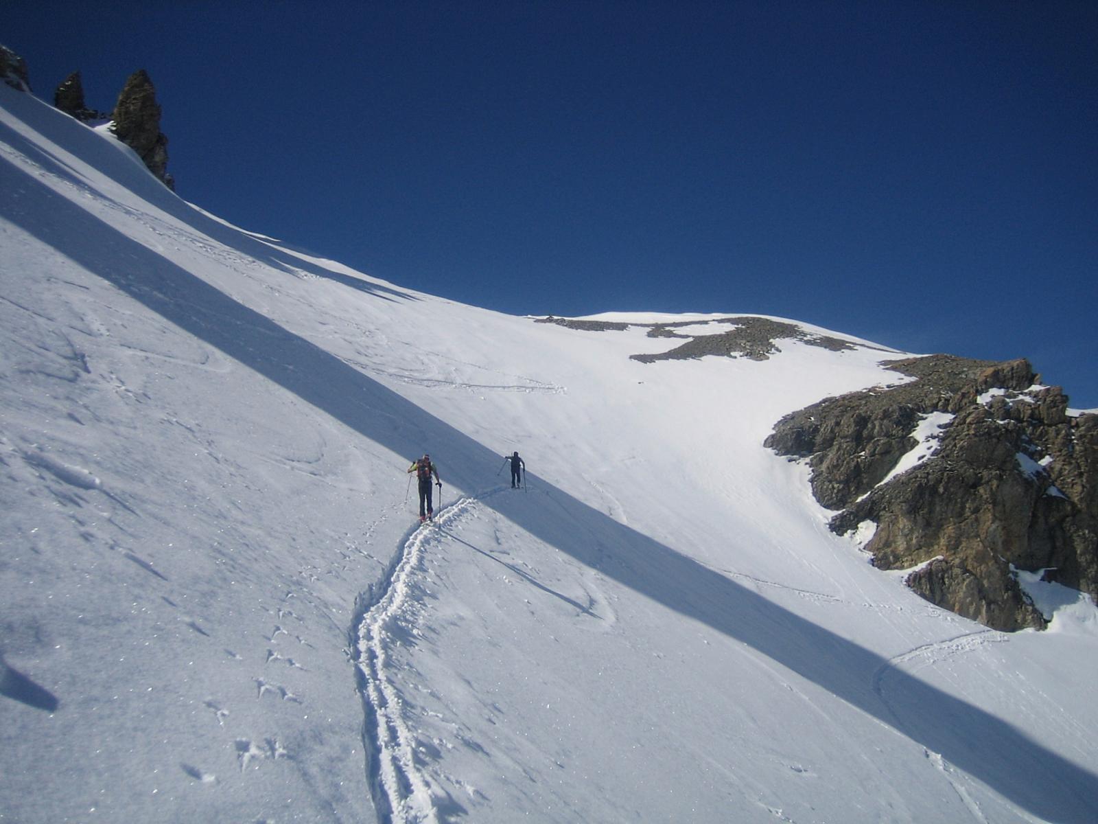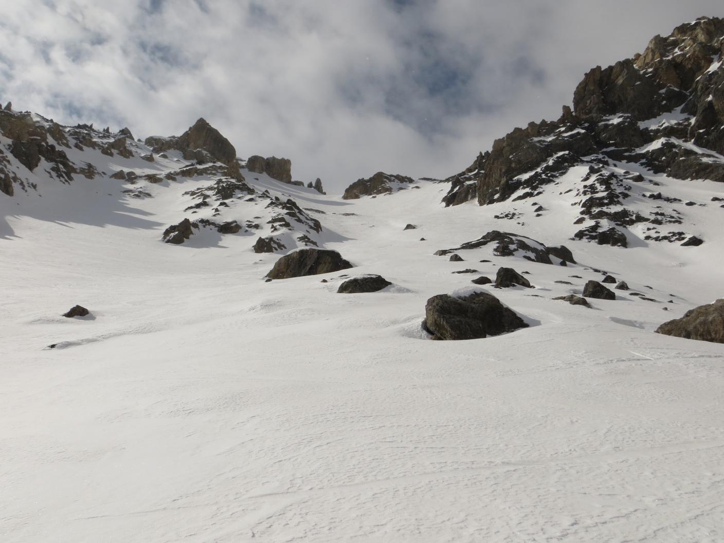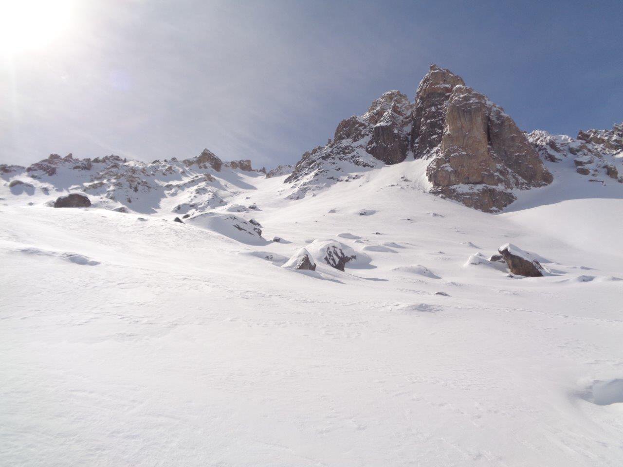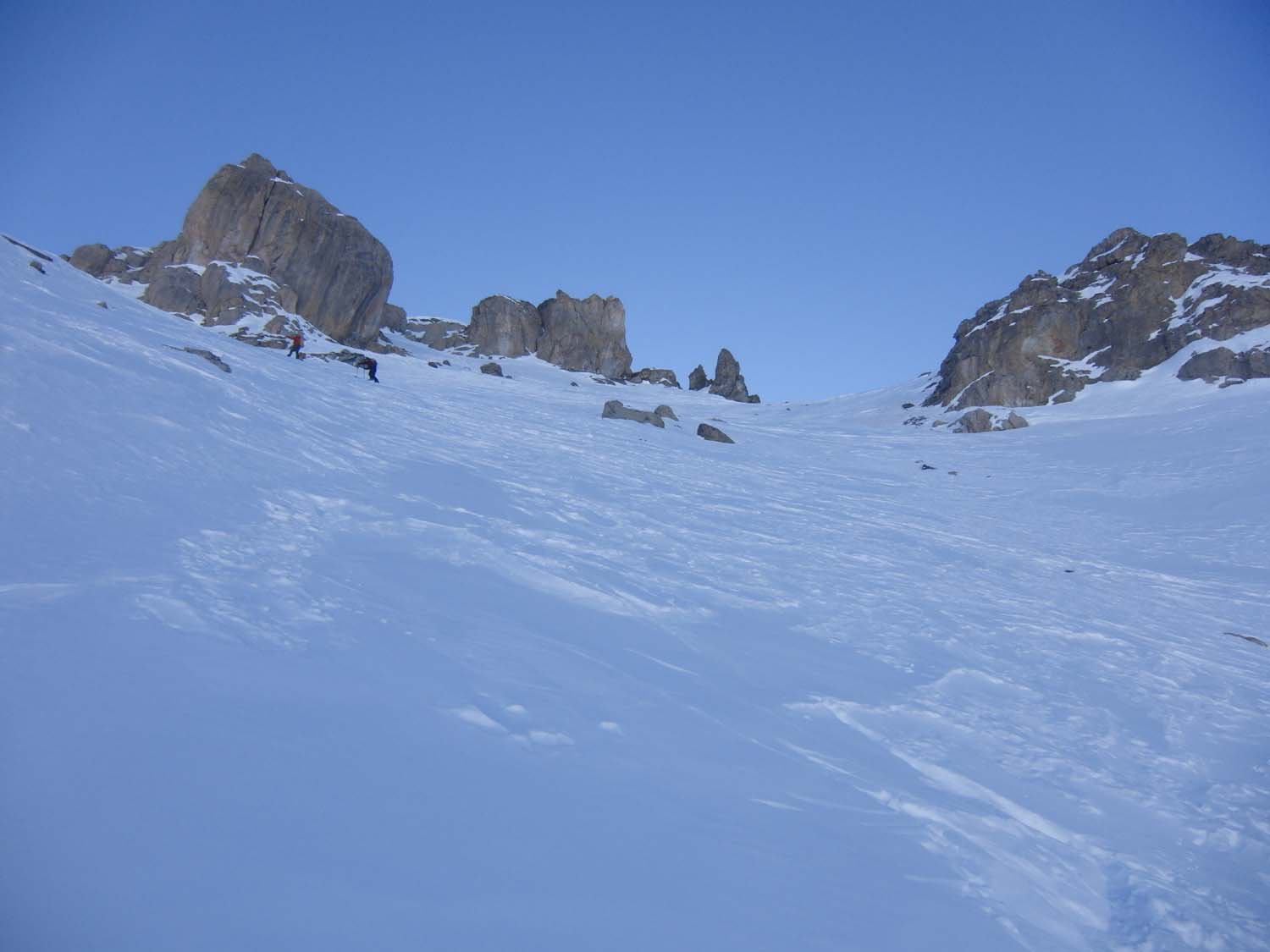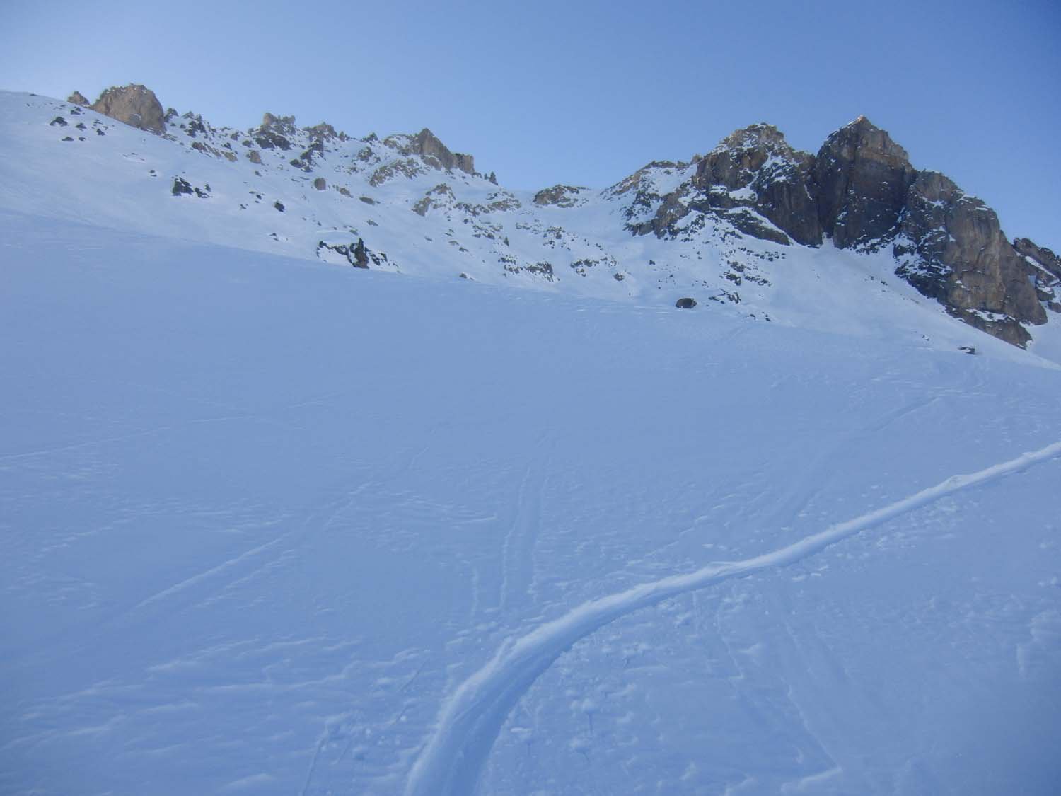 Lasciato il Pont du Rately seguire il percorso fino al rifugio in bosco ripido. Superato il rifugio pendii aperti e dolci che portano al Col de Buffere. Intorno a quota 2150-2200 dirigersi verso la base del canalone nord.