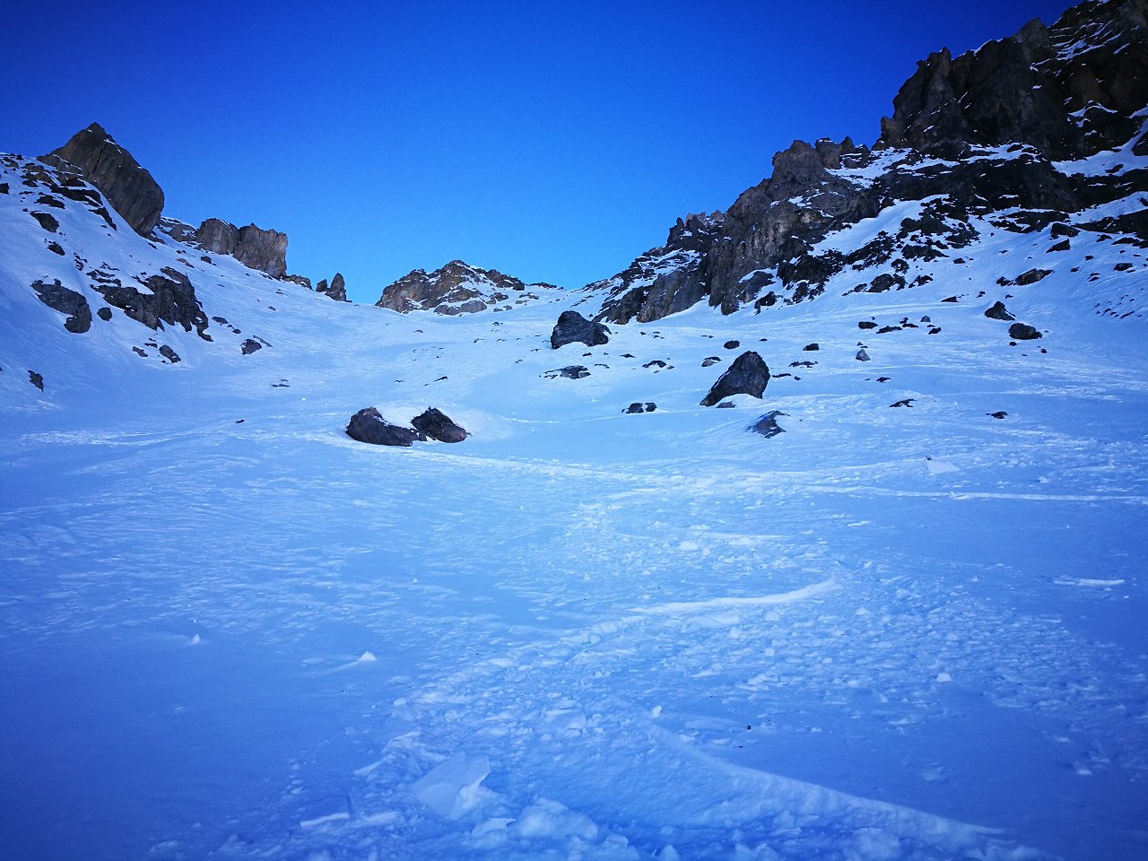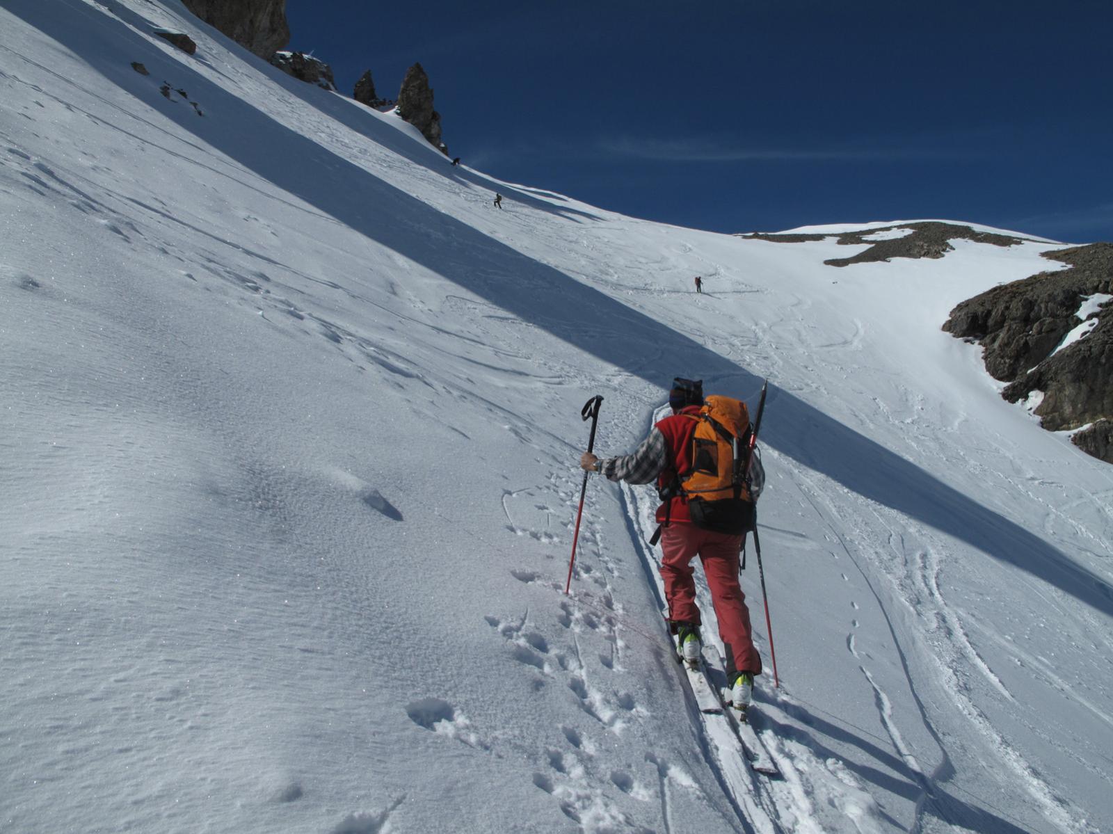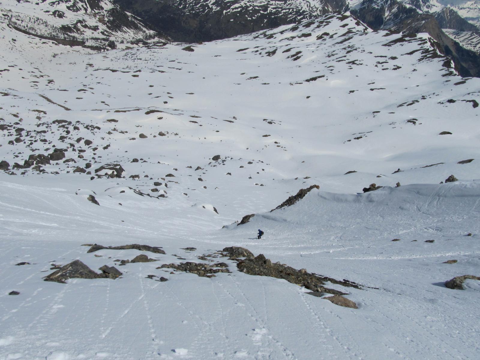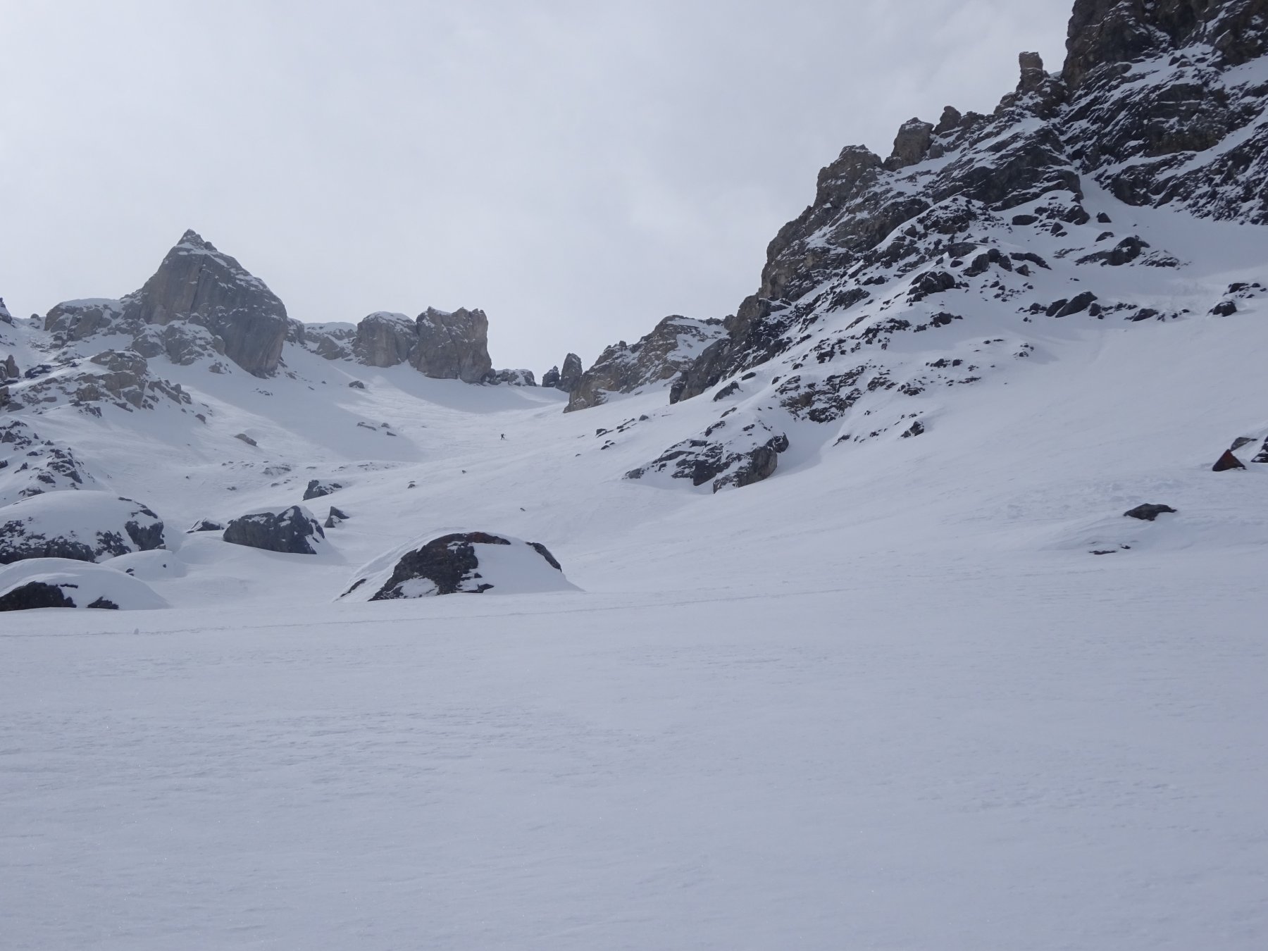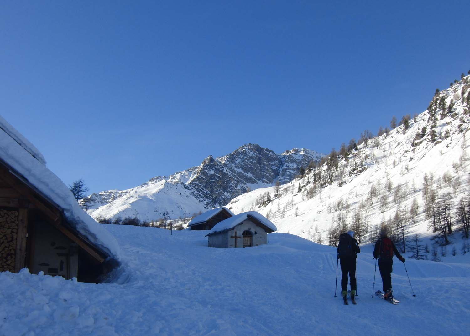 Lasciato il Pont du Rately seguire il percorso fino al rifugio in bosco ripido. Superato il rifugio pendii aperti e dolci che portano al Col de Buffere. Intorno a quota 2150-2200 dirigersi verso la base del canalone nord.