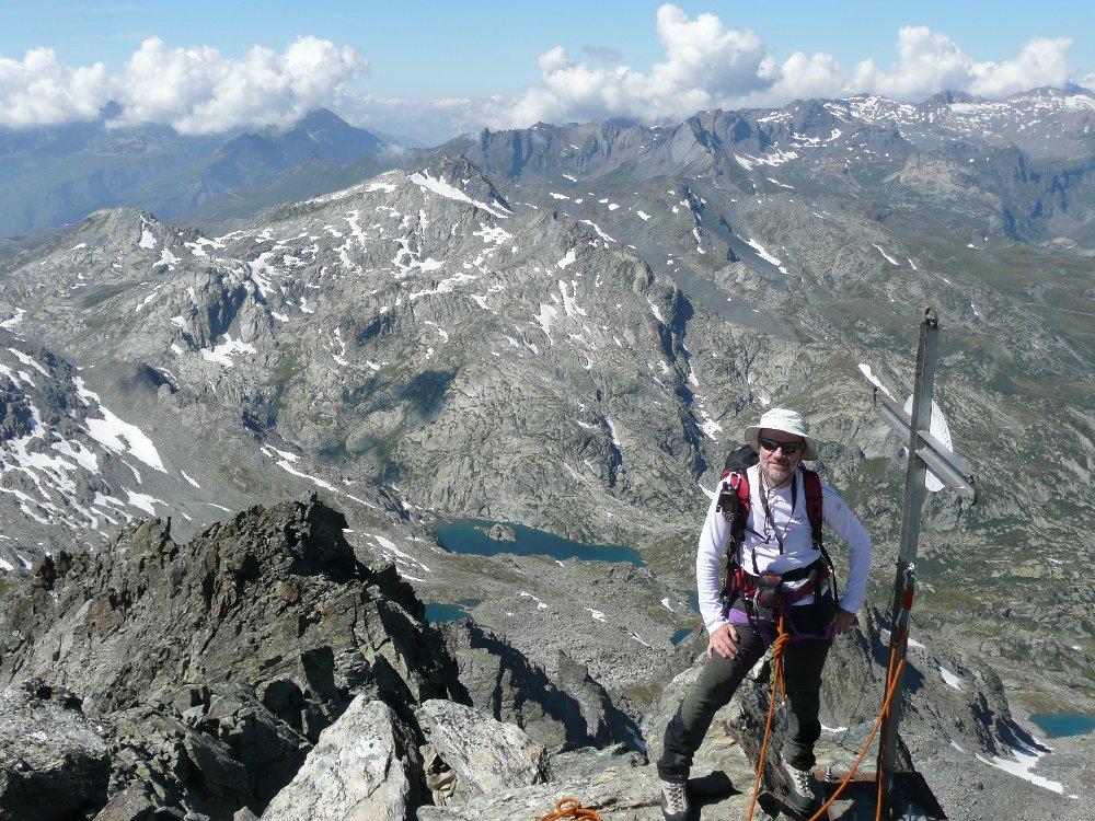 Saputo che il ponte tibetano non è agibile, abbiamo deciso di salire senza passare dal rifugio, aggirando i laghi sulla destra e risalendo a lato del torrente nel salto tra il lago del Rutor ed i laghetti di fusione che stanno sopra, presenti ometti e bolli gialli. Superato un tratto di pietraia poco ripida sottostante l’enorme ghiacciaio del Rutor, abbiamo infiliato il canalone di sfasciumi e rocce montonate sulla destra, che conduce al piccolo ghiacciaio, pendenza moderata ed assenza di crepacci, si risale sulla sinistra per evitare alcuni tratti di ghiaccio vivo, ci siamo legati durante la discesa, rivolto a sud est quindi meglio non salire troppo tardi. Poco prima del colletto abbiamo mollato picca e ramponi e puntato alla cima superando il tratto iniziale di una ventina di metri con la corda, sfruttando una sosta in loco, passi di II^ esposti sul versante francese, poi si prosegue per tracce ed ometti, si raggiunge la facile cresta rocciosa e da qui la croce di vetta. Notevole il salto della parete nord con vista sul gruppo del Bianco. Panorama grandioso sui ghiacciai del Rutor, su numerosi laghi glaciali, cime e valli che rende questa gita una delle migliori che ho fatto da quando vado in montagna. Il rischio maggiore: quello di diventare troppo golosi e non riuscire più ad apprezzare paesaggi meno maestosi. Pendenze mai sostenute, continue o impegnative ma intervallate da lunghi spostamenti in piano e brevi risalite per aggirare laghi, valloni, canaloni, con ponti sui torrenti, rendono lo sviluppo chilometrico notevole. Comprese le numerose pause fotografiche, preparazione, sicurezza e ricerca del percorso migliore, abbiamo impiegato dal parcheggio circa 6 ore per arrivare in cima. Con rfausone, autentico segugio per individuare mete spettacolari. Giornata limpida e mite. Numerose persone nei pressi dei laghi ma incontrato solo 2 che scendevano dalla cima. Un saluto agli amici Corrado e Stefano incontrati casualmente alla partenza, loro diretti al Paramont.