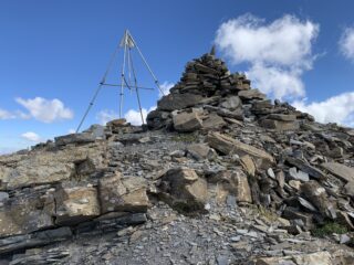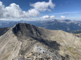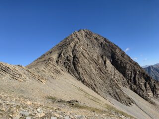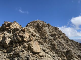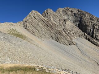 Dal colle inizia un’altra gita, abbiamo seguito le indicazioni di chi ci ha preceduto ed evitato la cengia salendo nel pendio canale tra gradini e sfasciumi: si tratta di salire ben oltre 100m di dislivello con la massima attenzione usando le mani in maniera quasi continuativa e con una discreta verticalità.