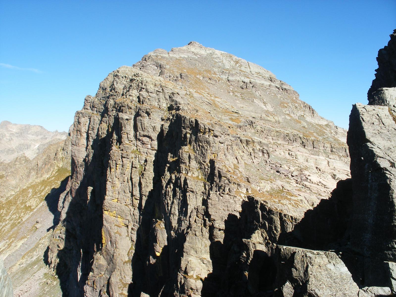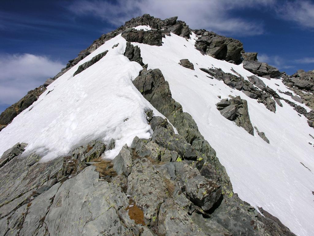 Giunti in corrispondenza dello spartiacque, si traversa verso destra (ometti) alla base dell’evidente salto di rocce, fino a giungere all’intaglio detritico che permette di superarlo. Nella parte superiore si seguono le tracce tra roccette e detriti, pervenendo alla vetta, sempre ben visibile (2935 m, 2h 30′ dal rifugio).