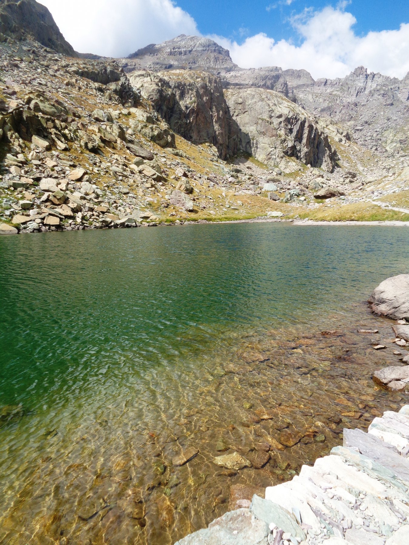 Si perviene alla conca del Lac Inf. des Conques, lo si aggira verso destra superando un breve passaggio su roccia e si prosegue salendo la balza settentrionale lungo un vago canale di roccioni ed erba, per giungere in corrispondenza del Lac Sup. des Conques.