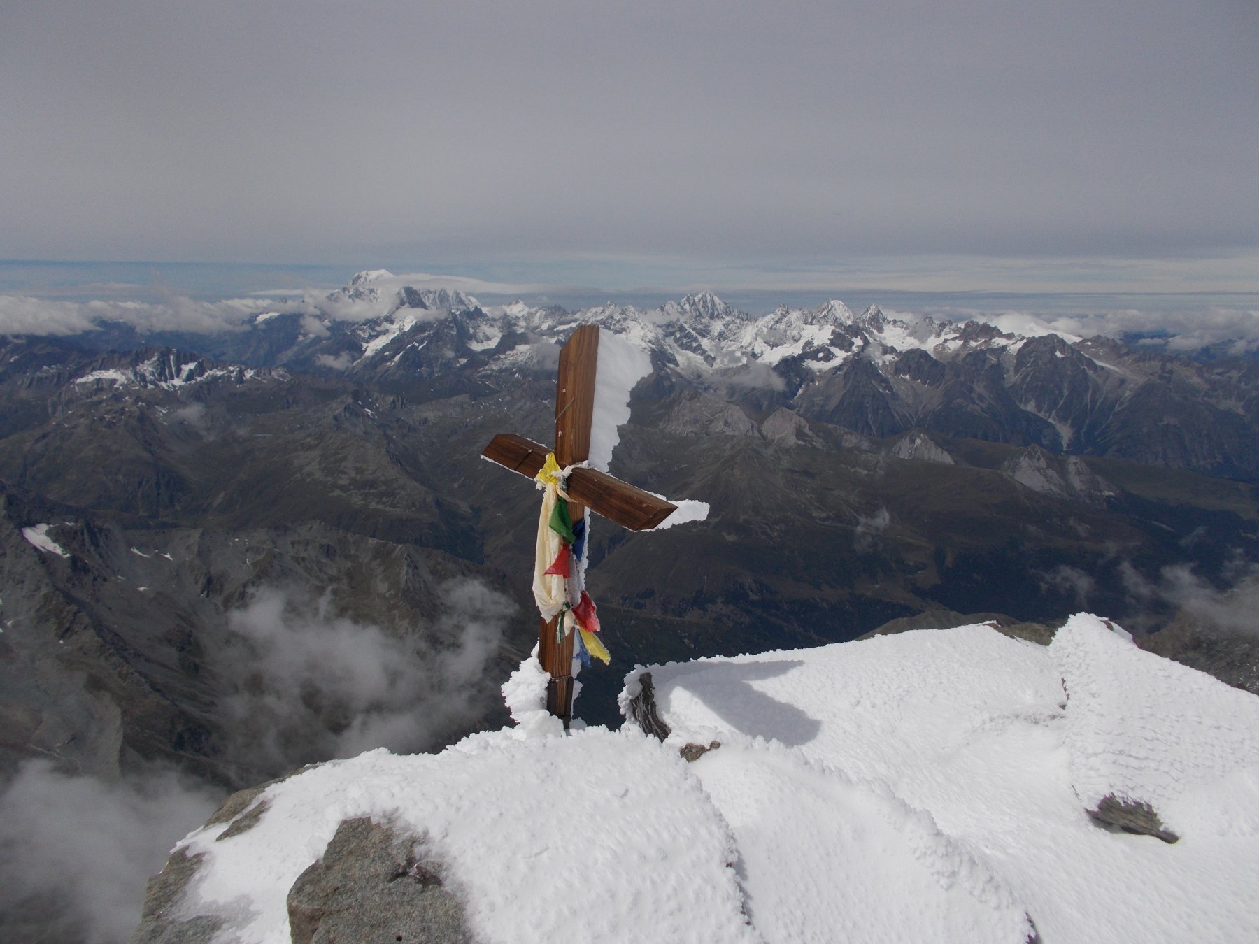 Sicuramente condizioni migliori nel 98 quando la salii la prima volta che adesso..allora pulita, oggi in completa veste invernale. Alla cresta salita in condizioni proibitive, segue il flagello del vento che non molla un istante di soffiare gelido per l’intero corso della traversata fino alla Croissant. Impensabile scendere al Tzesette (a parte ormai gia’ salito tempo addietro dalla Panossiere) per vento a radunare nubi, che qui a queste altezze e’ nebbia che non ti fa capire niente di dove stai andando. Una fortuita schiarita ci fa tornare su il morale e persino metterci in condizioni cosi da correggere il tiro (stavamo tornando in leggera risalita al Valsorey), per scendere su terreno a noi sconosciuto in mezzo ai seracchi a meta’ tra la vertiginosa parete nord ovest del Valsorey e il Corridor. Grazie alla recente nevicata il ghiaccio e’ rimasto per lo piu’ coperto agevolandoci in tal modo non poco la discesa che si e’ dovuta fare comunque in sicurezza date le pendenze notevoli della parete. Dedotto da foto che, il socio prese da internet mi ha mostrato, si suppone che quello da noi sceso fosse il Couloir de Gardien. Eterna complessa (anche se tutta ben spittata) e difficoltosa la salita (tutta in ramponi), cosi come la discesa, e la successiva inevitabile risalita al col Meitin a reperire gli ometti e essere giu’ al rifugio ormai al calare della notte..Quattro le cordate che han tentato il Combin oggi tre straniere, di cui una formata da alpinisti Cechi che han rinunciato all’altezza del secondo salto, e le altre ancor prima. Solo noi Italiani a tener duro fino all’ultimo.