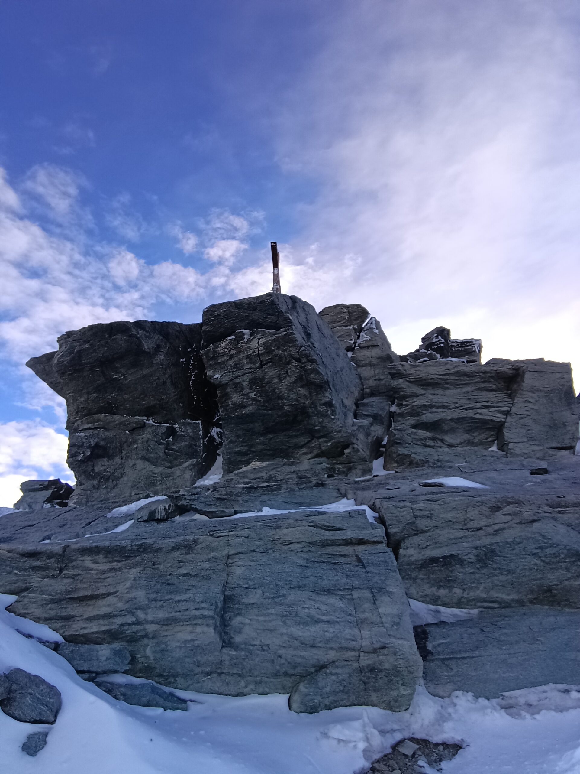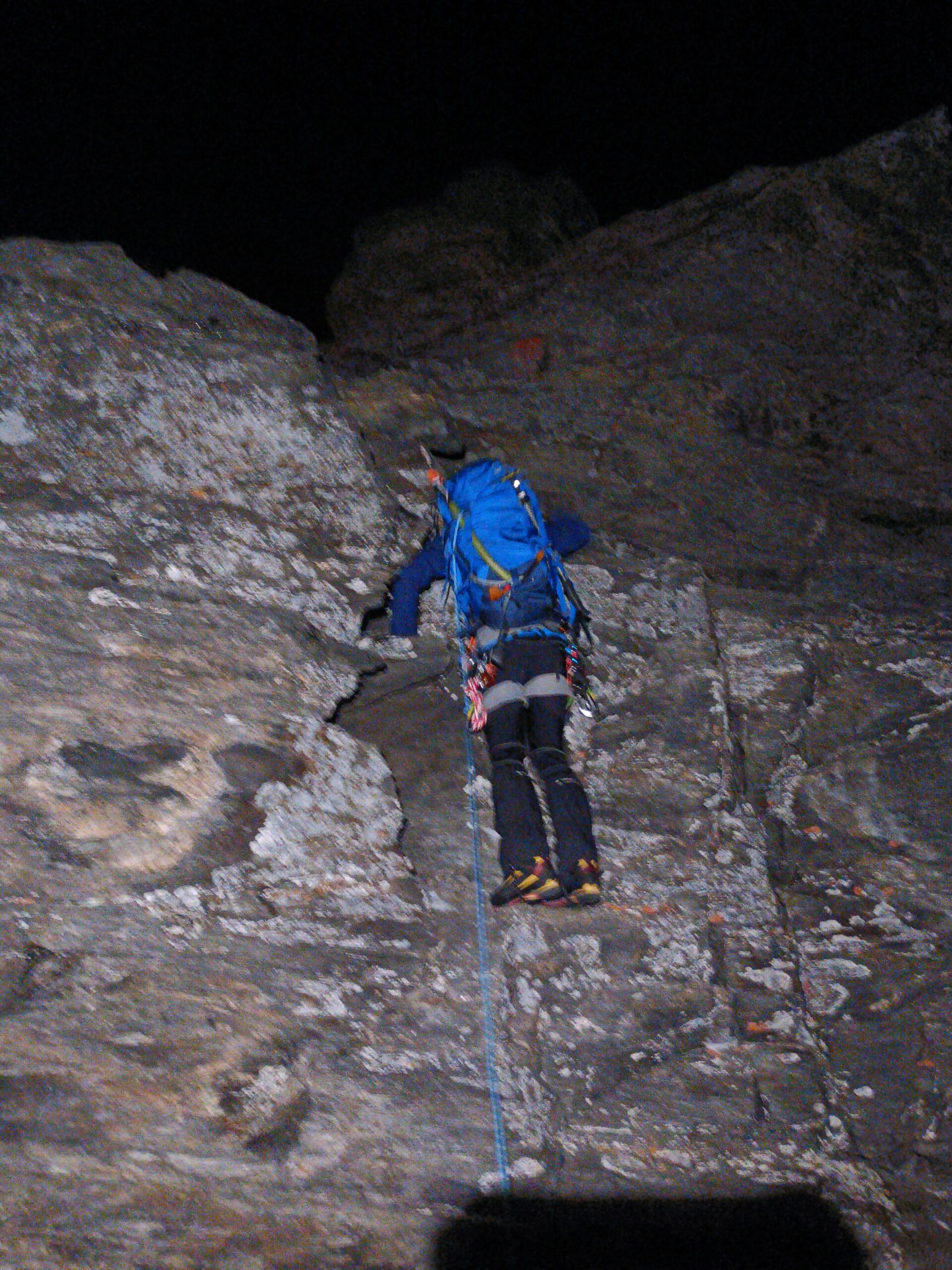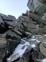 Colazione alle 3, partenza 3:30 e arrivo in vetta in poco meno di 4h. Si sale prima seguendo ometti fino ad arrivare all’attacco della via (qualche tratto su neve dura, ramponi non necessari). Cresta pulita nonostante la spolverata del giorno precedente, qualche passaggio esposto ma nel complesso difficoltà davvero contenute (max III+). Qualche chiodo lungo la via, friends mai utilizzati. Noi abbiamo messo i ramponi direttamente in vetta, qualcuno li ha messi nell’ultimo tratto, da valutare soggettivamente.