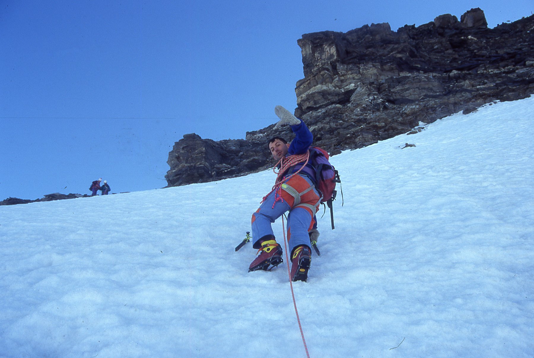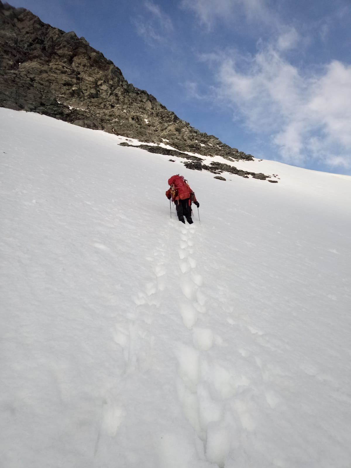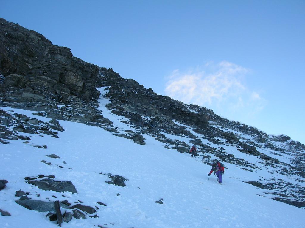 A questo punto si comincia a salire la parete Sud vera e propria (c.d. spalla Isler). Si tratta di una parete molto ampia che si sale preferibilmente verso sinistra, la via non è mai obbligata ma spesso non è del tutto evidente, per cui l’unica indicazione consiste nel rimanere sul bordo della costola rocciosa a sx (pendii di sfasciumi sino a 45° e alcuni passi di II nel tratto finale).