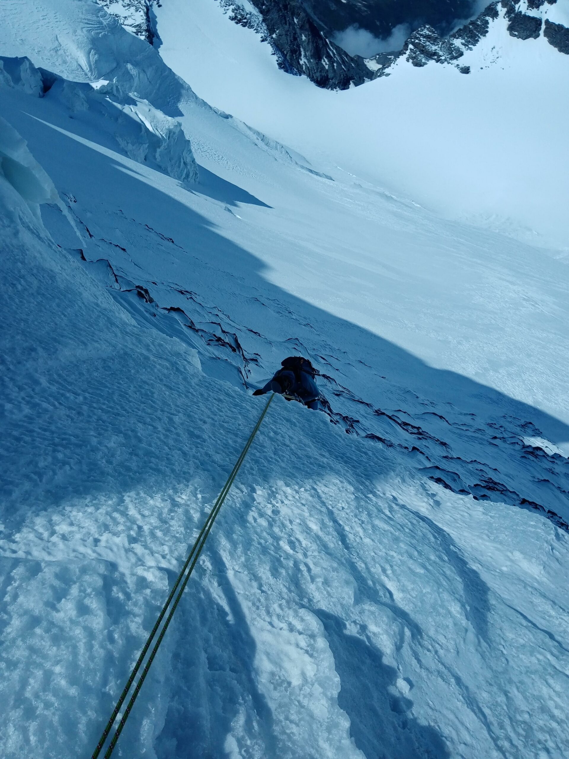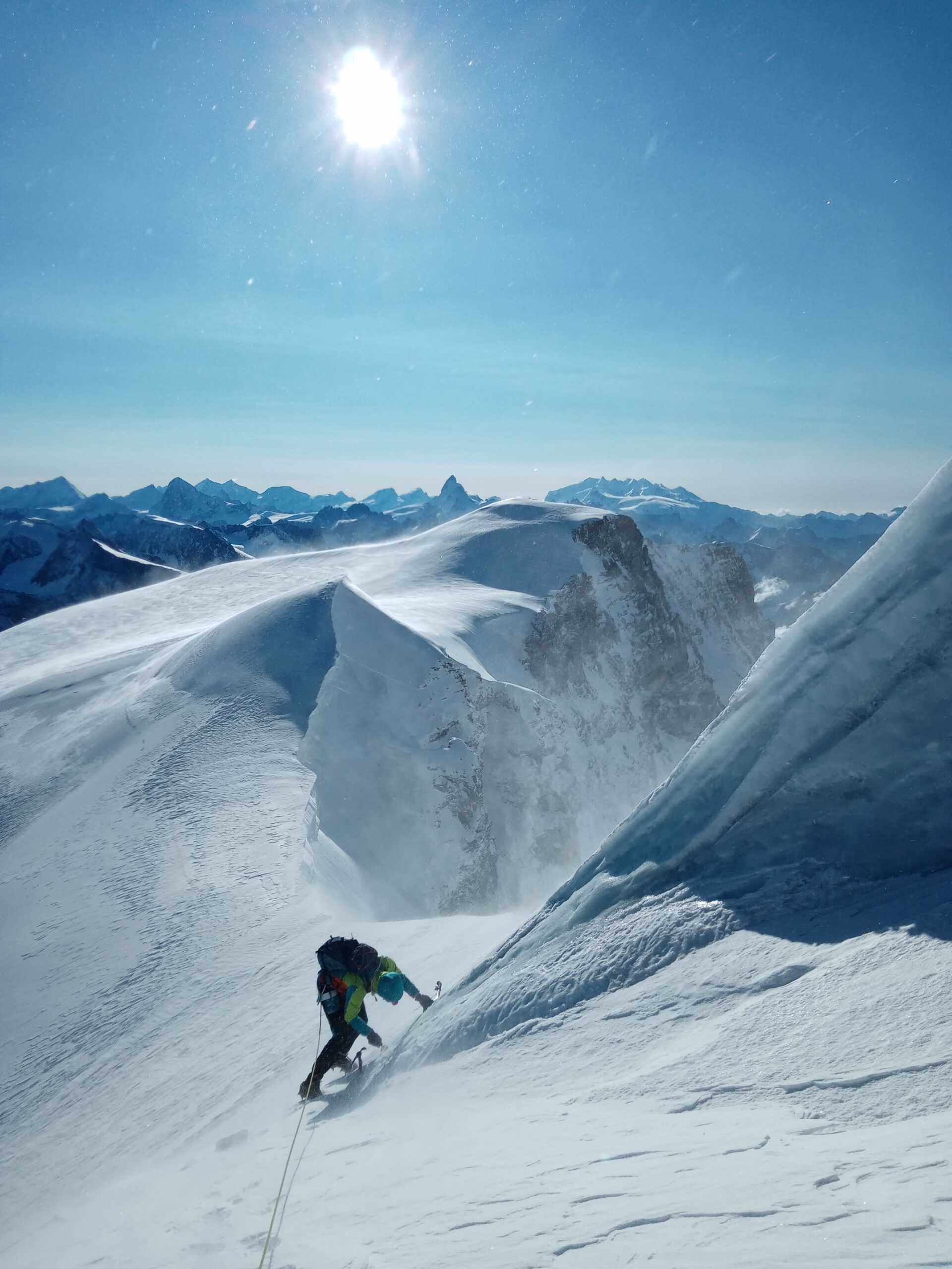Proseguire sul filo dell’estetica cresta, risalire in breve alla simpatica Aiguille du Croissant ( mt.4243), poi discesa più ripida fino a quota 4170 dove si lascia la cresta per scendere a destra il ripido “Mur de la Cote” (delicato con ghiaccio).In meno di 30 minuti si arriva alla pianeggiante sommità del Combin de Tsessette( mt 4140)