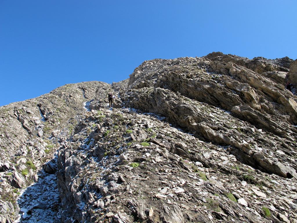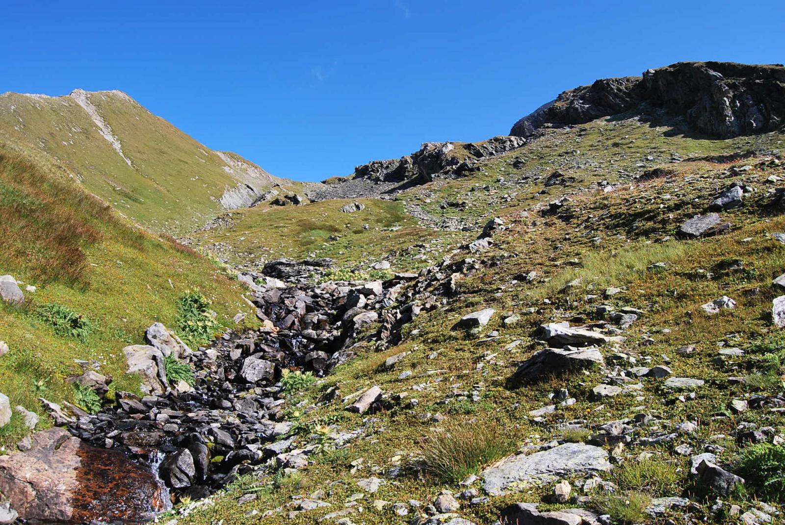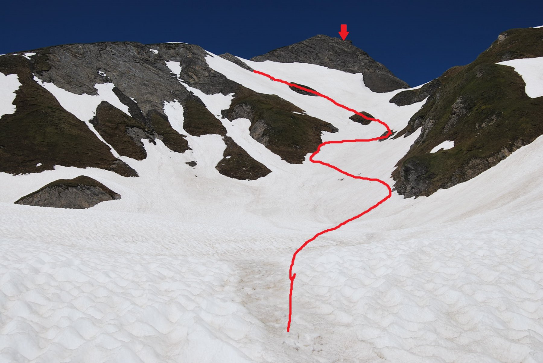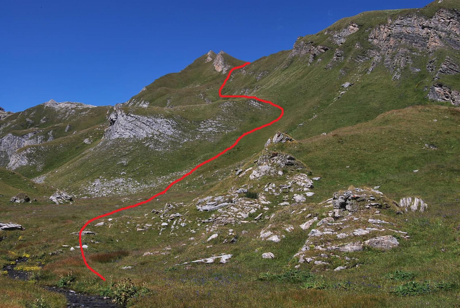 b. Dal lago, piegando verso destra, si guadagna la cresta erbosa e rocciosa che punta direttamente verso la vetta; seguirla attraversando un paio di tratti detritici, mantenersi al di sotto della cresta spartiacque ed arrivare direttamente in vetta.