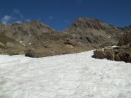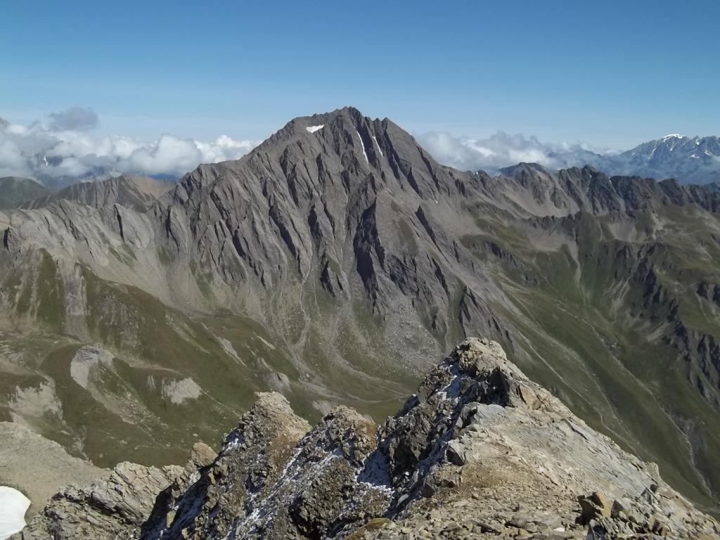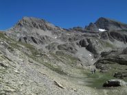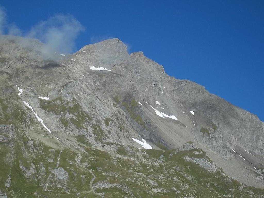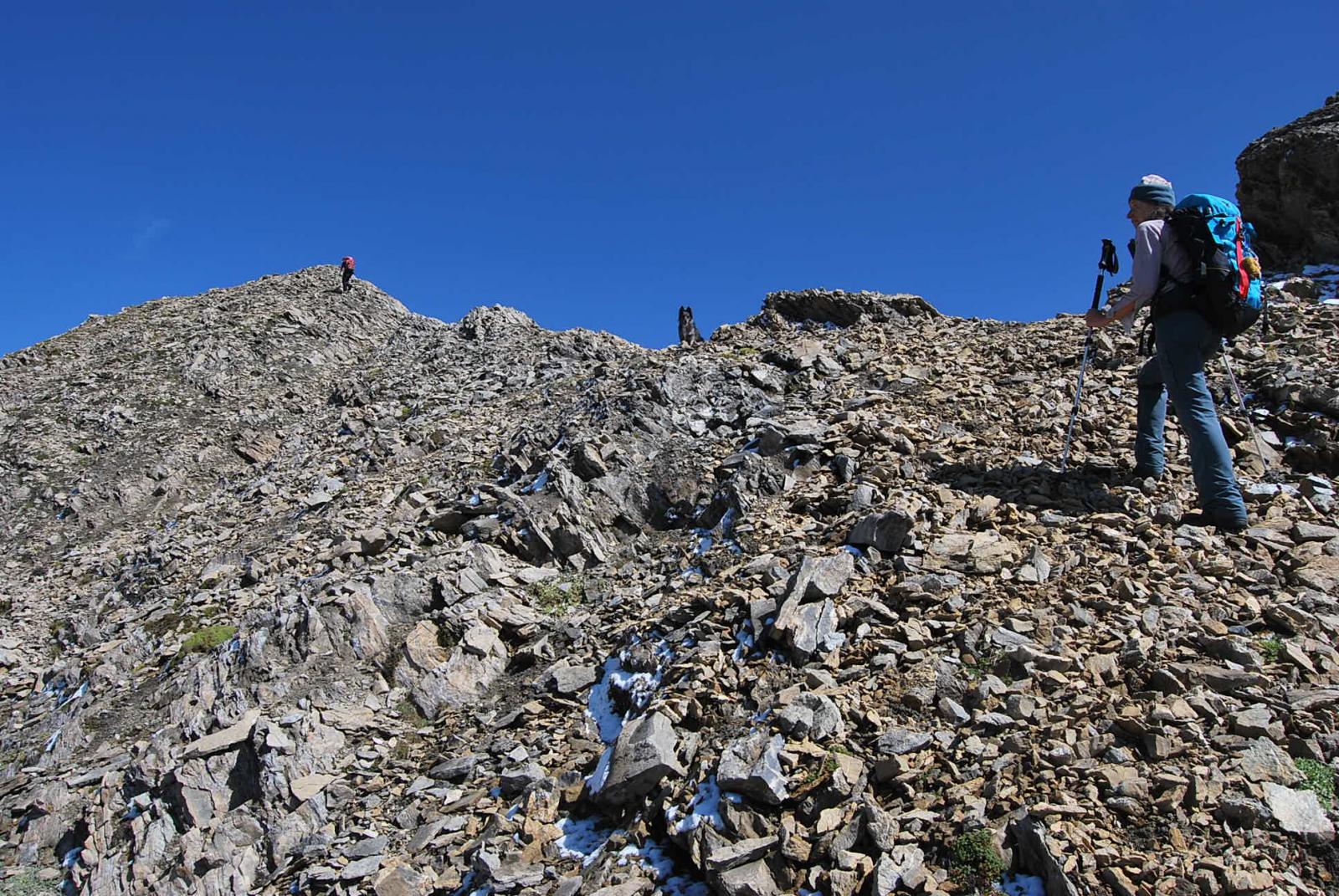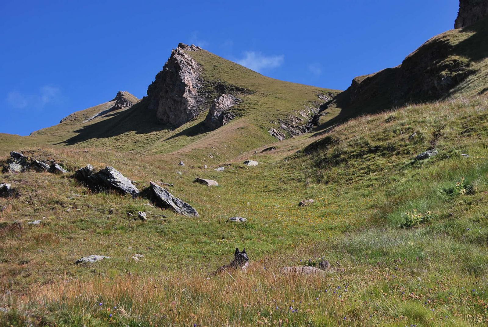b. Dal lago, piegando verso destra, si guadagna la cresta erbosa e rocciosa che punta direttamente verso la vetta; seguirla attraversando un paio di tratti detritici, mantenersi al di sotto della cresta spartiacque ed arrivare direttamente in vetta.