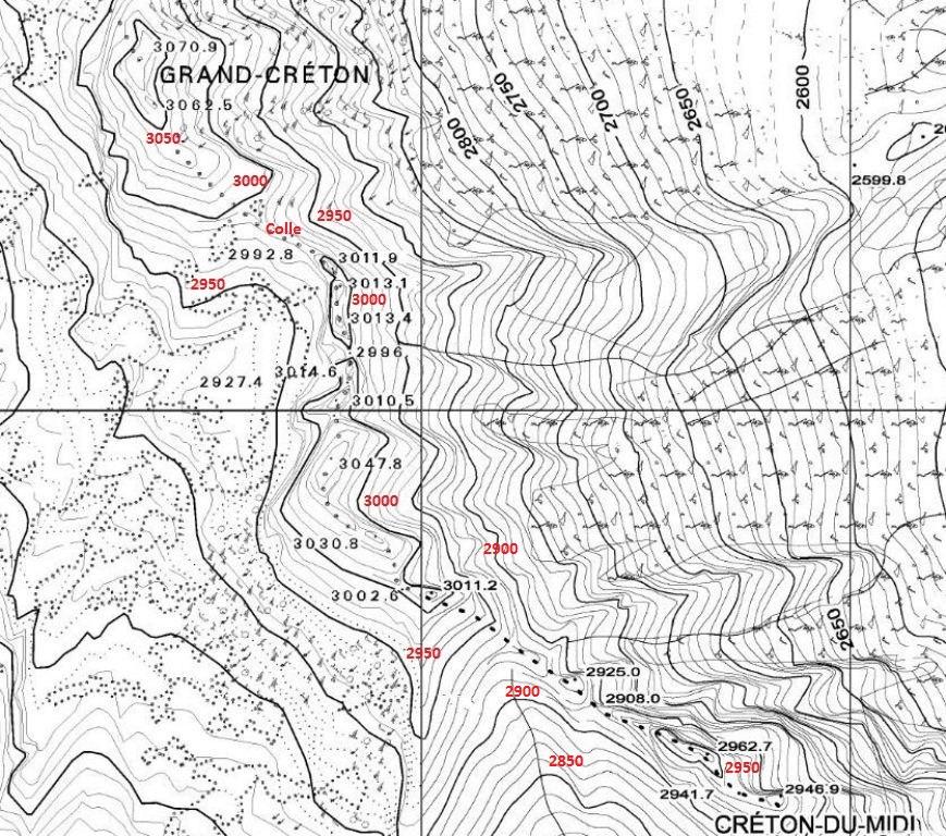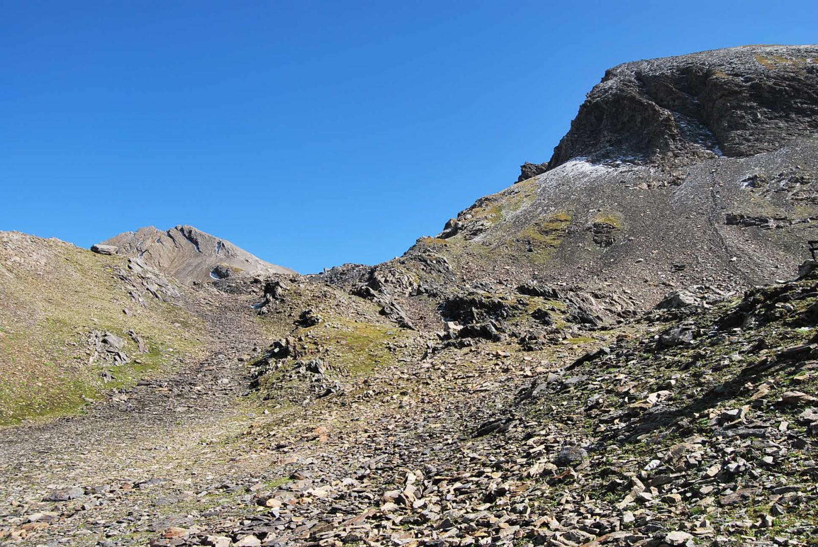a. Risalire il pendio di sfasciumi cercando di mantenersi sulle spalle rocciose meno franose, poi obliquare verso sinistra e puntare alla depressione sotto la sinistra del Gd. Creton; qui si imbocca il ripido canalino di sfasciumi franosi che va faticosamente risalito fino alle roccette dalle quali si sbarca poi sul pendio proprio sotto la vetta;