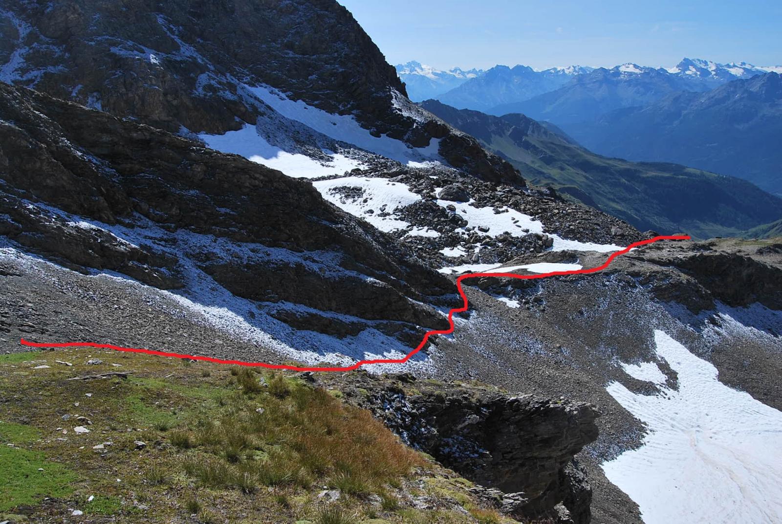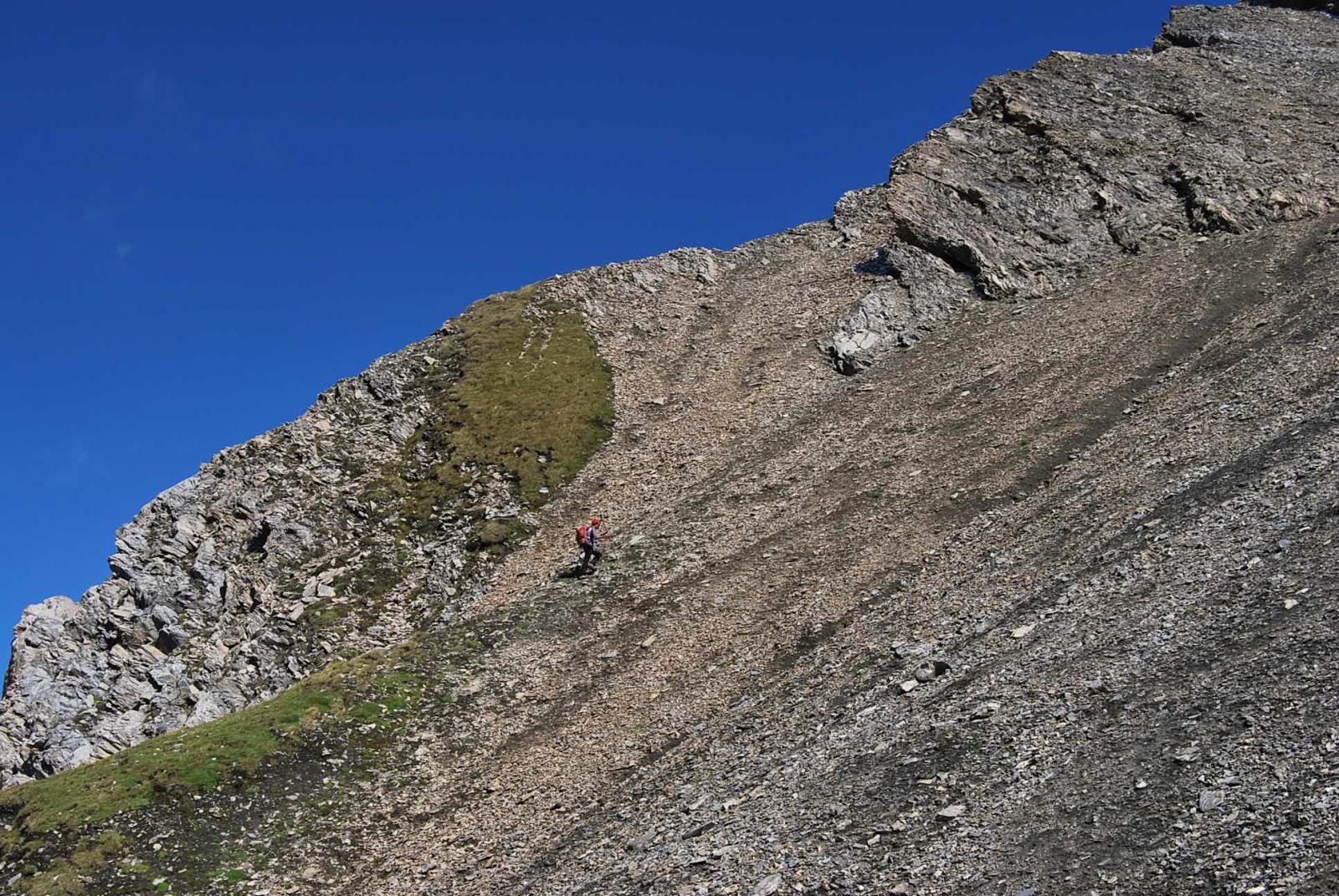 L’itinerario descritto è faticoso, non pericoloso ma con un alto rischio di caduta sassi. Pertanto non è particolarmente consigliato, meglio salire direttamente da Bonalex, prima su pendii erbosi e poi seguendo la cresta.