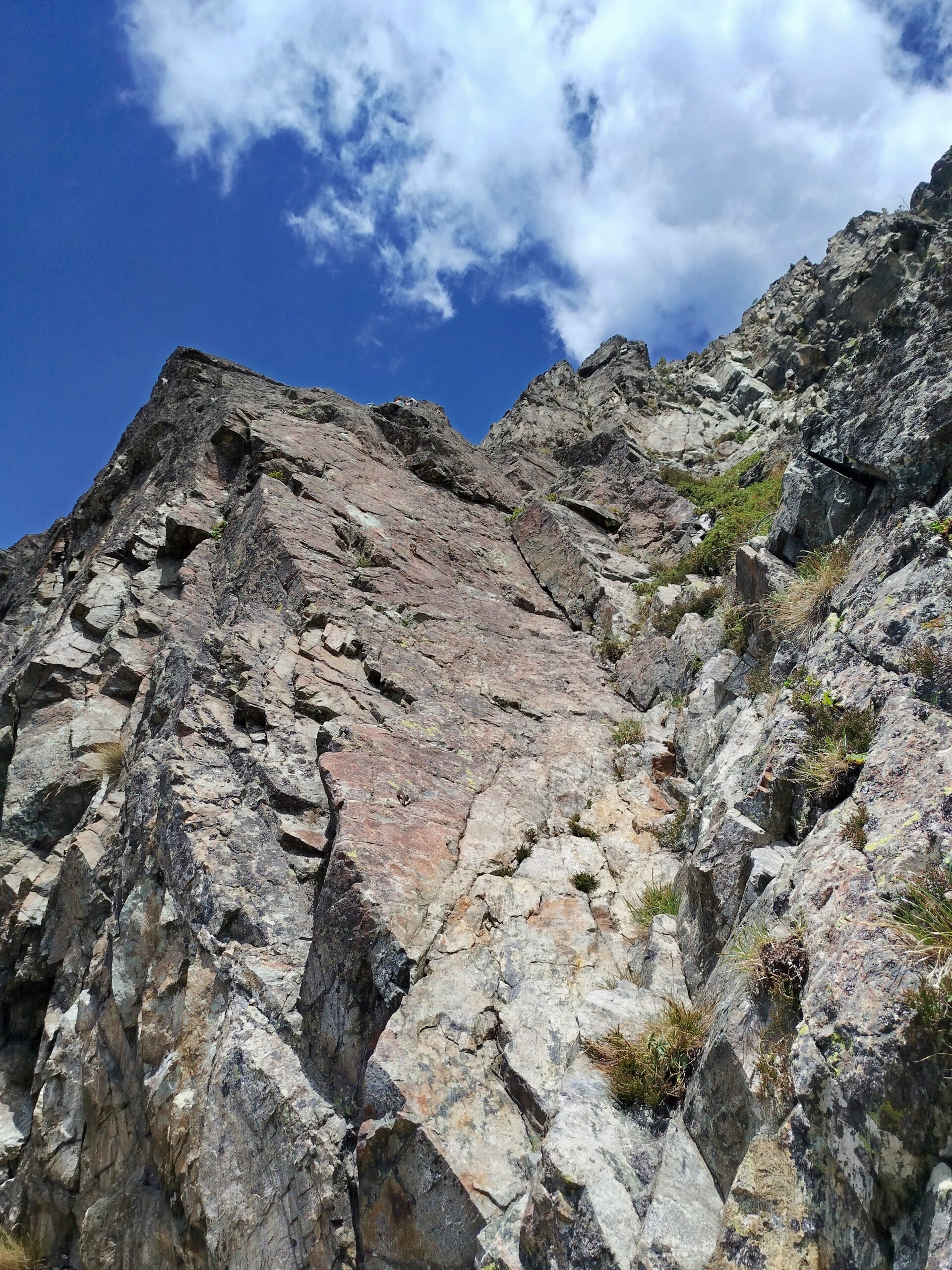 Si scende su terreno facile e in maniera abbastanza evidente in direzione dello scudo di roccia della cima vera e propria, attraversando il pendio detritico su cui passa la via normale (possibilità di ritirata). Su questa parete sono presenti 3 vie: a sx il seguito della via “Max”, in centro la via “Hal orange ta chambre” e a dx, in corrispondeza di un grosso masso, il seguito di “Gaspard”.