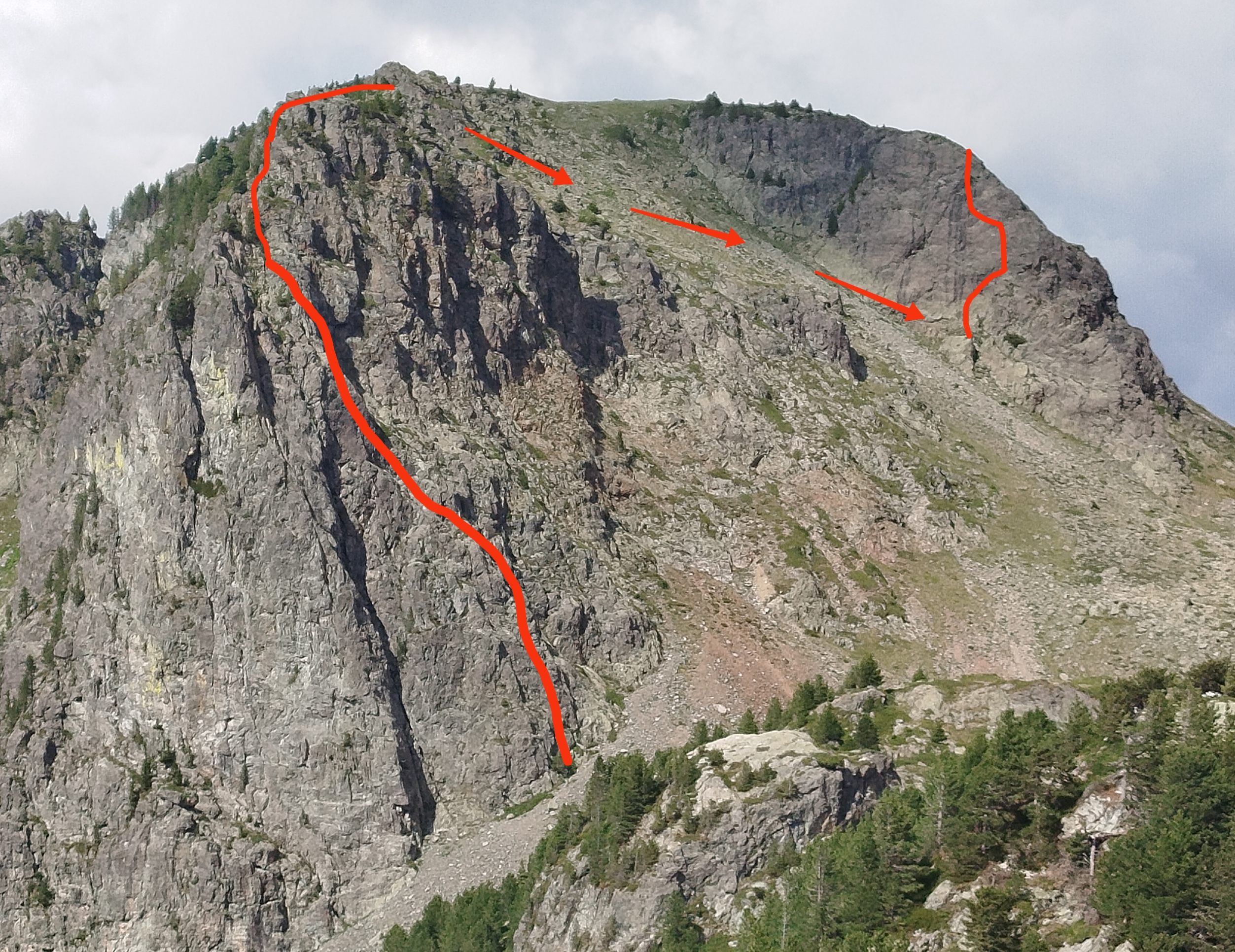 Le prime 5 lunghezze salgono un vago pilastro, per poi raggiungere la facile cresta che si percorre fino ad un pendio detritico che si attraversa per attaccare la parte superiore, composta da due lunghezze che salgono un bel muro ripido, contrafforte della cima.