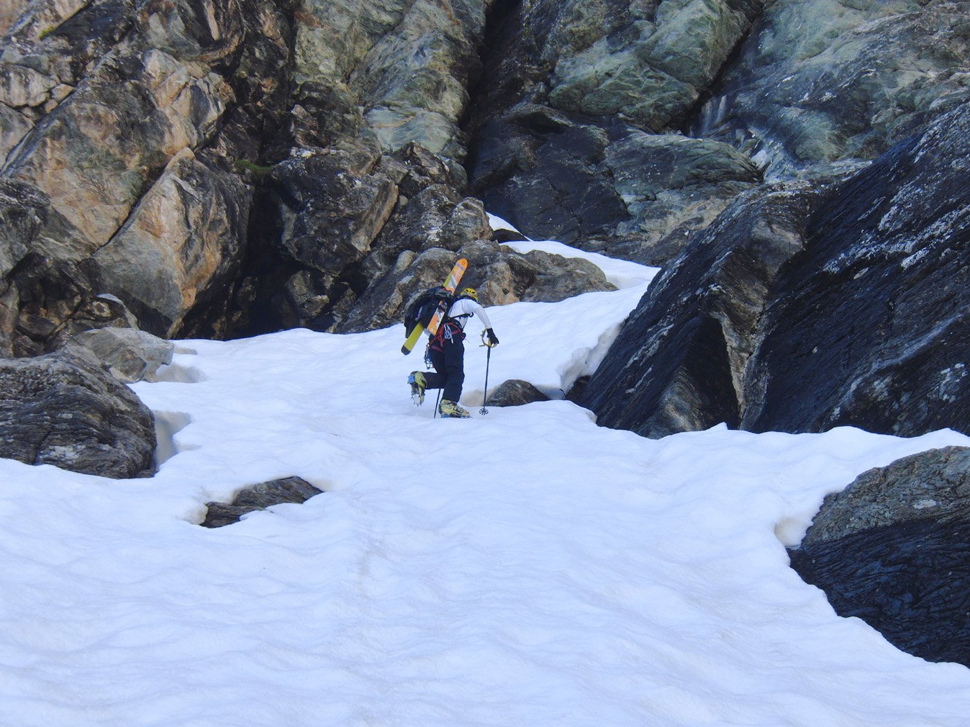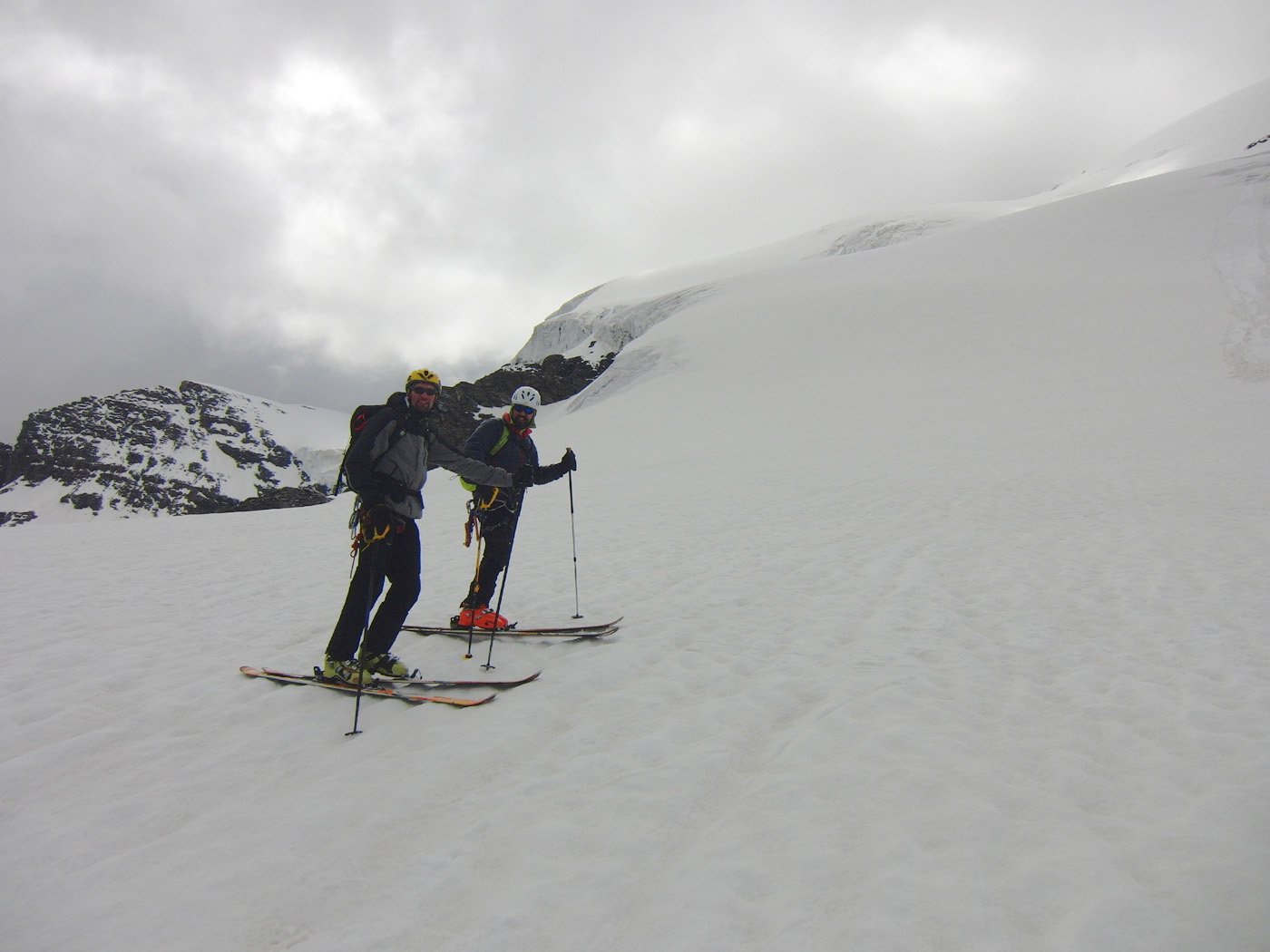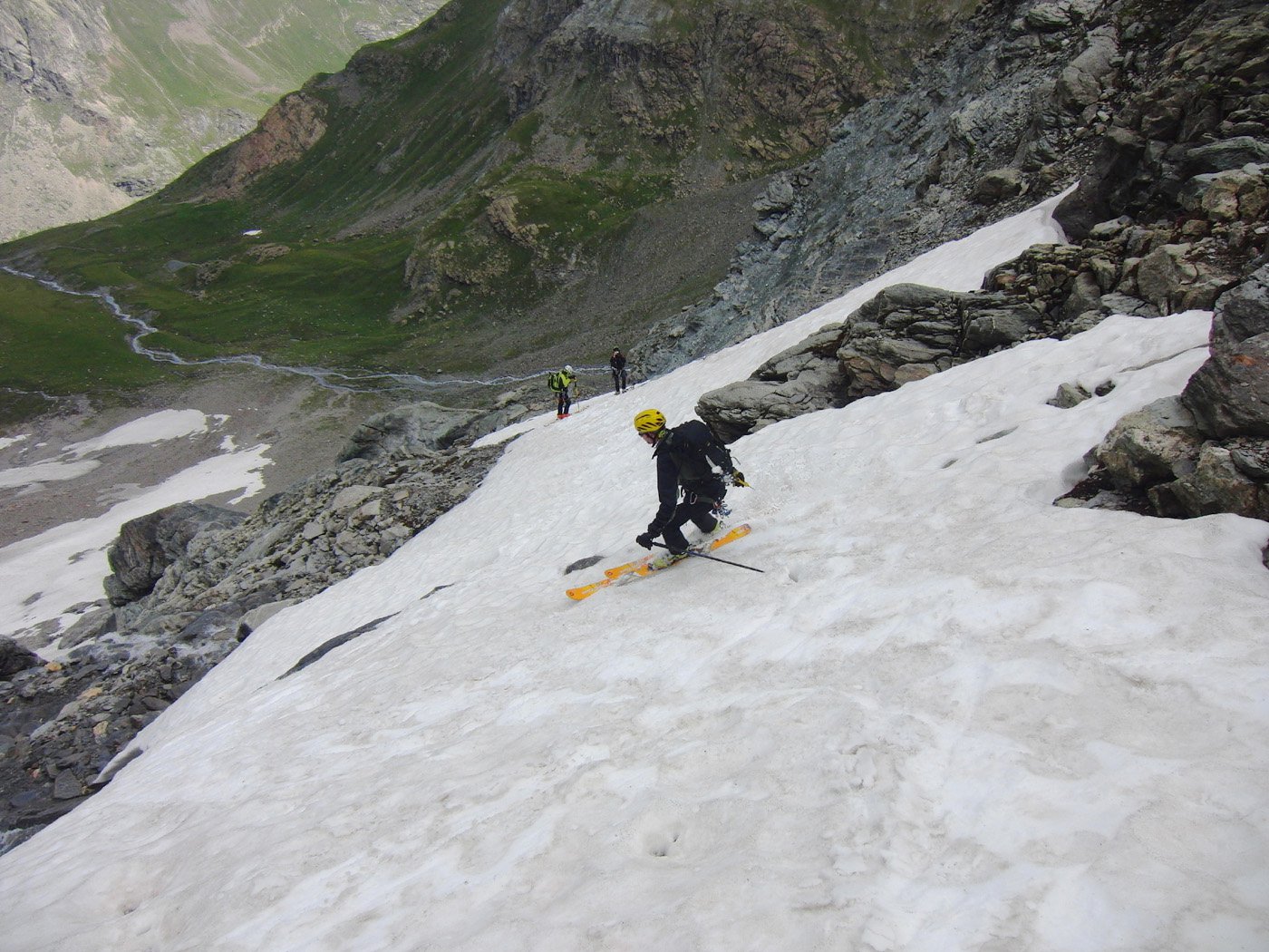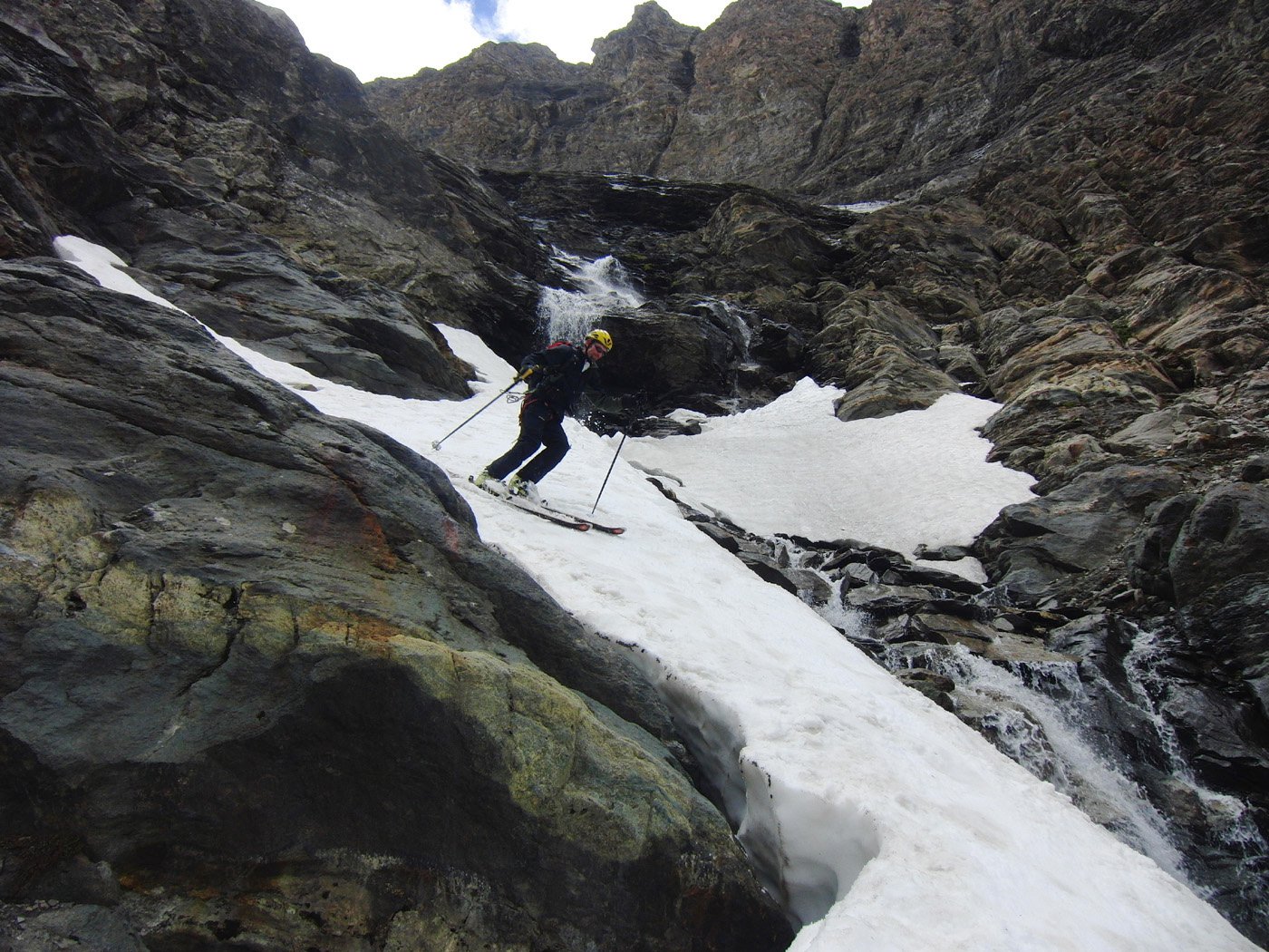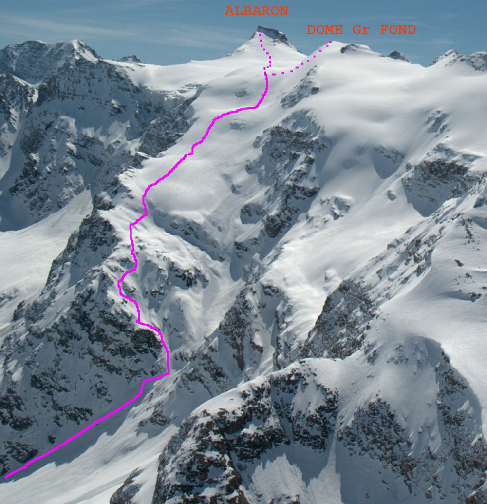 Si parte da Bonneval Sur Arc (in auto alla piazzola con tavoli del 1° pilone della seggiovia del Vallonnet); seguire la pista a fianco della seggiovia e raggiungere la stazione di arrivo. In tarda stagione si può giungere in auto direttamente alla prima stazione o anche oltre (quota 2.150) percorrendo la comoda sterrata, che si stacca dalla strada per l’Ecot dopo 150 m dall’area attrezzata del primo pilone della seggiovia; con 4×4 è possibile salire ancora per un centinaio di metri di dislivello proseguendo sulla sterrata di servizio delle piste. Continuare nel vallone sulla dx del rio du Vallonnet fino a giungere ai piedi della grande conoide che è originata dal Gh. Sup. du Vallonnet; salire la conoide (eventualmente ramponi o rampant) alquanto verso sx (non troppo sotto la parete che scarica pietre) al di fuori del corridoio di scarico del canale delle cascate soprastanti; passare una strettoia a sinistra poi aggirare verso dx la dorsale rocciosa con cengione di solito innevato giungendo al di sopra della prima cascata tenendosi sempre un poco a sx del solco del canale principale (stando sempre sulla sx non vi è il pericolo di trovarsi sotto il tiro dei seracchi). Proseguire inizialmente a sinistra in un accenno di comba/canale poi risalire un susseguirsi di canalini e cenge sulla sinistra fin quasi sulla dorsale che delimita il versante, quindi con un ultimo traverso ripido a dx accedere alla fronte del ghiacciaio (ormai fortemente ridotta). Salire direttamente sul ghiacciaio inizialmente in falsopiano, seguito da un pendio intermedio che si raddrizza alquanto, passare prima a sx di un risalto ripido (ex seraccata), poi dopo un falsopiano lungo il quale si attraversa a destra, salire a dx di un’altra ex seraccata, verso la base del pendio N delle P.tes du Grand Fond fino a giungere nei pressi del Col du Grand Fond a circa quota 3.380. Puntare al Dome sulla destra, superando la terminale cui segue un breve pendio ripido (40°) che porta alla calottina di vetta.