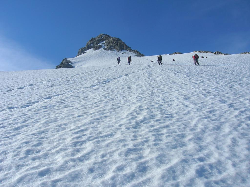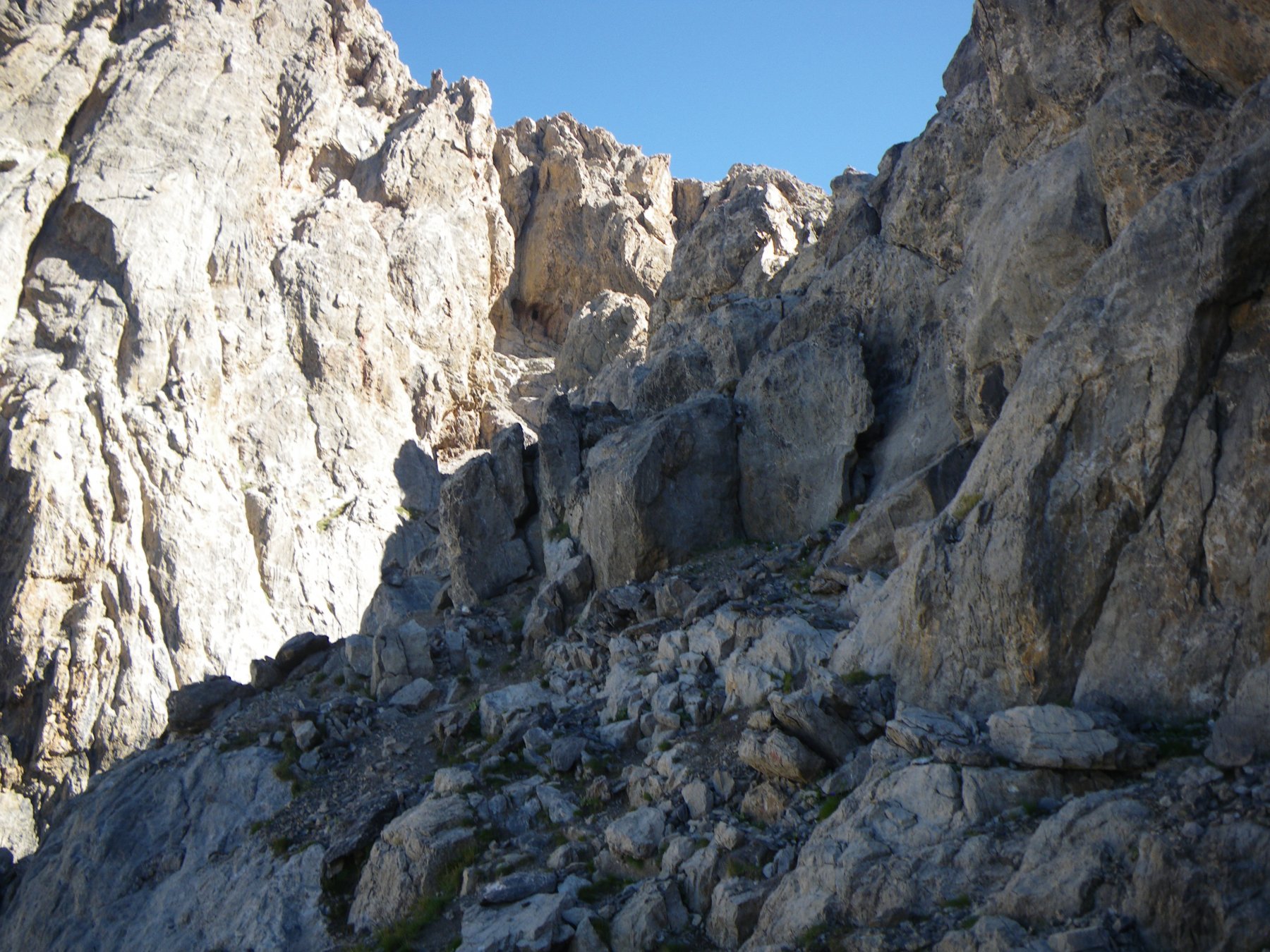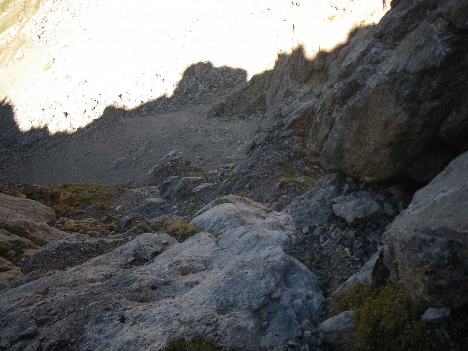 Dal tornante quota 2513 prima del col du Galibier (versante Lauaret) attraversata la strada si trova un sentiero (no paline, bolli, indicazioni varie… solo un cancelletto – filoelettrico per recinto pascolo), che in mantenendosi in quota attraversa i ripidi pendii (attenzione all’attraversamento di due impluvi ripidi e franosi ma con buoni appoggi per i piedi) sotto il Petit Galibier e la Pointe de la Tete Noire e così porta al selvaggio valloncello-pietraia per il Col Termier. La traccia principale seppur priva di segnalazione è molto buona ed è un continuo saliscendi in leggera discesa. Entrati nel valloncello la traccia si porta sulla sx (salendo) per tratti erbosi guadagnando nel miglior modo possibile la pietraia superiore cercando di evitare le fasce pietrose sottostanti. Si attraversa una classica pietraia (pietre medie grosse) e diversi ometti indicano la via. Qua conviene tenersi sulla pietraia (ometti) puntando il poco invitante cono di deiezione di pietrisco e terra dura tutto sulla sua sx (salendo) in modo da evitarlo il più possibile conviene mantenere la sx, (sempre salendo) e attaccando il canale nel suo restringimento contornando delle imponenti rocce (traccia labile e ometti). Da qua si entra nel canale tenendosi il più possibile sulla sx salendo a fianco delle solide rocce finché a metà canale dall’altra parte si vede una freccia trovare il tratto più agevole per attraversare il canale (tratto delicato per la natura del terreno: terra dura e pietrisco mobile..). Attraversatolo si sale per gradoni, cengette terrose e pietrisco e passaggi rocciosi (I/I+) all’inizio tenendosi nel centro di questo tratto (bollo sbiaditissimo… e ometti visibili solo girandosi indietro..), fino a infilare una cengia terrosa ascendente sulla dx con in fondo di nuovo una freccia, da qua i segni diventano ben chiari e con percorso zigzagante si arriva a un passaggio obbligato roccioso (-II) un po’ esposto e aggettante ma “strappigliato”. Ancora qualche metro sull’imbuto superiore del canale e si esce al col Termier (omettone). Da qua l’evidente traccia si collega salendo dopo poco con la traccia più diretta che proviene dal col Ponsonniere e per ripidi strappi del sentiero su pietraia ci si collega con l’itinerario classico: https://www.gulliver.it/itinerario/61441/