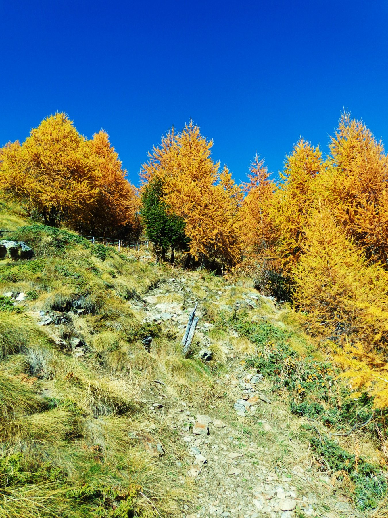 La pendenza del sentiero si fa quasi immediatamente più moderata e il percorso costeggia per lunghi tratti la piccola cremagliera di servizio agli alpeggi. Si esce infine dal bosco su pianori erbosi in vista del vasto fabbricato dell’Alpe Leché. Il tragitto originale non raggiunge l’Alpe ma ne aggira sul retro (N) il costone su cui essa sorge; tuttavia la presenza del grande alpeggio ha in tempi recenti alterato i sentieri che ora tendono a percorrere il dosso sommitale raggiungendo il pianoro dell’Alpe, senza peraltro che questo comporti problemi in quanto tutti i percorsi si ricongiungono poco oltre recando al Col Leché.