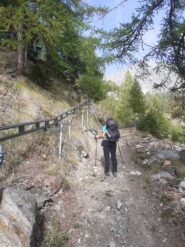 Raggiunto il rio di fondovalle, si svolti a sx (O) oltrepassandolo sul modesto attraversamento in cemento e tubi (segnavia, 45′ circa). La carrareccia incrocia dapprima una strada sterrata che si imbocca svoltando in salita a dx, poi dopo alcuni tornanti si individua sulla dx il vistoso sentiero di salita che inizia molto ripido con degli alti gradoni (cartelli indicatori, segnavia N. 8, 1H da Lignan).