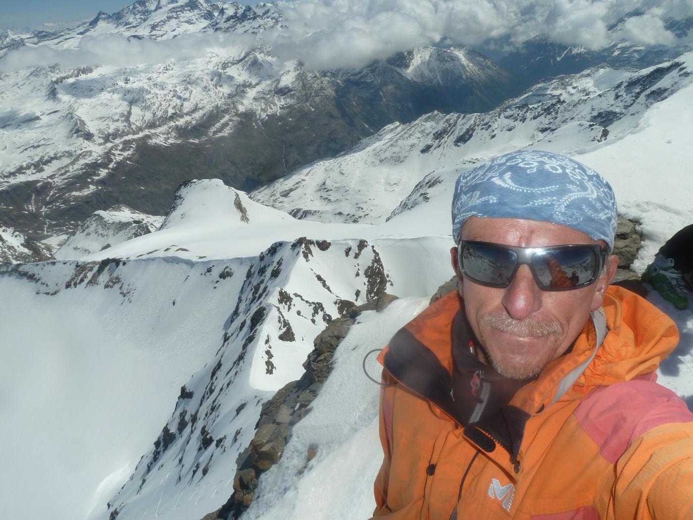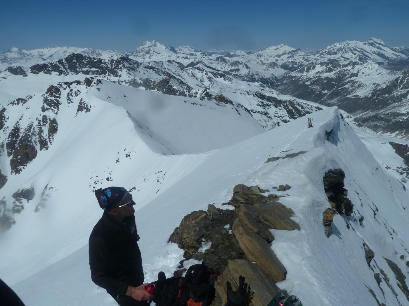 Prima volta in questa cima.La macchina si porta fino al tornante ancora innevato precedente il pianoro sotto il Serrù.Sci in spalle per 10 minuti,poi neve continua.Come da itinerario salito il ben ripido pendio segnato in punta da una palina in legno,che separa il lago Serrù dal vallone del Carro.Poi salita agevole fino al colletto,sceso e risalito a incrociare la traccia del versante francese.Salita agevole fino al colle delle Auguille ,di qui come tutti messo i rampant per salire il semplice pendio finale ,ma per uno come me perfin troppo vertiginoso.Lunga gita ,che ne ho sentito un pò il peso nel ritorno risalendo verso il colletto.A pensarci meglio sarei sceso ad anello verso il Ballotta.In punta circa 15 francesi,2 dalla Valchiusella che saluto e un gruppo finale dalla Bergamasca.Nei dintorni molta gente un pò ovunque.Tempo di salita 4,30 h.,neve direi sempre abbastanza ben sciabile nonostante il caldo.