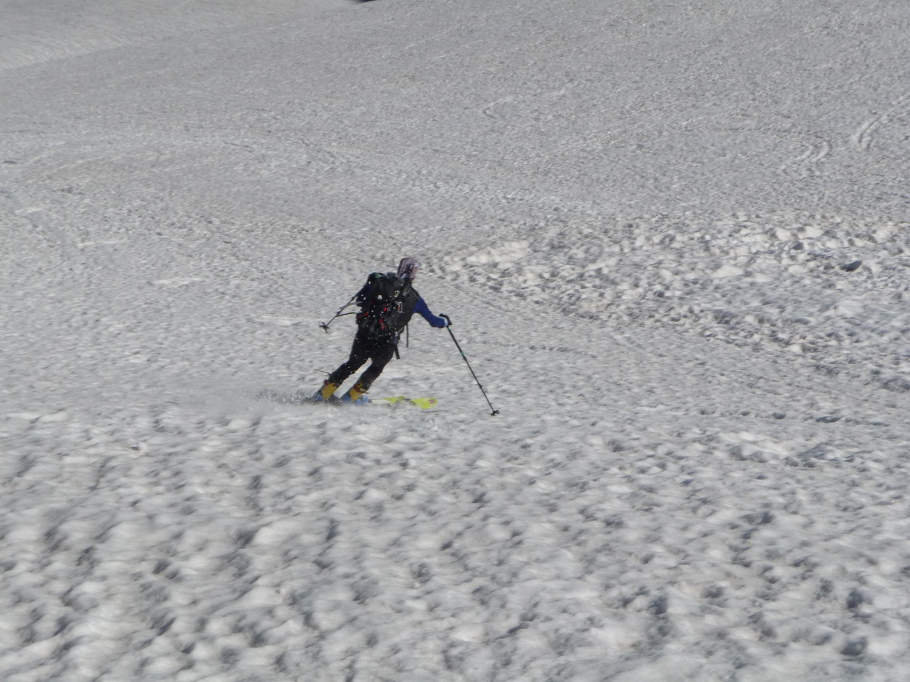 Si portano gli sci lungo il lago poi solo due metti leva in corrispondenza del colle per accedere al vallone del Carro e la morena successiva. Neve molto segnata dalla pioggia allora risaliamo a piedi fino al col d’Oin. Da qui prima discesa ore 8.00 su neve molto irregolare e ancora dura giusto due curve sotto la nord… Rimessi gli sci in spalla salita per la via normale in vetta. Discesa su neve irregolare ma cercando i pendii con esposizione est qualche curva decente si fa. Tornati al traverso risaliamo sempre sci in spalla al col d’Oin. Da qui traverso in leggera discesa e messe le pelli saliamo al Carro. Ultima discesa alle 11 circa su neve molto umida ma divertente e più si scende più migliora.