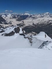 Sempre un bel giro, calzato i ramponi per salire al primo colle del paletto, poi caldo e neve un po’ molle sul lato Carro, tolto gli sci per salire gli ultimi 10m del col d’Oin privo di neve, tolto le pelli e scesi per salire dalla normale. Ultimo tratto della salita nuovamente tolto gli sci per poi terminare in cresta. Neve da 5 stelle in Francia, neve molle sul versante italiano.