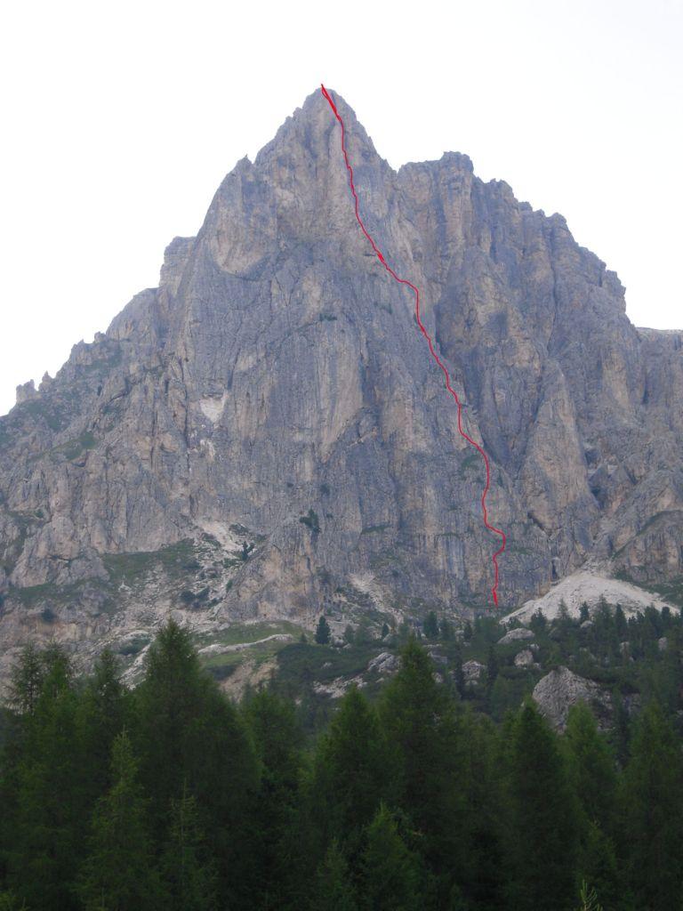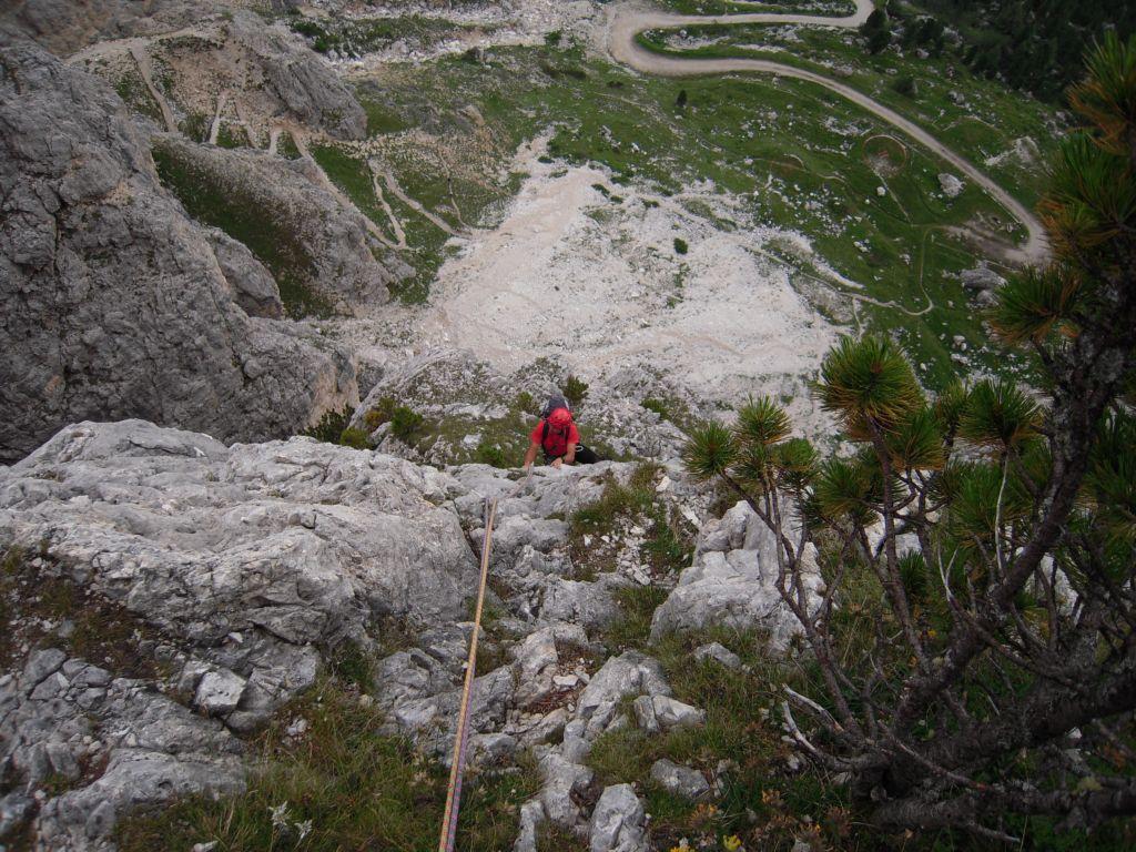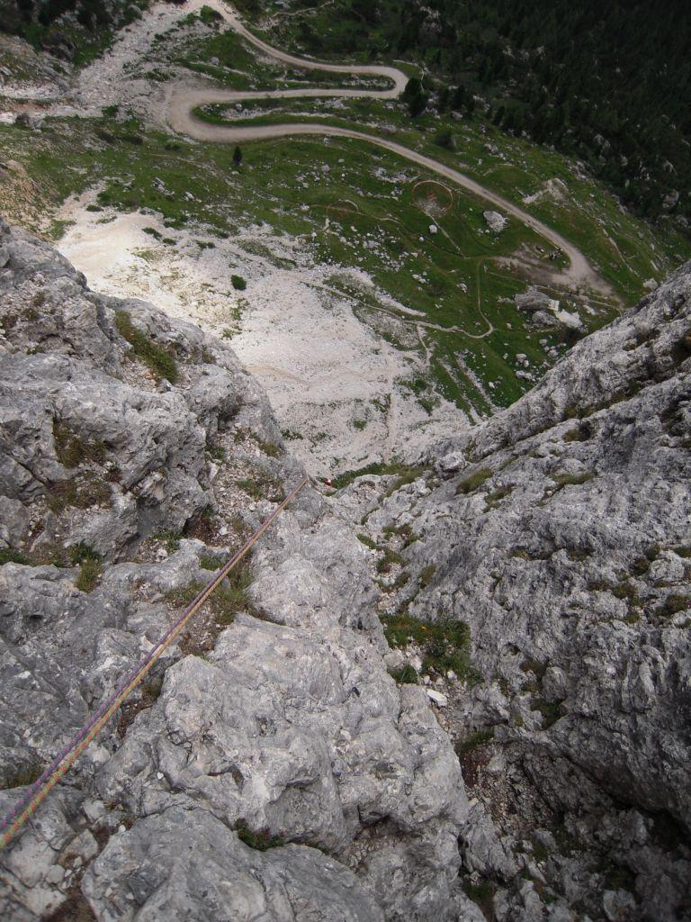 Dall’ultima sosta continuare per facile cresta erbosa, circa 50m. Poco sotto la cima, scendere in direzione nord un canalino che porta alla forcella tra la Torre Grande e la Cima di Falzarego (in arrampicata o con eventuali doppie attrezzate). Quindi seguire i segni rossi che prima per forcella, poi per ampia gola, con facili passi d’arrampicata, riconduce alla strada sterrata di guerra ed in breve al ristorante da “Strobel”