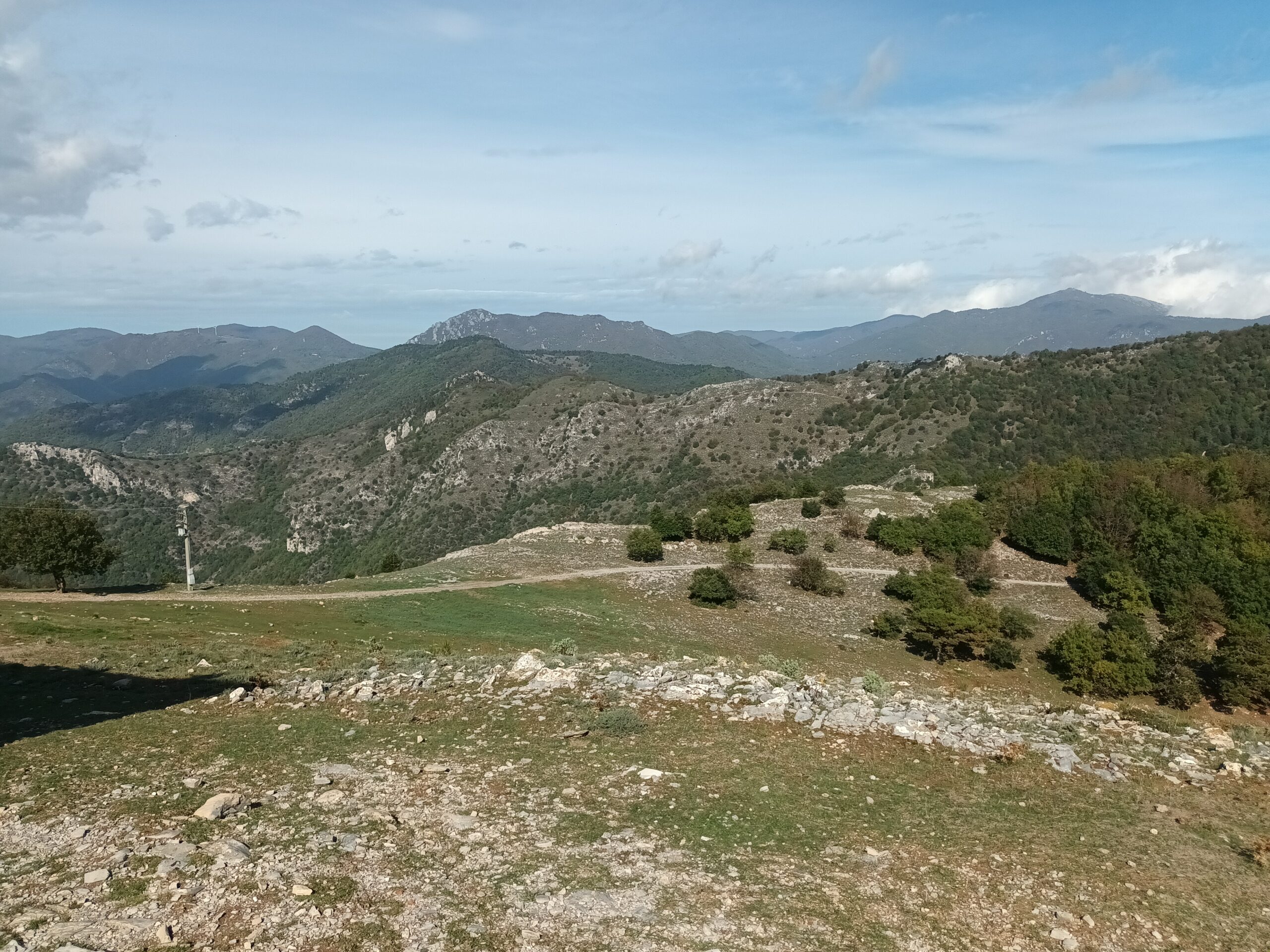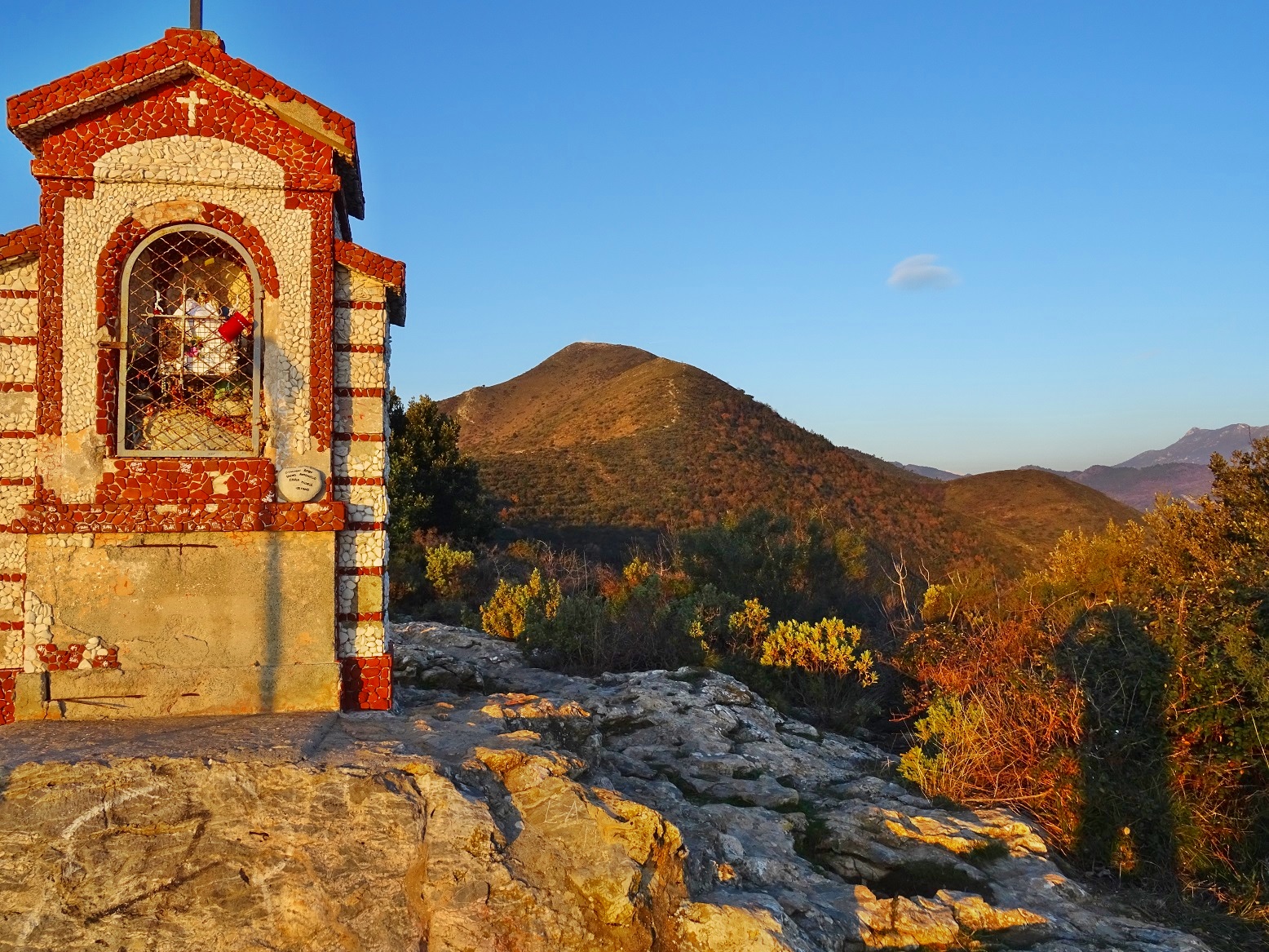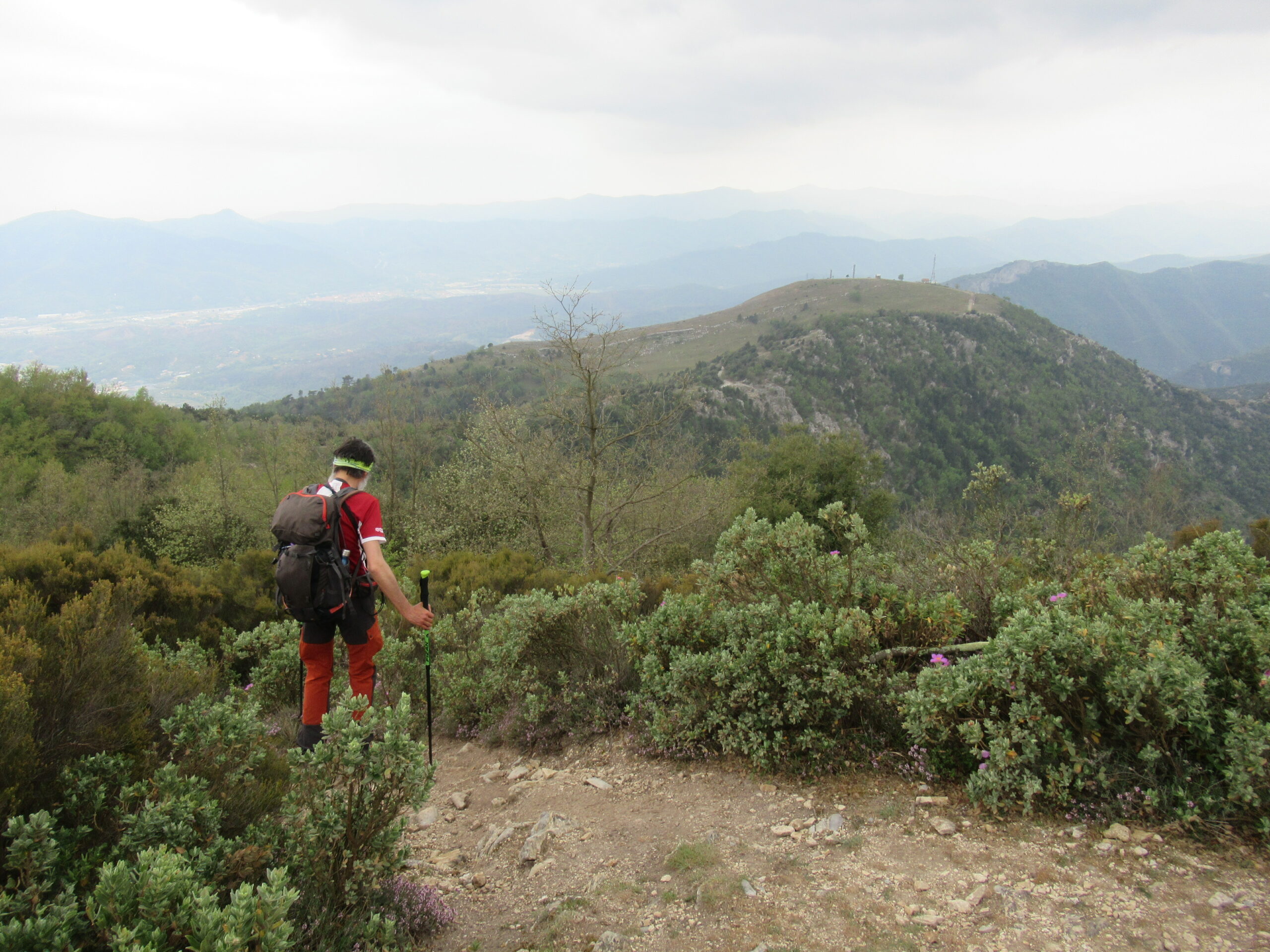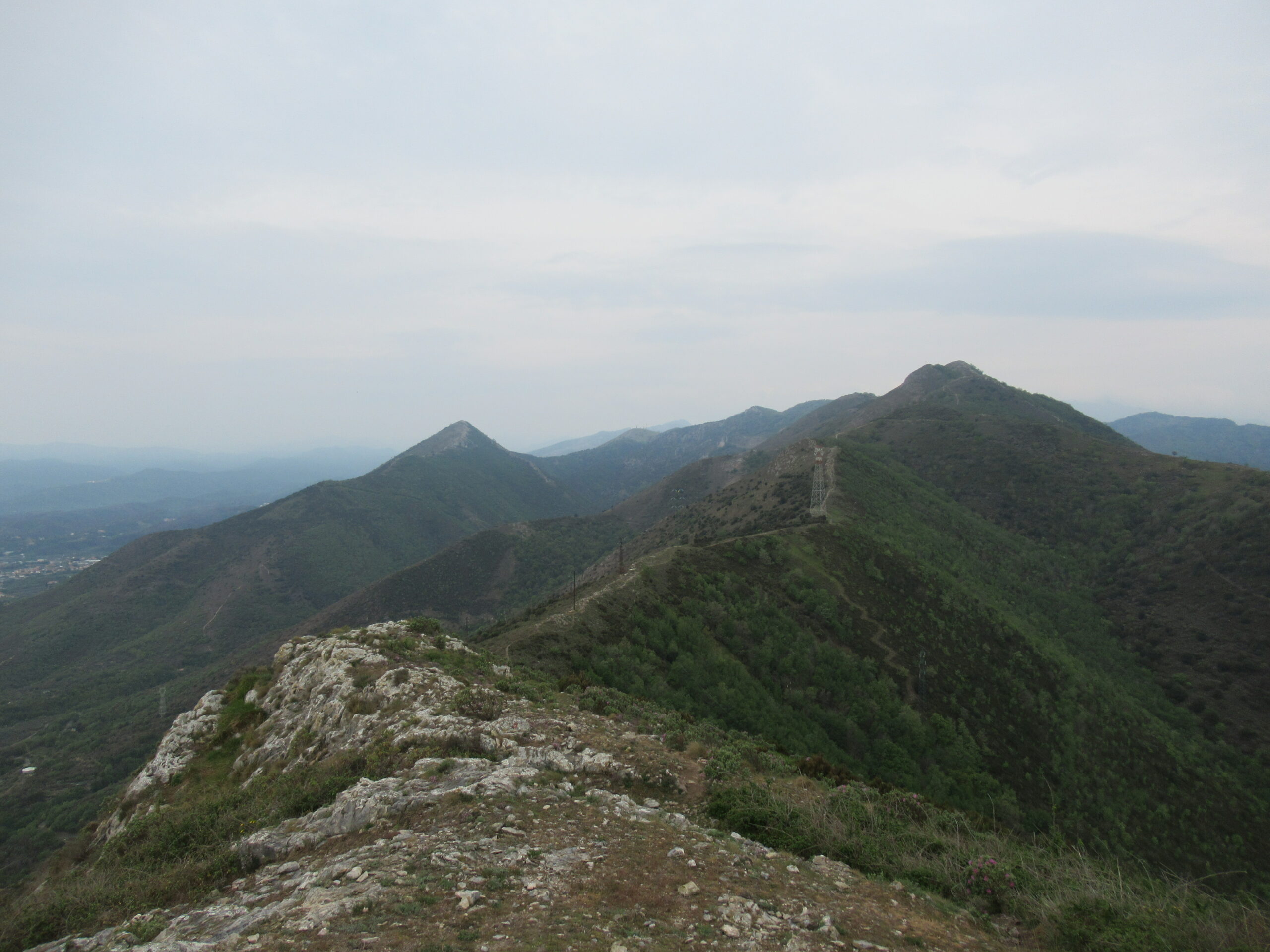 Da questo punto, il sentiero seguirà fedelmente tutta la dorsale fino praticamente al termine del nostro itinerario. Dopo una brevissima discesa, si riprende a salire verso l’evidente cima del Monte Croce la vetta del Monte Croce m.541. Qui una discesa un po’ più lunga conduce a dei tralicci, dopo i quali con percorso abbastanza dolce ma in salita, sempre sul crinale, consente di toccare il Monte Sopra Toirano e successivamente il Monte Acuto 747 m, dal quale si ha un’ottima vista su tutto il percorso.Da qui in avanti l’ambiente diventa molto selvaggio e vario. Si prosegue prima in discesa, poi in falsopiano toccando alcuni pascoli (presenti trune in pietra come riparo d’emergenza), si supera una affascinante zona rocciosa e si arriva nei pressi di un prato sotto il Santuario di Monte Croce. Qui si prosegue a destra, per un breve tratto nel bosco, per sbucare proprio nel piazzale del santuario (brevissima deviazione). Il sentiero prosegue in salita dal lato opposto del piazzale (ignorare la strada) e con un tratto ripido ma breve, si giunge al forte del Poggio Grande, il cui accesso è su una esile passerella in pietra con il fossato sui lati (attenzione). Dopo aver visitato il complesso fortificato e ben mimetizzato, si torna indietro dalla passerella, e subito dopo si devia a destra seguendo il sentiero che in breve porterà alla strada sterrata sottostante. La si percorre per alcune centinaia di metri in leggera discesa, finchè sulla destra si stacca il sentiero per il Pizzo Ceresa, riconoscibile per i numerosi ripetitori. Il sentiero poco oltre si ricollega alla strada sterrata, che in pochi minuti con una breve risalita porta sulla cima 714 m, con una bella cappella.