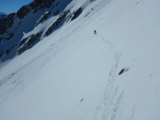 Gran bella gita su pendii sempre sostenuti. Passati per il primo canale a destra, mettendo i ramponi alla deviazione per neve dura, poi il socio ha tracciato fino in vetta. Bella neve nel primo pezzo ripido sotto la punta, poi alternanza di tratti sentati e no. Il canale era in ottime condizioni, con la neve che aveva mollato il giusto. Poi ottimo fino al parcheggio.