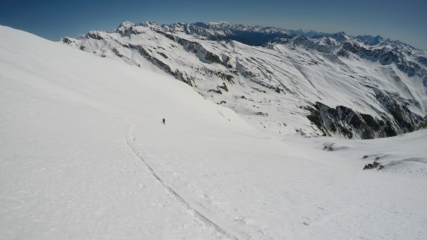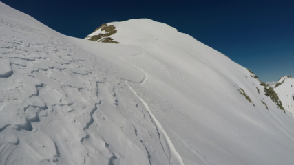 Gita fatta il 9 Aprile, condizioni perfette. Il freddo ha mantenuto la neve polverosa nella parte superiore dell’itinerario e nella parte mediana (nelle contropendenze nord). Poi trasfo d’eccezione.