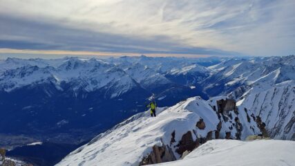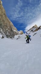 Neve da subito e anche ottima, una volta arrivati al fondo non abbiamo capito quale era il canale da salire quindi abbiamo poi scoperto di aver fatto il couloir dade, un 4.1. 1000 metri di canale da tracciare in neve pressata e a volte cotta dal sole che sprofondavi malamente…. ma una volta in punta al mont de la varise abbiamo scoperto che potevamo fare la traversata toccando 3 vette.. quindi contenti come dei cani sciolti non ci siamo persi danimo e siamo poi arrivati alla grande rochere.. in discesa siamo scesi dalla normale facendo un giro ad anello, primo pendio molto abbottonati, poi crosta portante con dei pezzi in farina e poi via via sempre più portate molto bella fino all’auto. Panorama sul bianco super.!!! Bella bil.