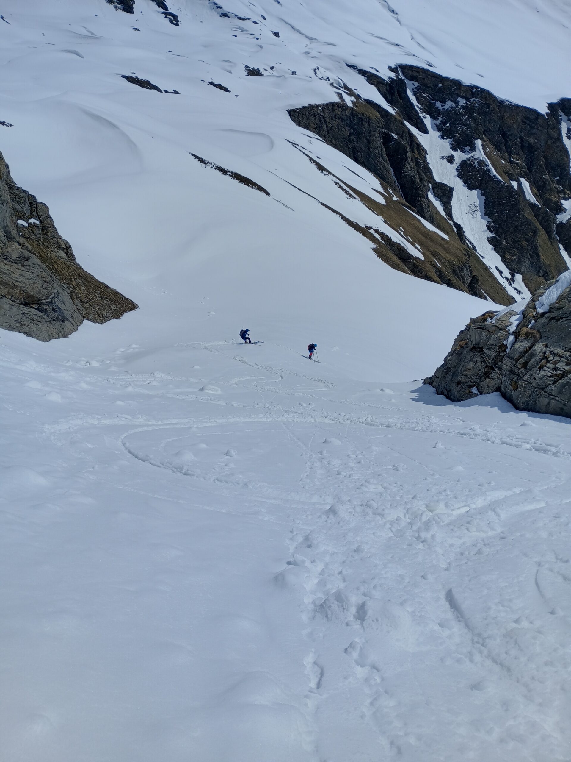 Discesa dalla vetta prima su neve crostosa non portante (‘na schifezza), poi migliora sotto il colle. Ci siamo tenuti a sinistra del canalone di salita, che poi abbiamo ripreso scendendo prima dal crestone e poi dai pendii opposti, evitando la zona coi blocchi di ghiaccio. Staccato qualche lastra di neve, nulla di grosso o spesso, che poggiava su fondo duro. Poi ci siamo sempre tenuti sulla destra per scendere il più possibile con gli sci, e a parte una 50ina di metri in cui abbiamo dovuto toglierli (occhio, placche scivolose) siamo riusciti a sciare praticamente tutto.