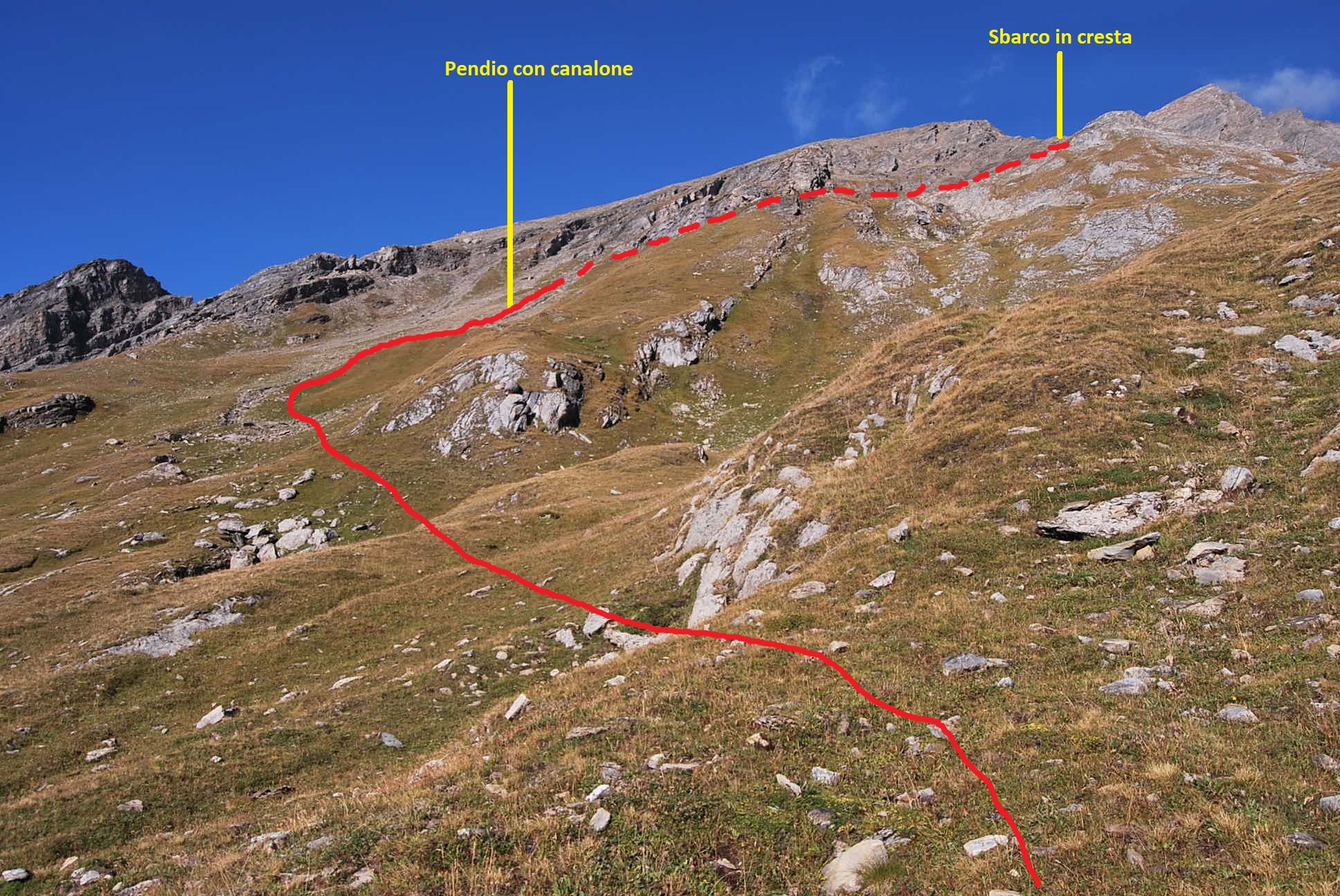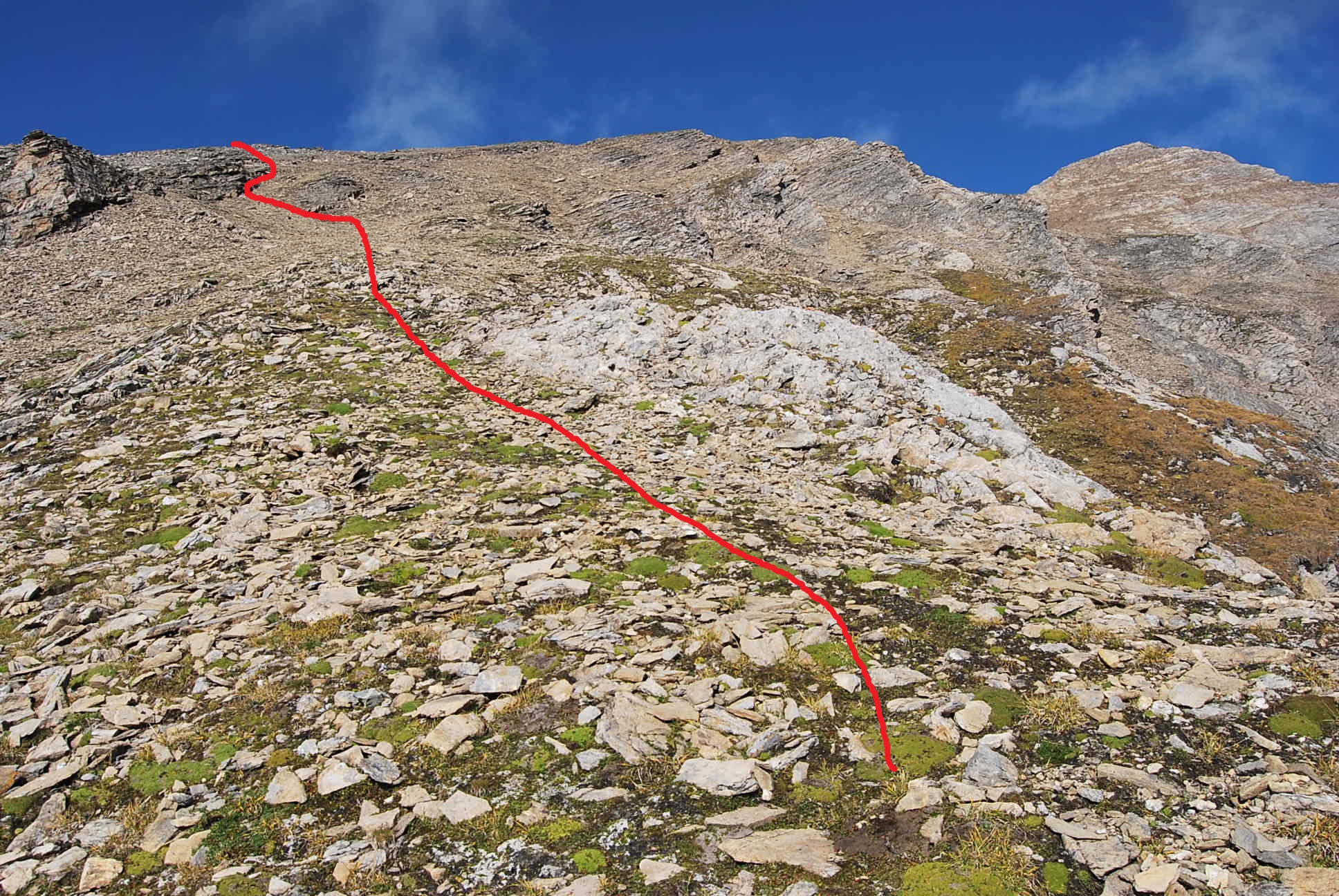 Per imboccare questo percorso si sale dal pianoro di Bonalex seguendo gli ometti; quando questi, in un pianoro, piegano decisamente a destra (ma poco evidente, v. oltre) si svolta invece a sinistra, si aggira il costone e ci si ritrova sotto un pendio solcato da un canalone, pendio che va risalito fino alla sommità, su zolle erbose o sui sassi, a scelta e puntando ad un grosso masso. Qui si ritrova un canalone ripido e impervio: il consiglio è attraversarlo appena possibile (io mi ci sono un po’ infognato) per portarsi sul pendio erboso sulla parte opposta, pendio che si risale agevolmente fino a quando le zolle erbose lasciano il posto ai detriti. Seguendo il percorso migliore si sbarca in cresta tra il Pic la Varise e la Petite Rochere, si piega a destra e si arriva alla vetta della Petite Rochere; da questa, lungo la marcata traccia, si scende al sottostante colle da dove si risale alla Grande Rochere.