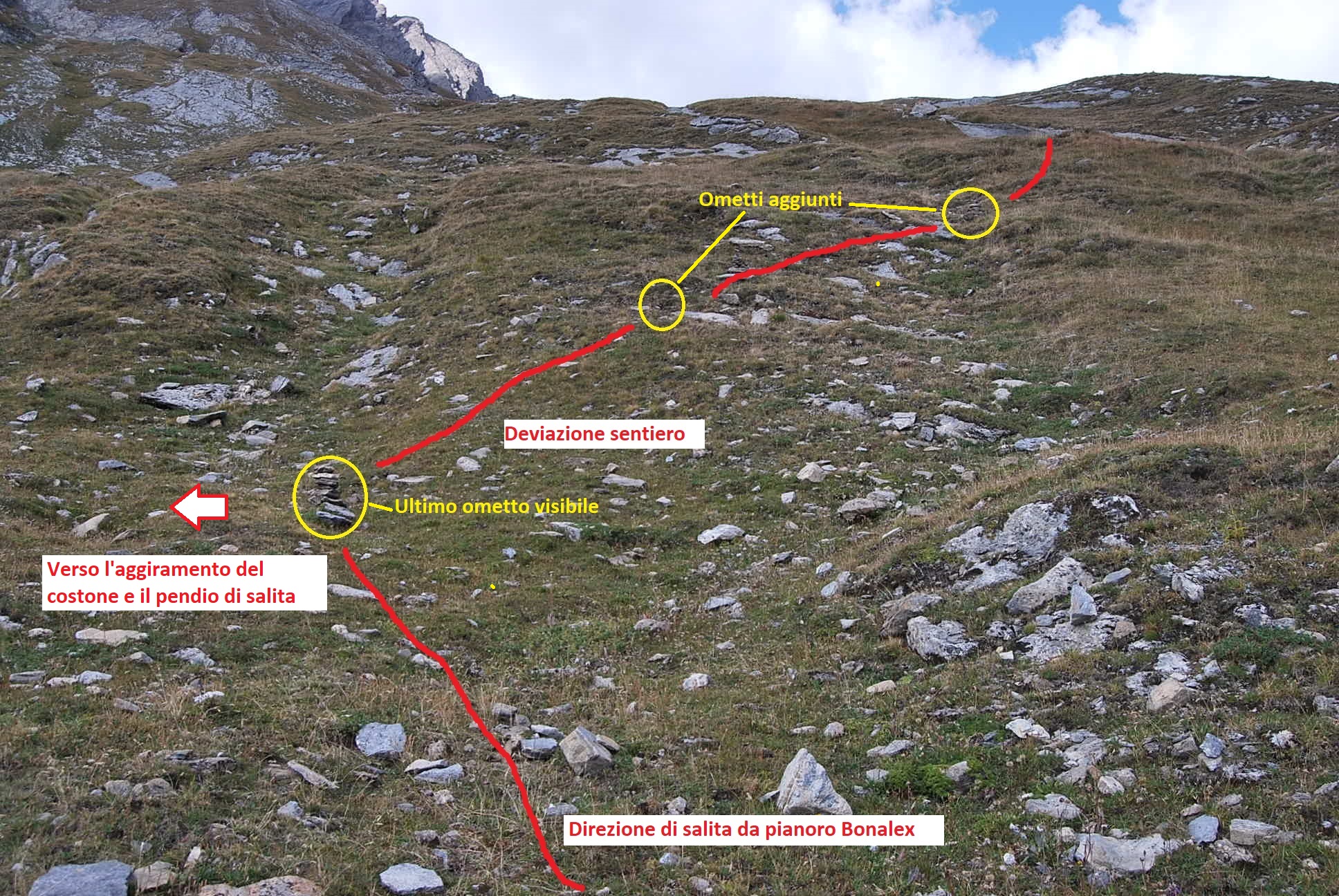 Un dettaglio. In salita, per stare sulla “via normale” c’è un punto di incertezza, ed è quello dove gli ometti, dopo un tratto lineare, piegano a destra (dove sono andato in crisi la volta scorsa). Non c’è un ometto che indichi la svolta, forse ce n’era uno che è caduto (ci sono ancora i cocci a terra) per cui si sarebbe portati ad andare diritto. Ho aggiunto due ometti che dovrebbero fare da trait d’union, sperando di aver fatto la cosa giusta.