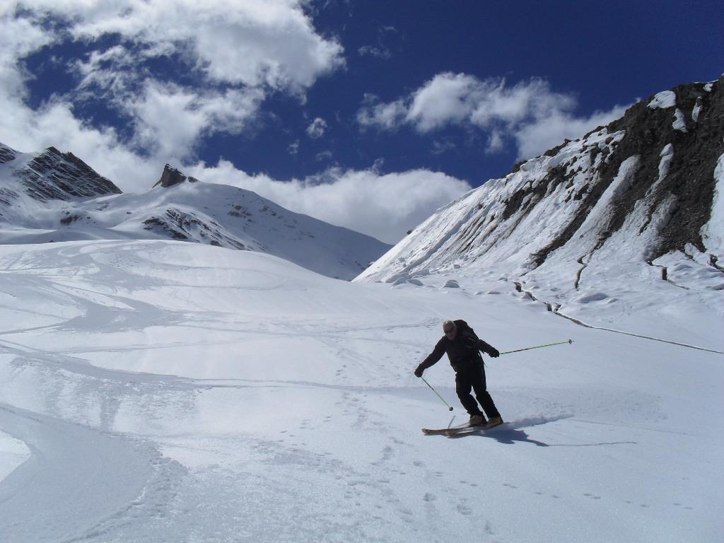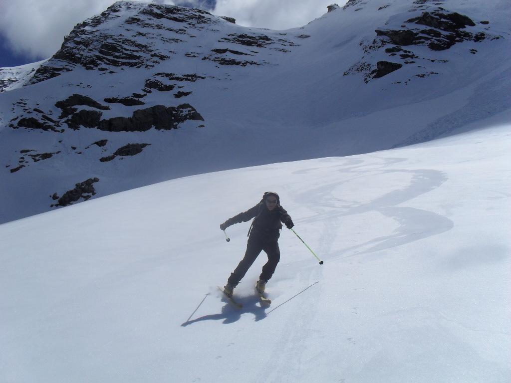 Abbiamo raggiunto ,dopo 4 ore,il cambio di pendenza ,sotto il colletto 3500,(300 mt, sui 40-45 gradi) e li ci siamo fermati,un po’ per stanchezza ma anche perche’ volevamo sfruttare l’ottima neve ,su pendenze per noi al limite ma sciabilissime e che ci hanno regalato una delle migliori discese di tutta la stagione 2010.