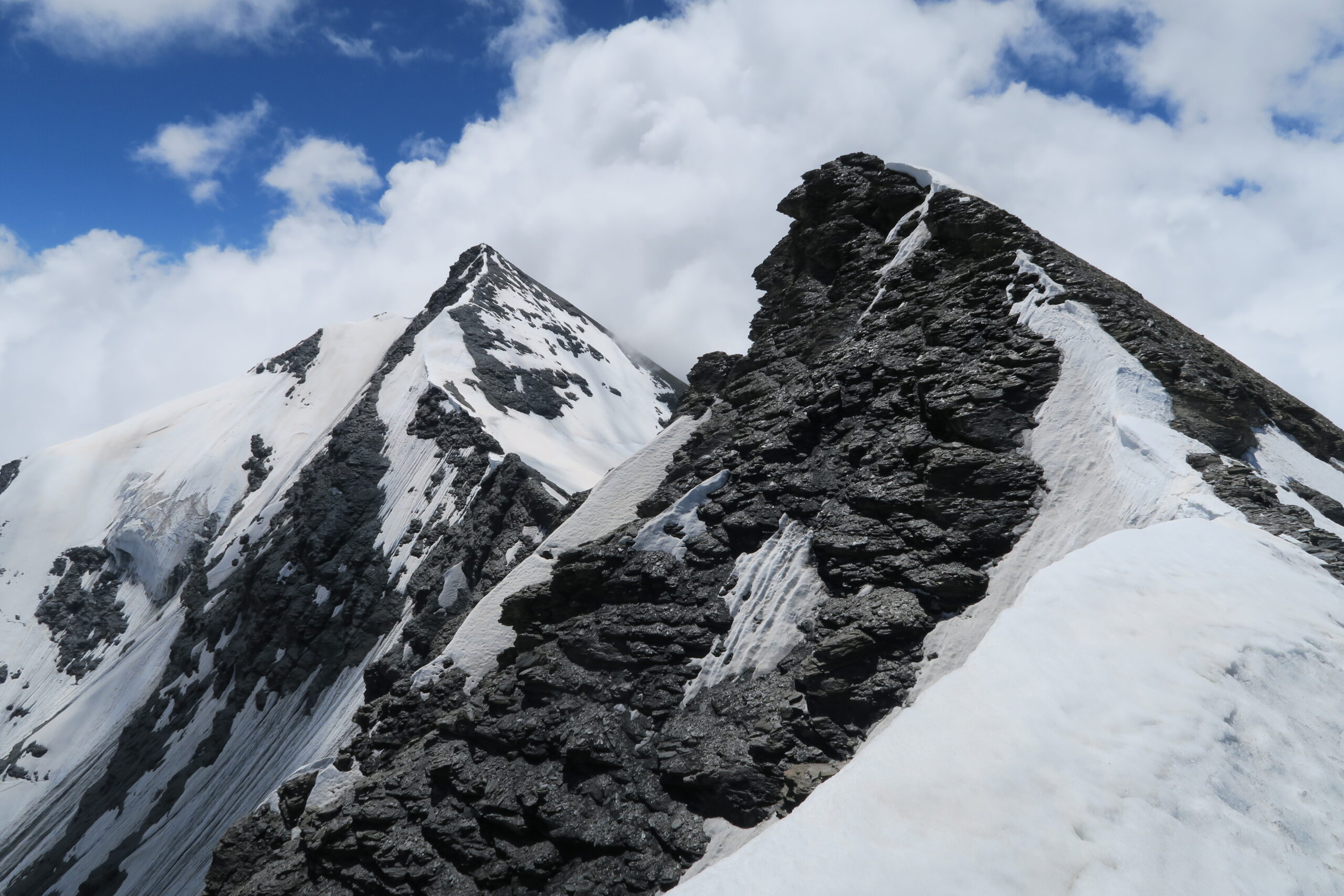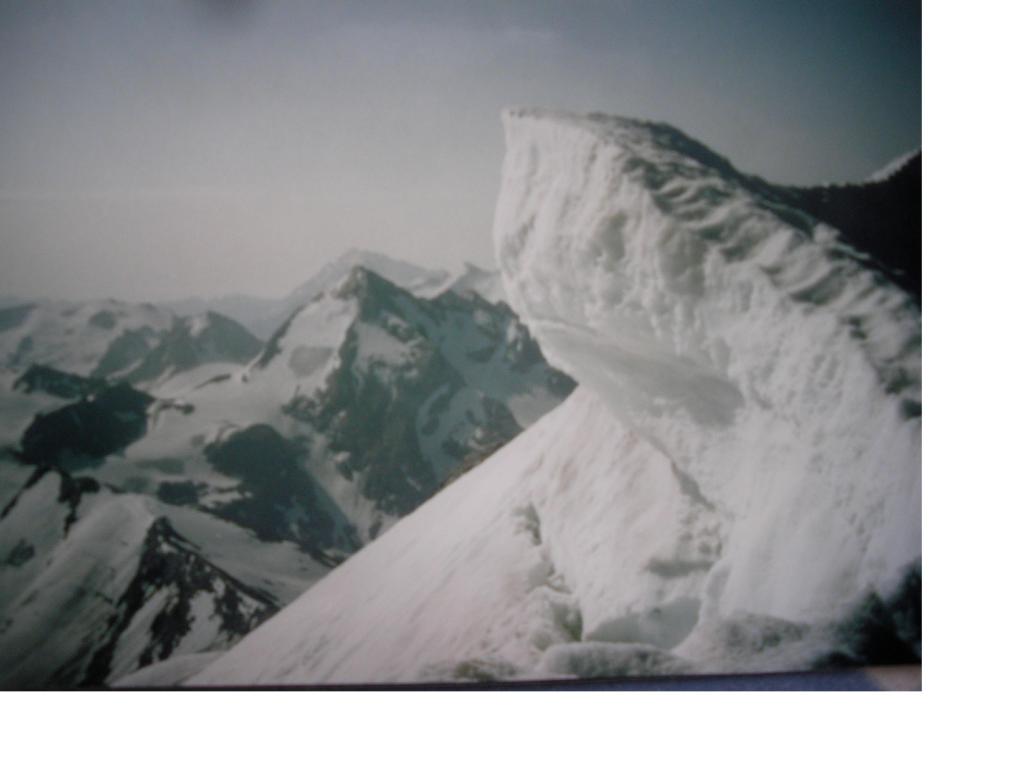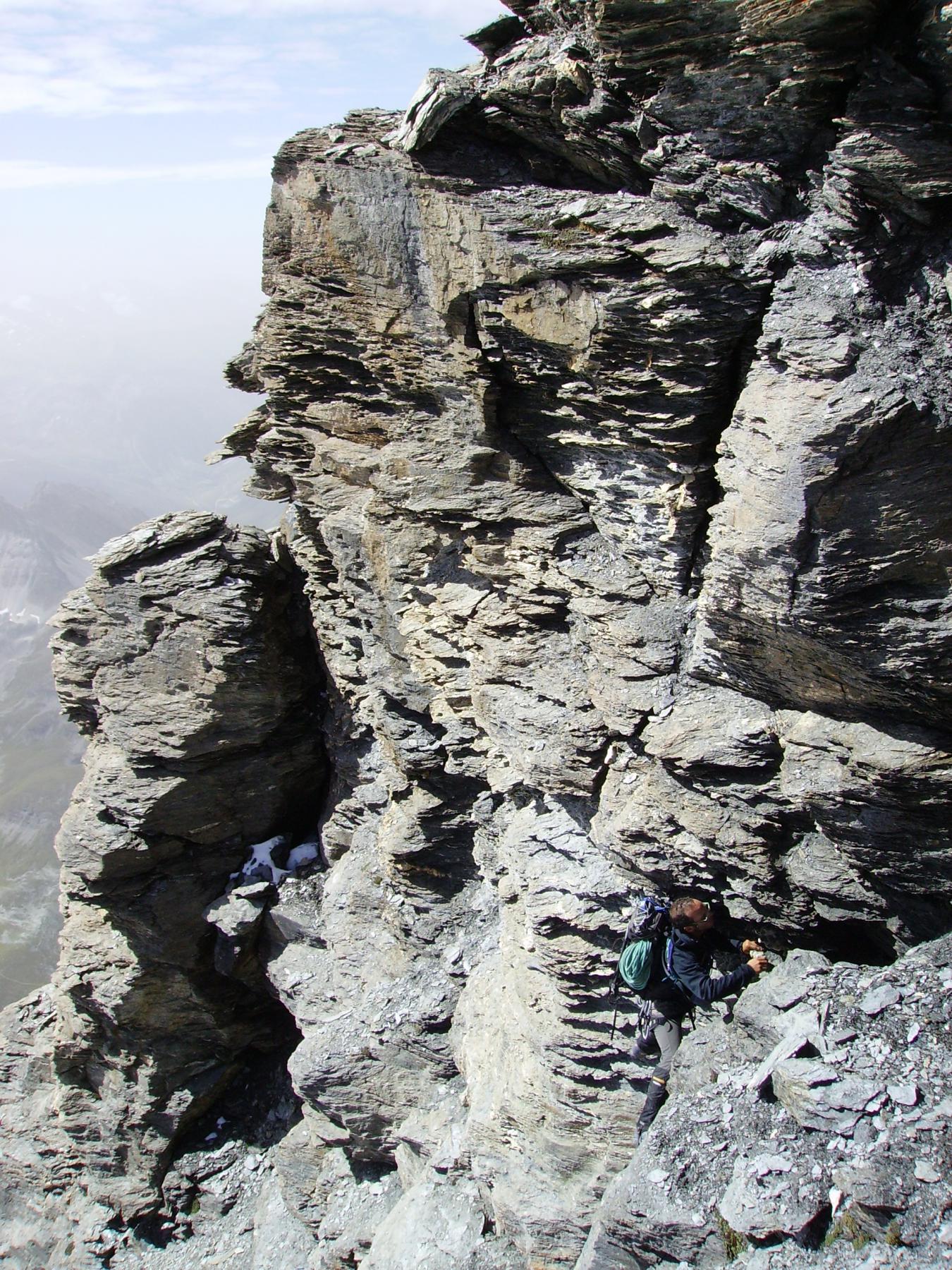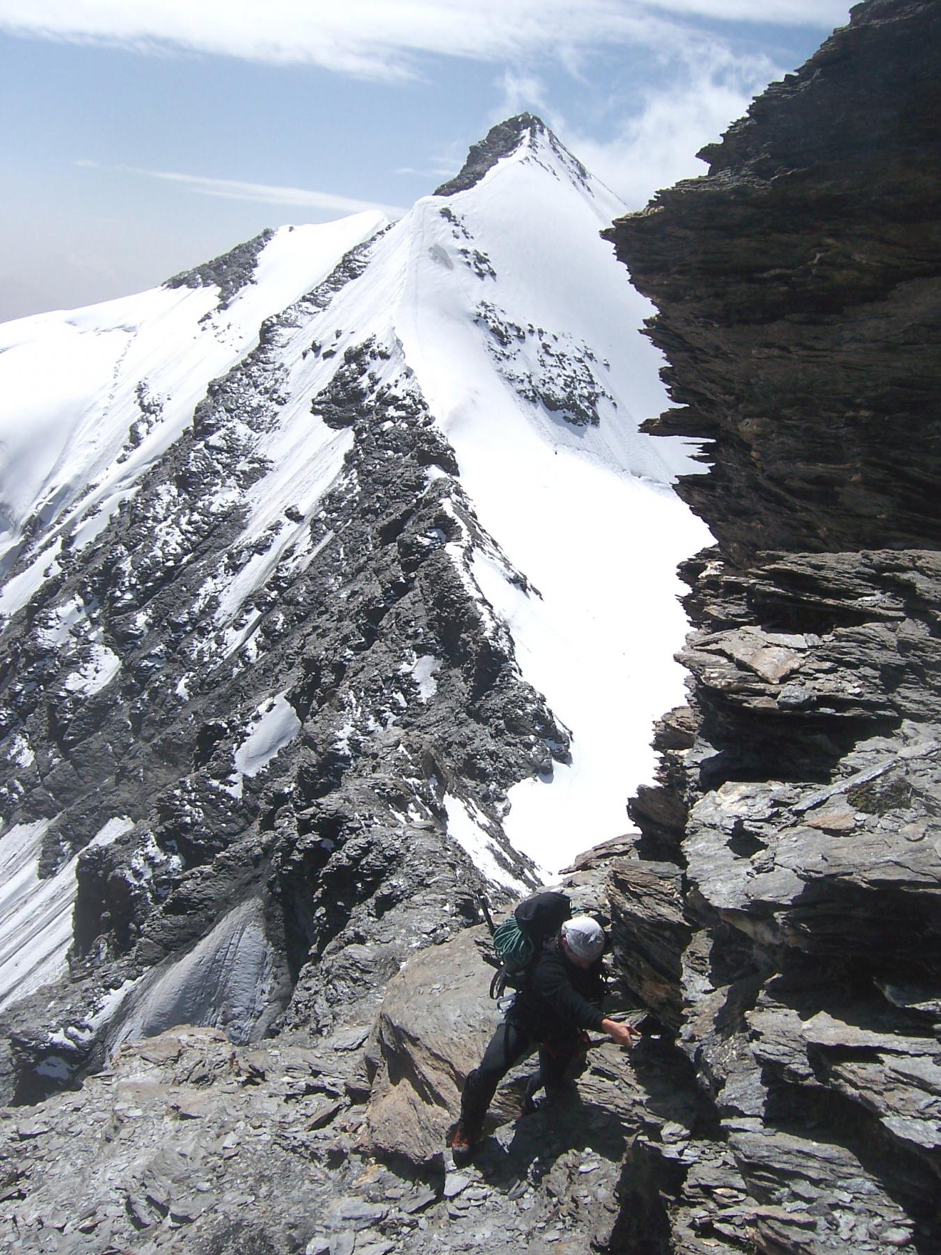 Poi si comincia a destra la lunga cresta perlopiù detritica e nevosa fino a arrivare a una spalla. Li ci sono 30 m di splendida cresta aerea (la kuffner dei poveri).