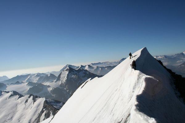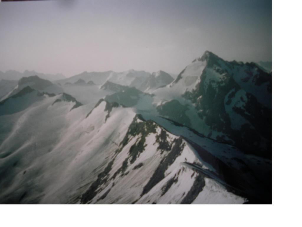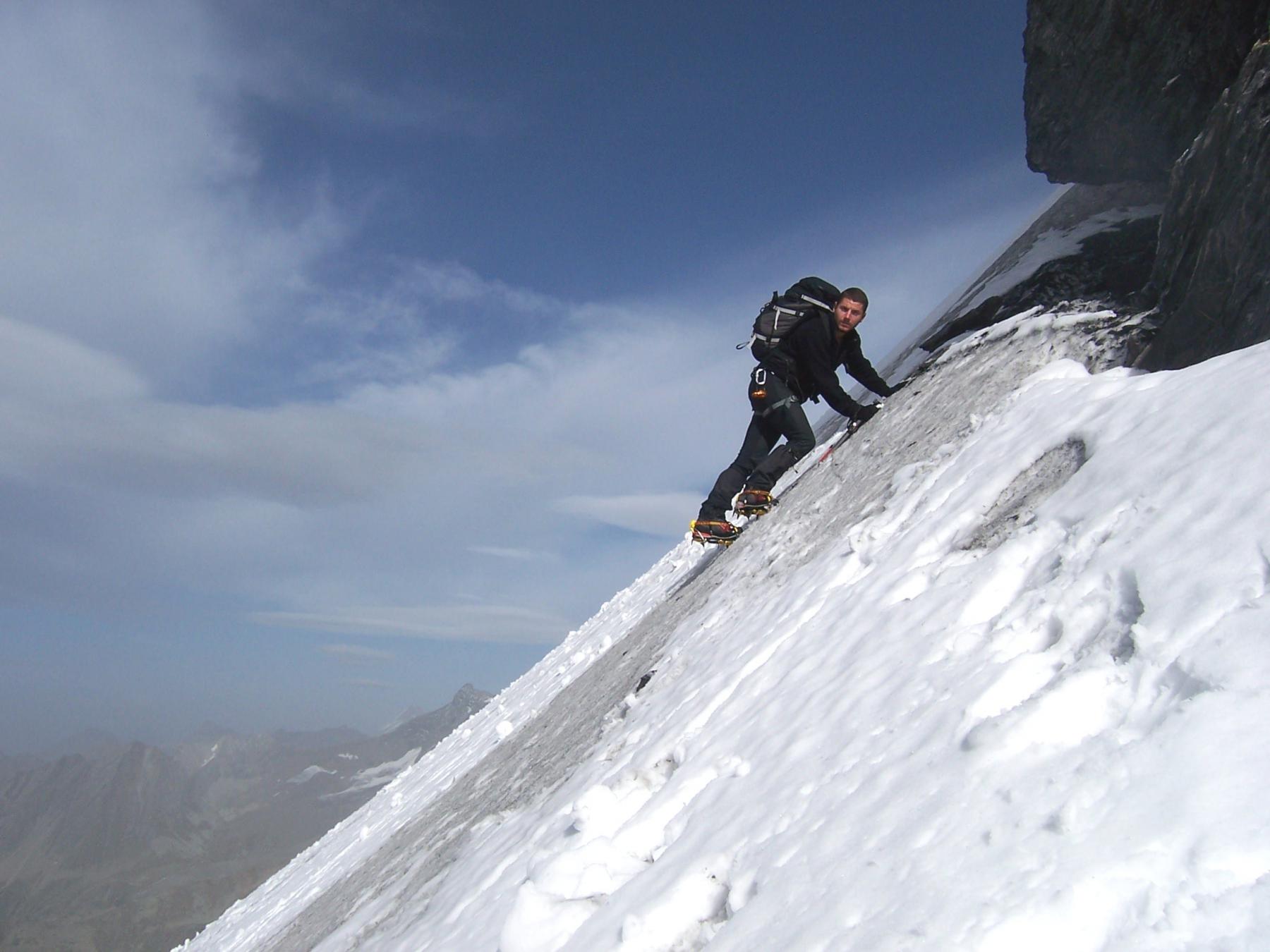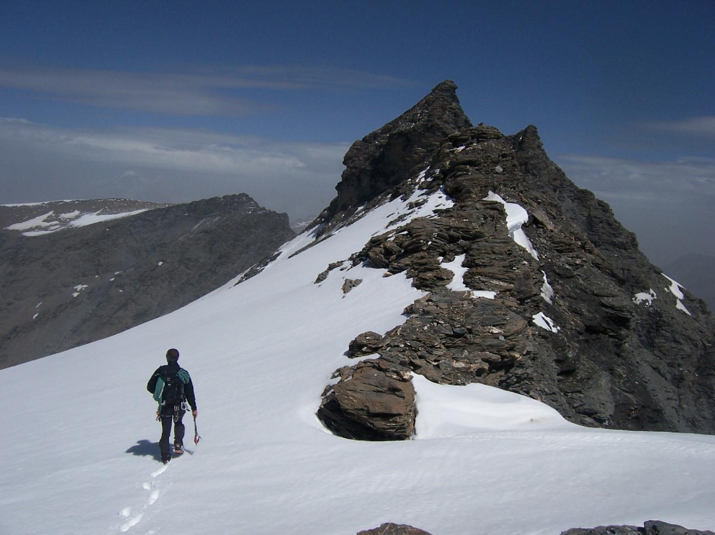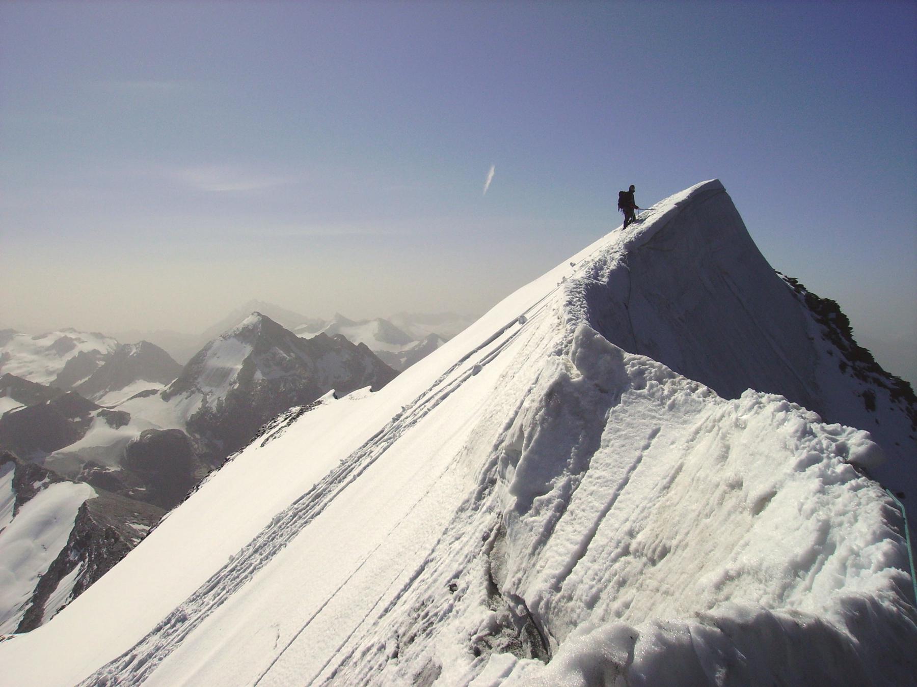 Poi si comincia a destra la lunga cresta perlopiù detritica e nevosa fino a arrivare a una spalla. Li ci sono 30 m di splendida cresta aerea (la kuffner dei poveri).