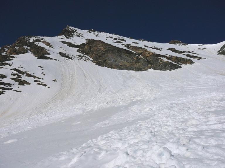 Continuare a risalire a mezza costa su pendii poco ripidi, innevati a inizio stagione, procedendo verso la base dello scivolo nord-est della montagna, a questo punto già visibile. Portarsi alla base di questo versante, su quel che resta del Ghiacciaio Nord di Traversière, non lontani dal Colle di Bassac (lo si può anche raggiungere direttamente dal fondo valle con il segnavia n. 14). Salire tenendosi dapprima a destra, per evitare i grossi affioramenti rocciosi presenti al centro del versante, e poi obliquamente a sinistra, senza percorso obbligato (pendenza di 45° al massimo).