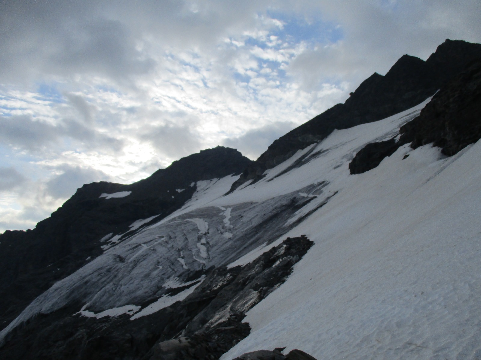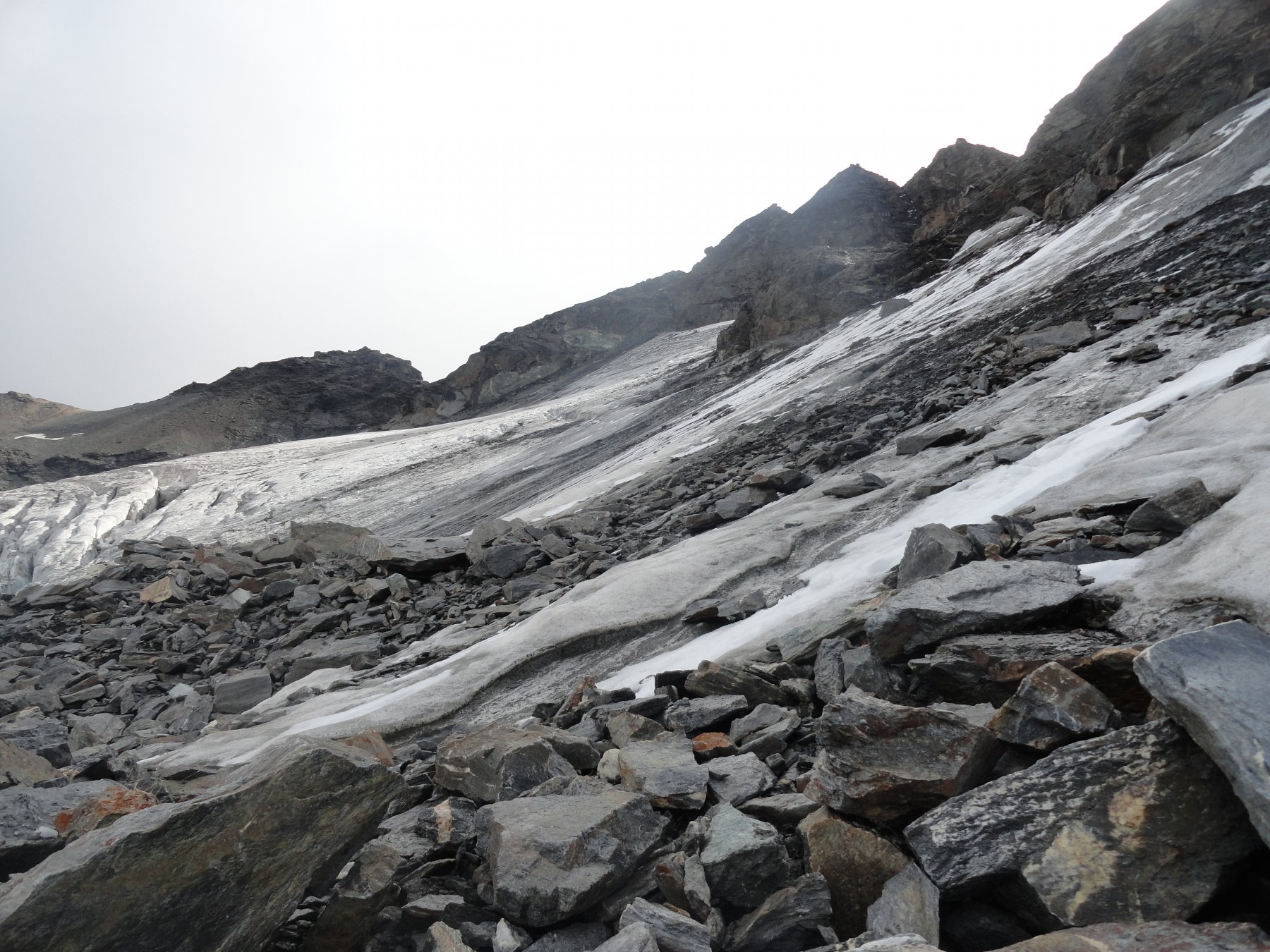 In alto il canalone si allarga e, appoggiando a sinistra (rarissimi ometti) ci si porta sul culmine dello sperone detritico che separa il canalone dal bacino del Ghiacciaio di Bassac, più o meno a quota 3100. Da questo punto, dopo essere saliti di una ventina di metri, si deve iniziare un lungo traverso orizzontale verso sinistra (Nord) su di un pendio inclinato mediamente a 45° e che precipita su ciò che resta delle antiche seraccate (è il tratto più delicato della salita).