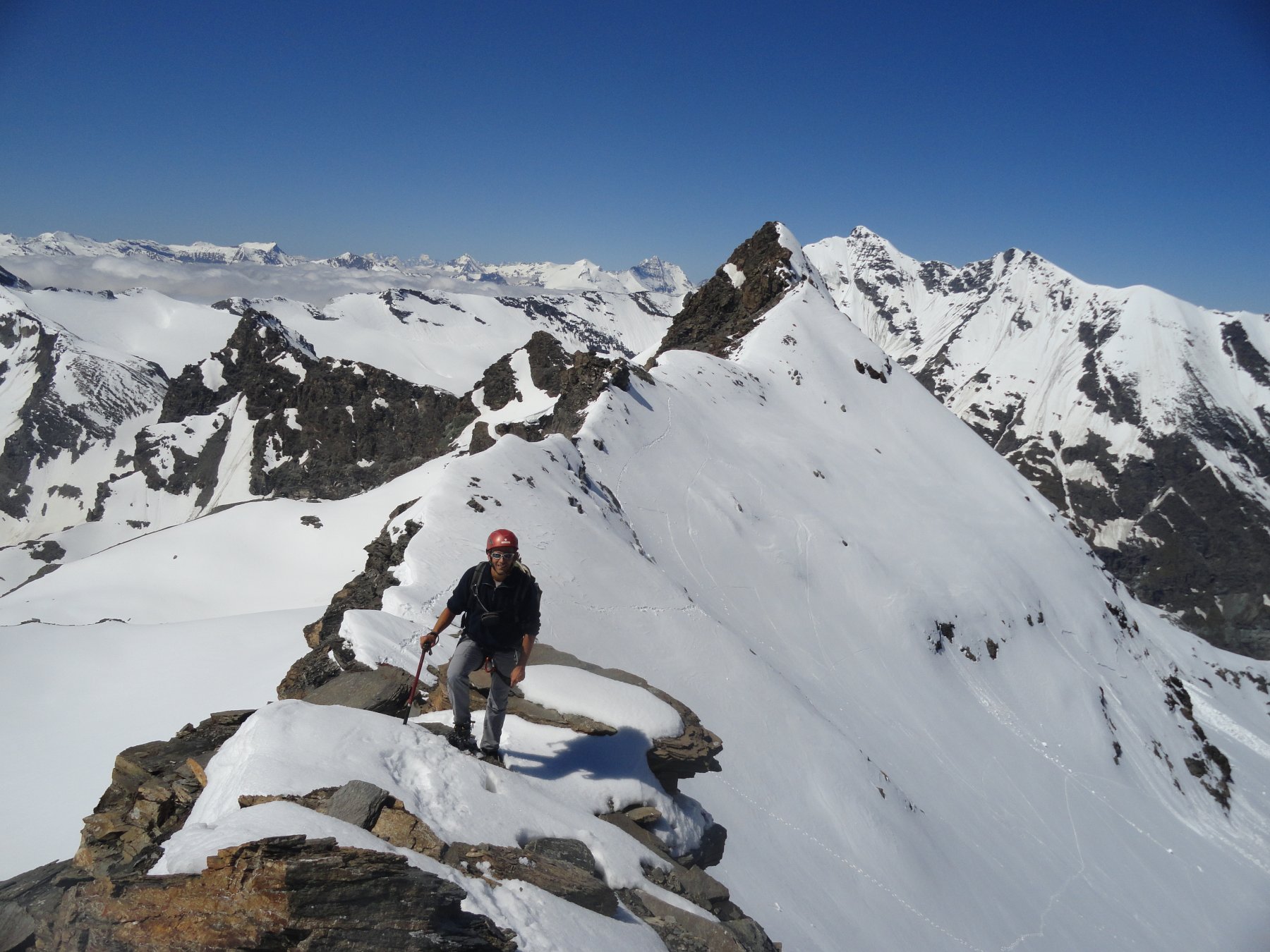 Raggiunto l’attacco della cresta in prossimità di un colletto nevoso, risalirla al meglio, superando tratti nevosi alternati a brevi passaggi su roccia totalmente sfaldata, fino alla croce di vetta.
