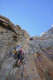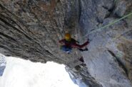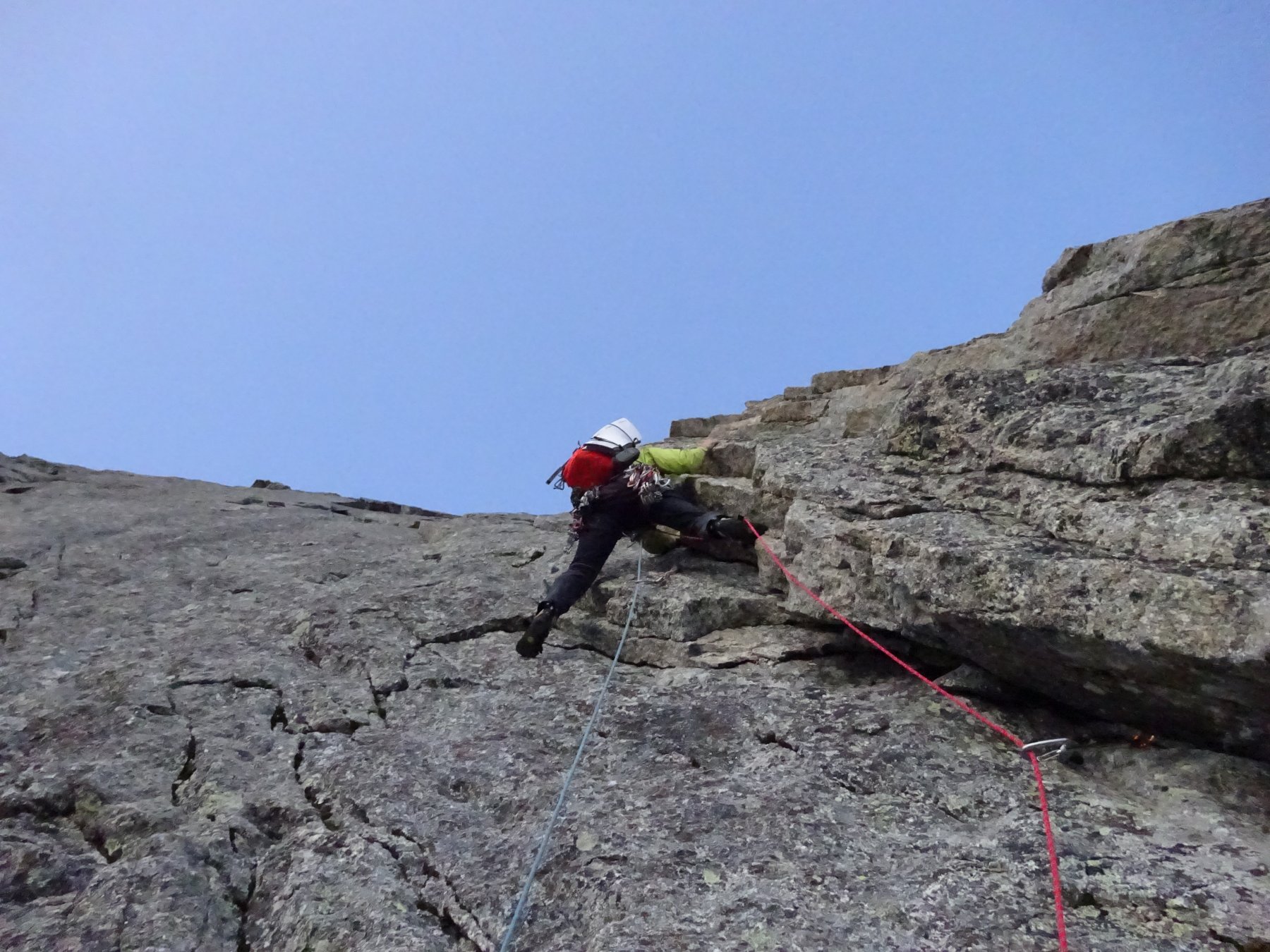 Itinerario lunghissimo, quasi infinito, (circa 40 tiri), classico ma non facile da trovare. Roccia buona nei tiri difficili, delicata su molti altri. Complessa anche la parte alta con tiri di misto impegnativi e tratti spesso verglassati.