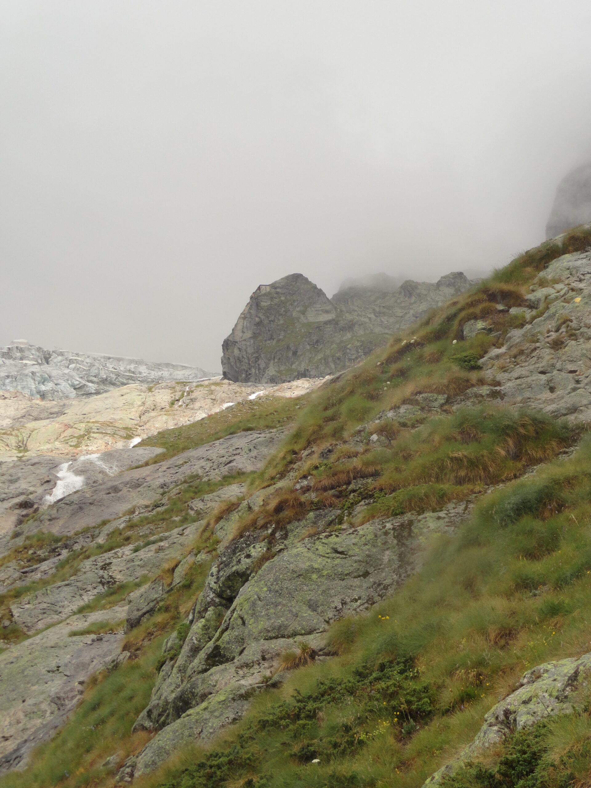 Vetta non raggiunta. Sentiero ben evidente (bolli gialli) che porta al rifugio Boccalatte, posto su un promontorio roccioso: veramente un bel nido d’aquila!Siamo saliti nella tarda mattinata del 24 tra nuvole e qualche goccia. Nel pomeriggio ha continuato a piovere fino alle 18 circa (le previsioni davano sole e schiarite), dopo cena abbiamo fatto una breve esplorazione sulla morena sopra il rifugio, e constatato che c’era una spolverata di neve fresca. Partenza ore 2 e dopo aver aggirato qualche crepaccio, giungiamo al Reposoir…tutto imbiancato. Battiamo traccia su circa 10 cm di neve fresca che ricopre il verglass, (ramponi indispensabili) impiegandoci molto più tempo del previsto. In cima alla cresta veniamo superati da una cordata di scozzesi e da un italiano partiti dal parcheggio (complimenti per la velocità), che restano perplessi all’attacco del diedro per le Rocher Whymper, in quanto si presenta tutto in verglass. Loro proseguiranno, noi decidiamo che l’ora è già tarda, e iniziamo a scendere. Nella parte bassa facciamo 4 doppie (neve ormai sciolta) e giungiamo sul ghiacciaio, dove la neve inizia ad essere bella cotta, alle 14 circa siamo al rifugio.