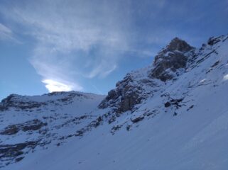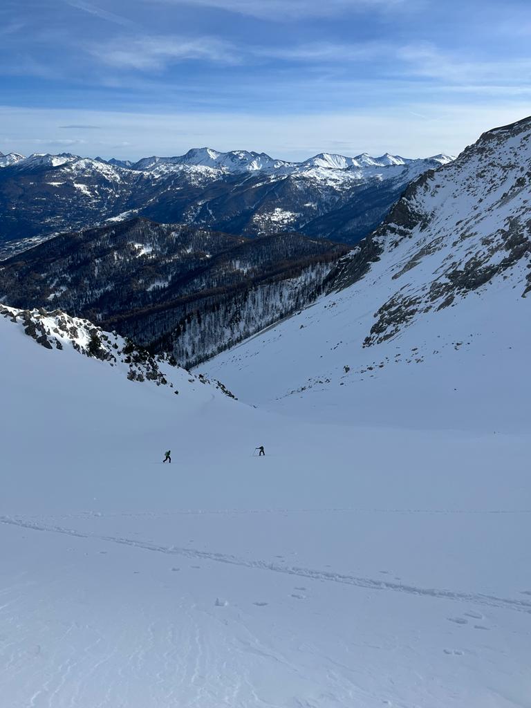 In discesa seguire grossomodo la linea di salita (viene naturale proseguire la sciata seguendo la massima pendenza circa 50 m di dislivello sotto il bivacco) – 35°/40° – 300 m -.
