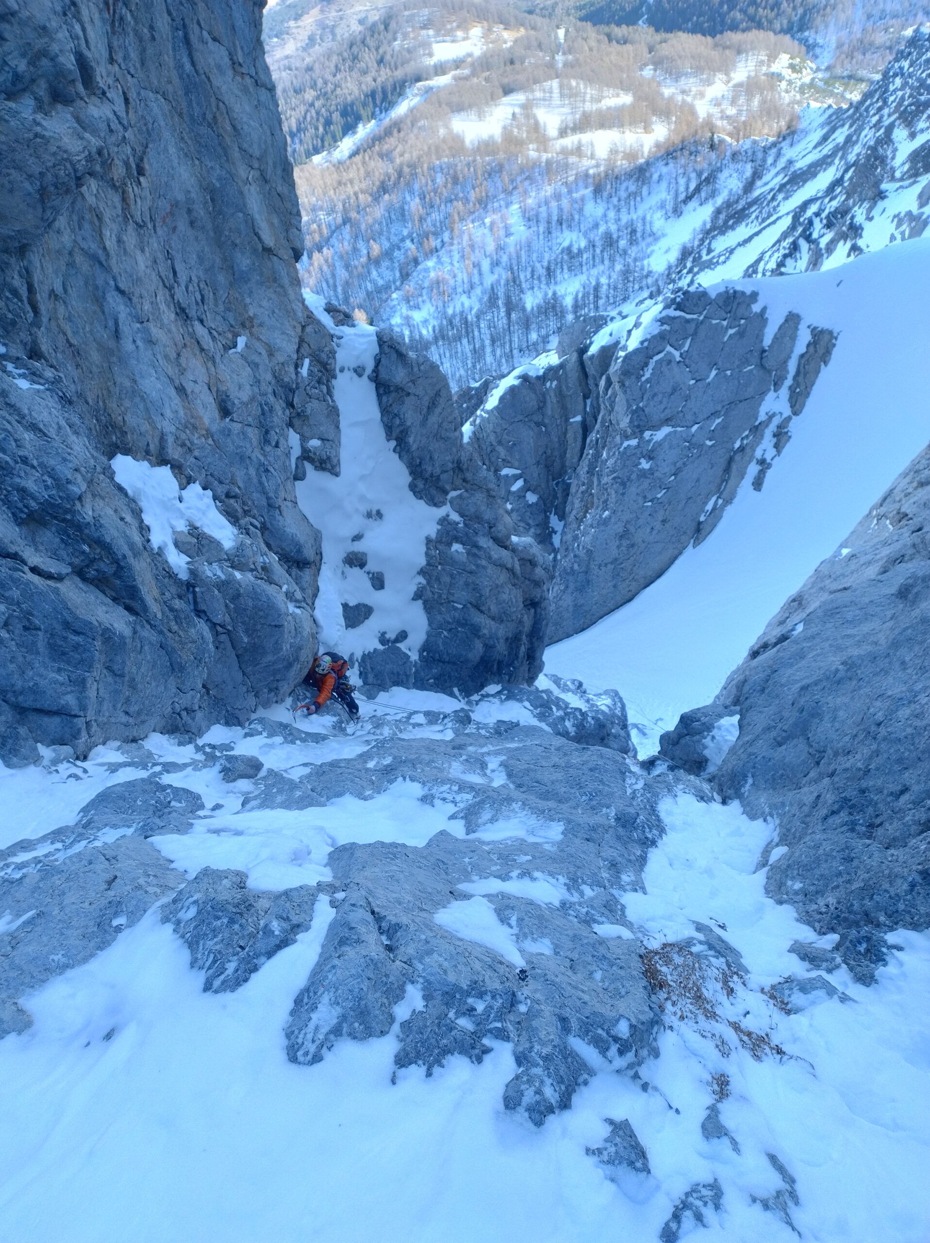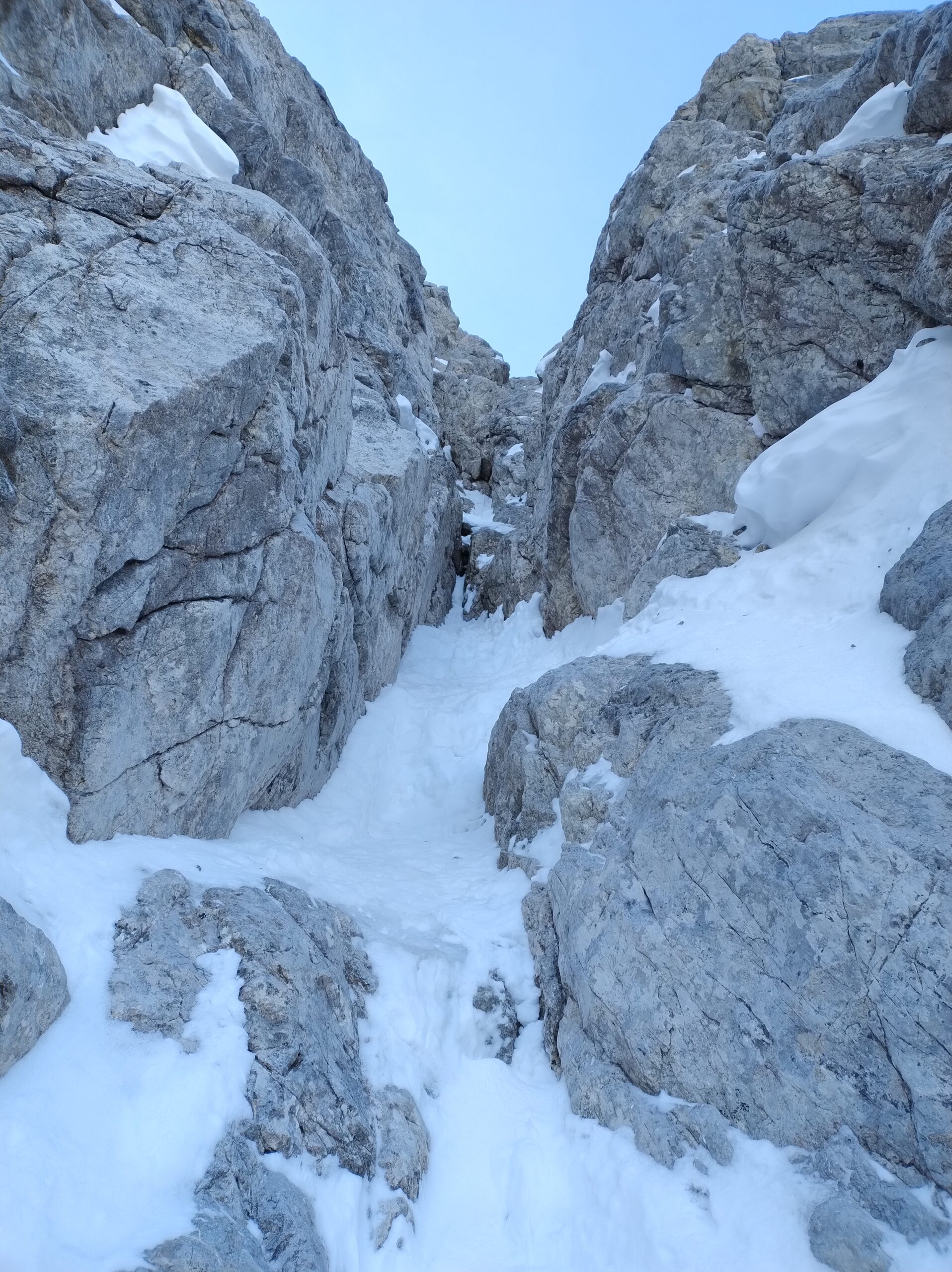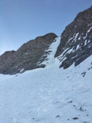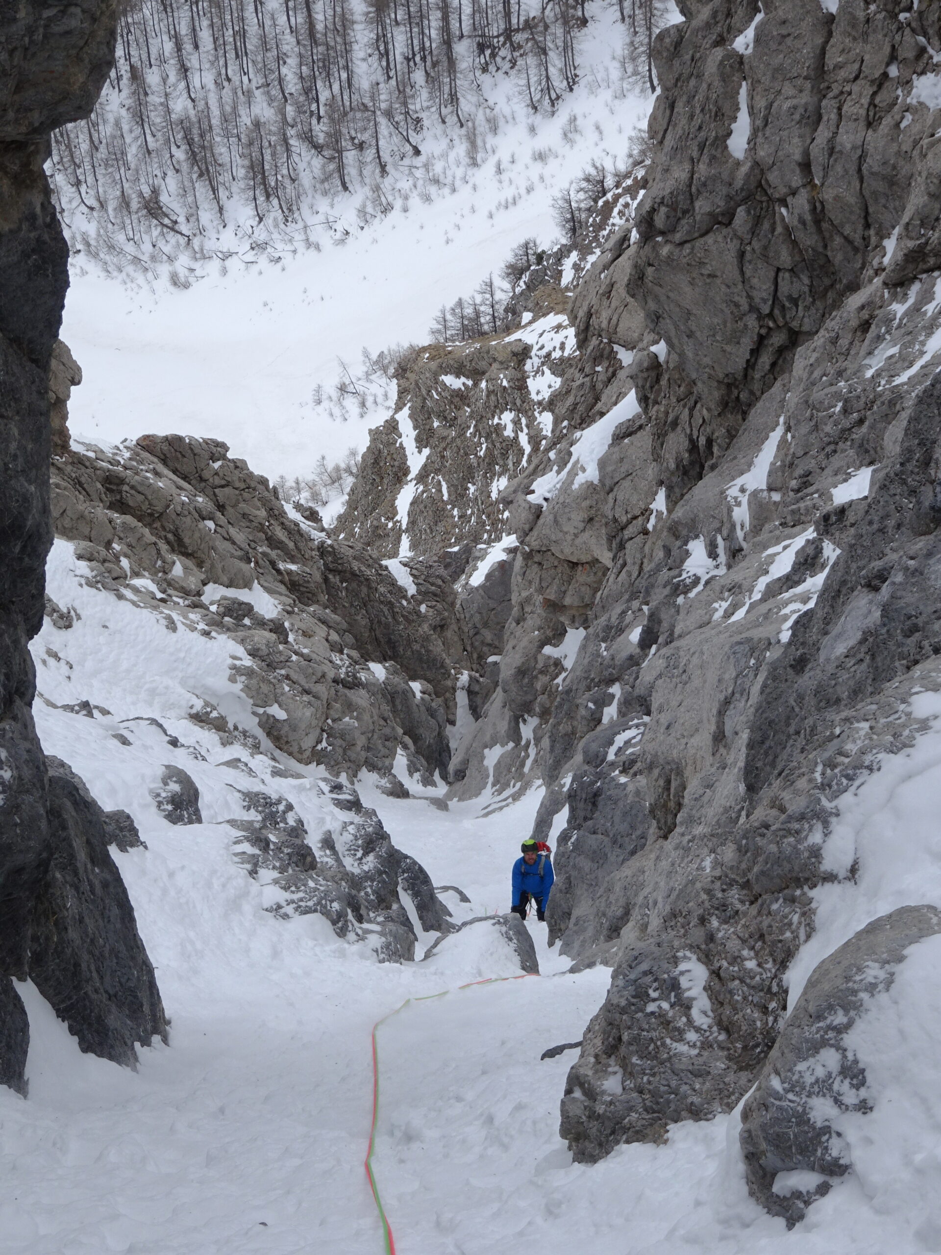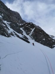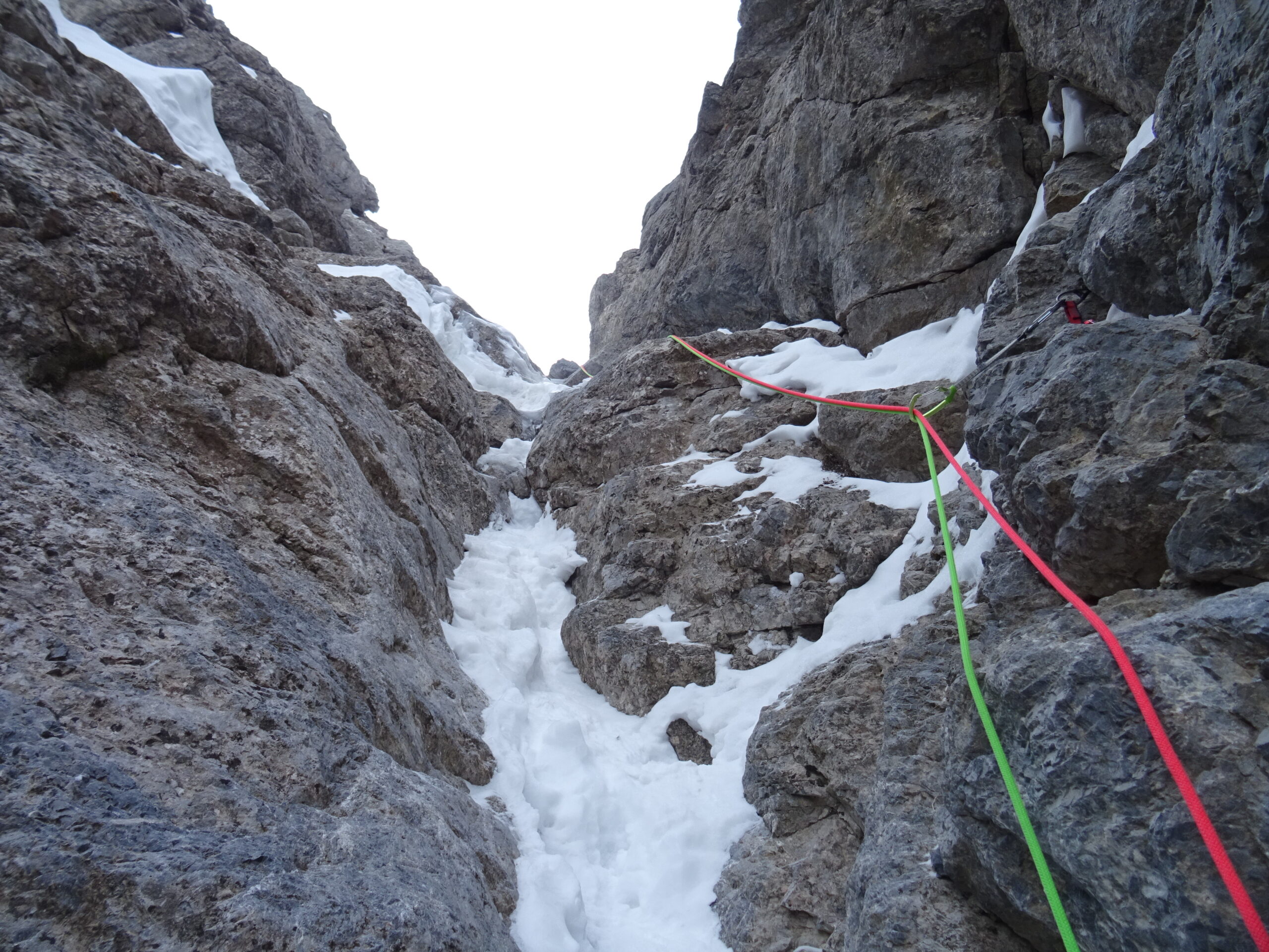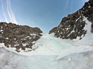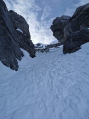 Finita la cascata, se si decide di continuare, proseguire lungo il facile canale nevoso lungo 150 m, che si va a restringere. Poco prima del suo termine, si intuiscono a dx dei camini. Sostarne alla base.