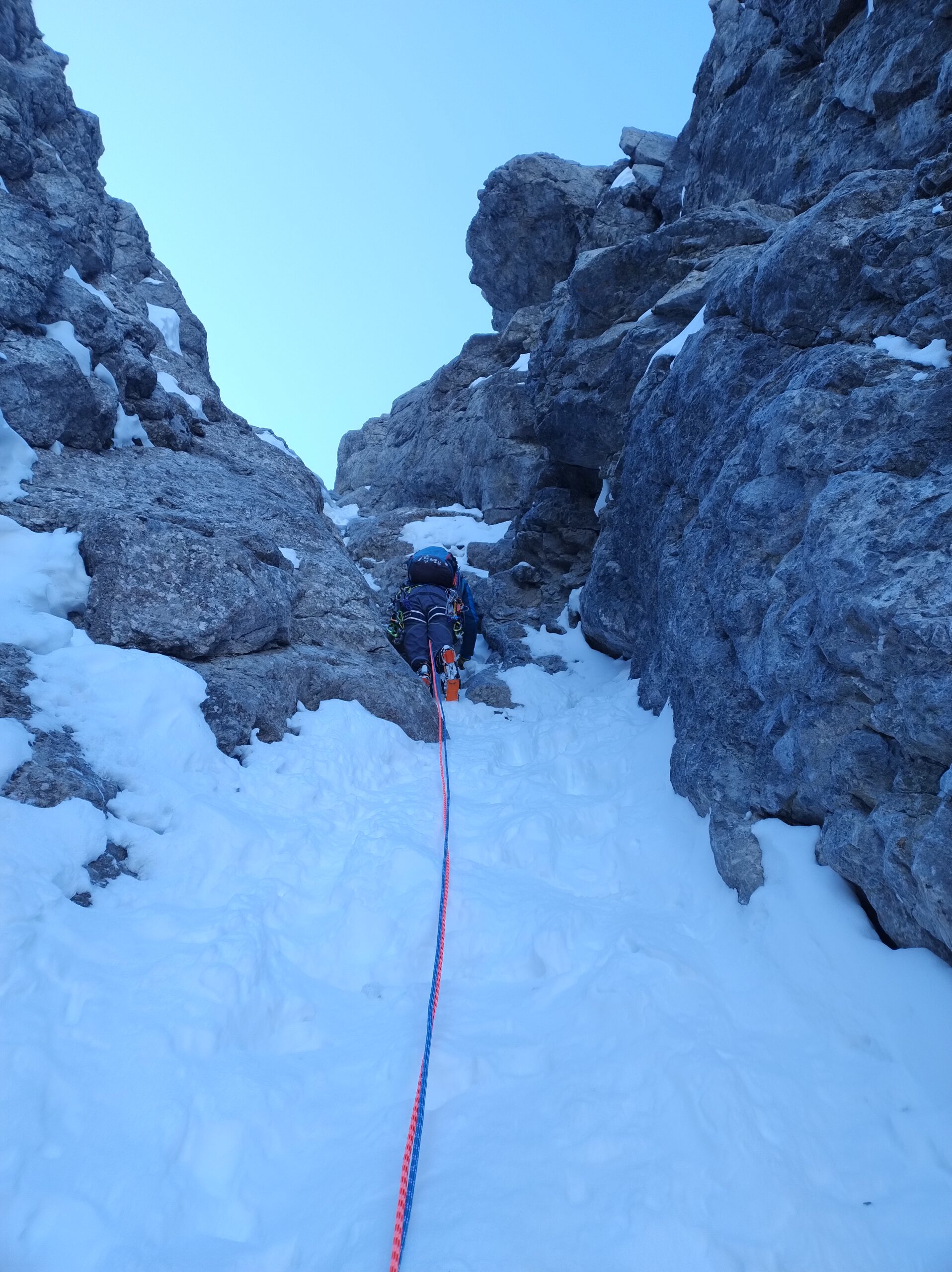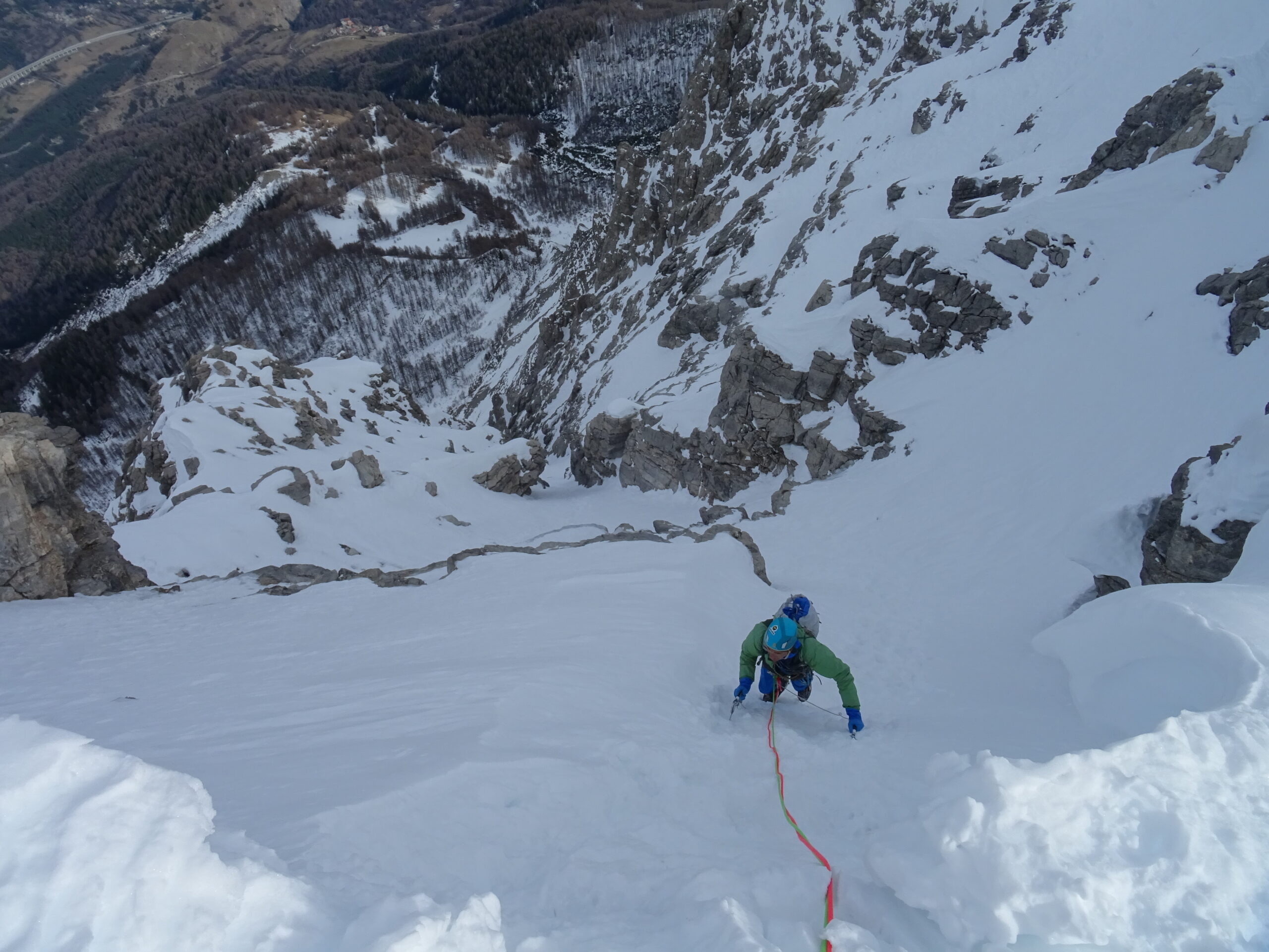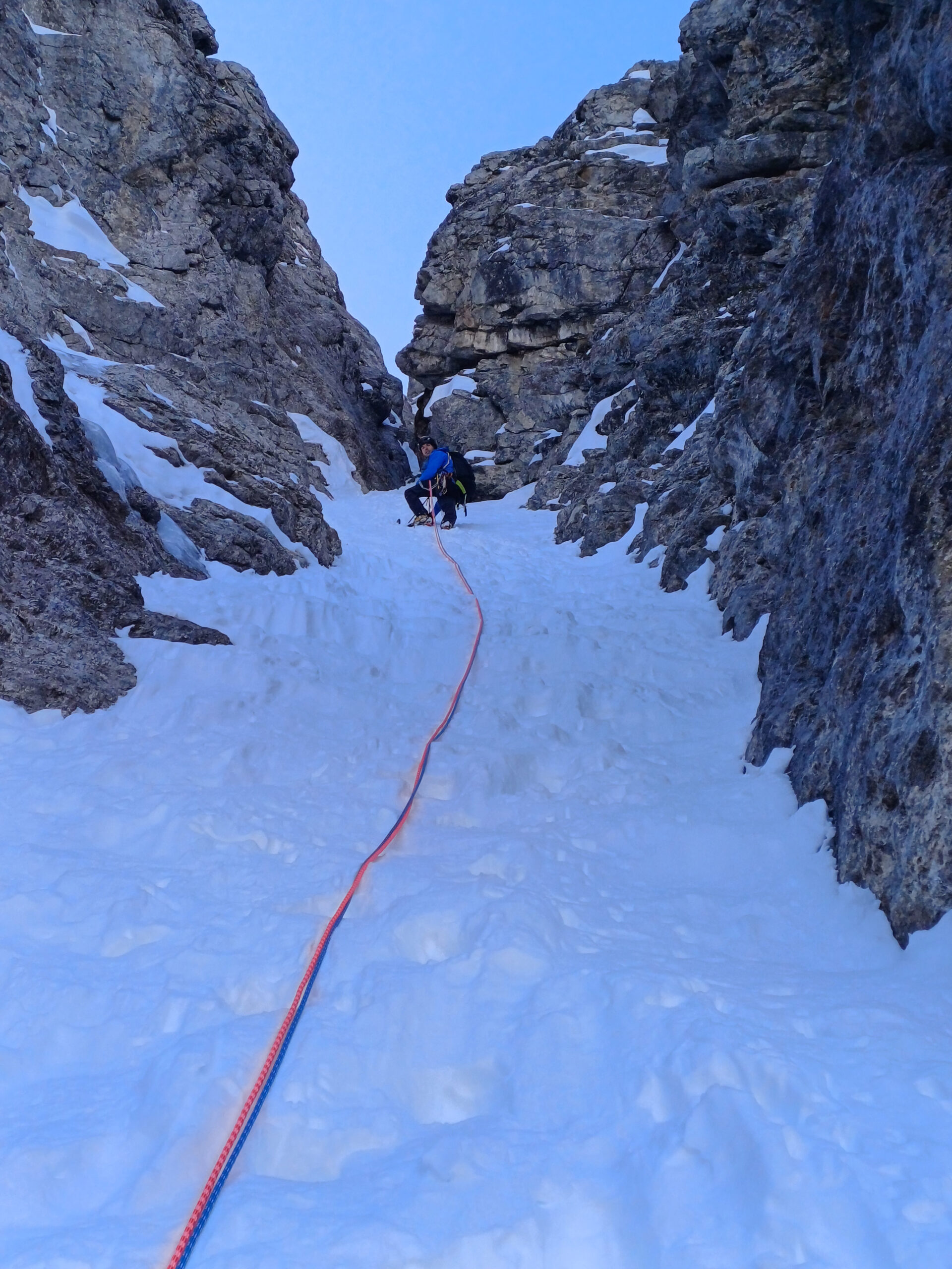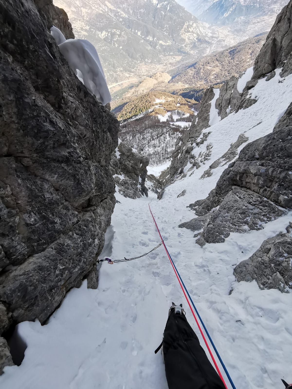 Finita la cascata, se si decide di continuare, proseguire lungo il facile canale nevoso lungo 150 m, che si va a restringere. Poco prima del suo termine, si intuiscono a dx dei camini. Sostarne alla base.