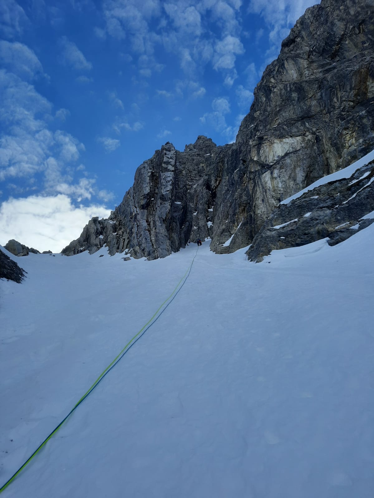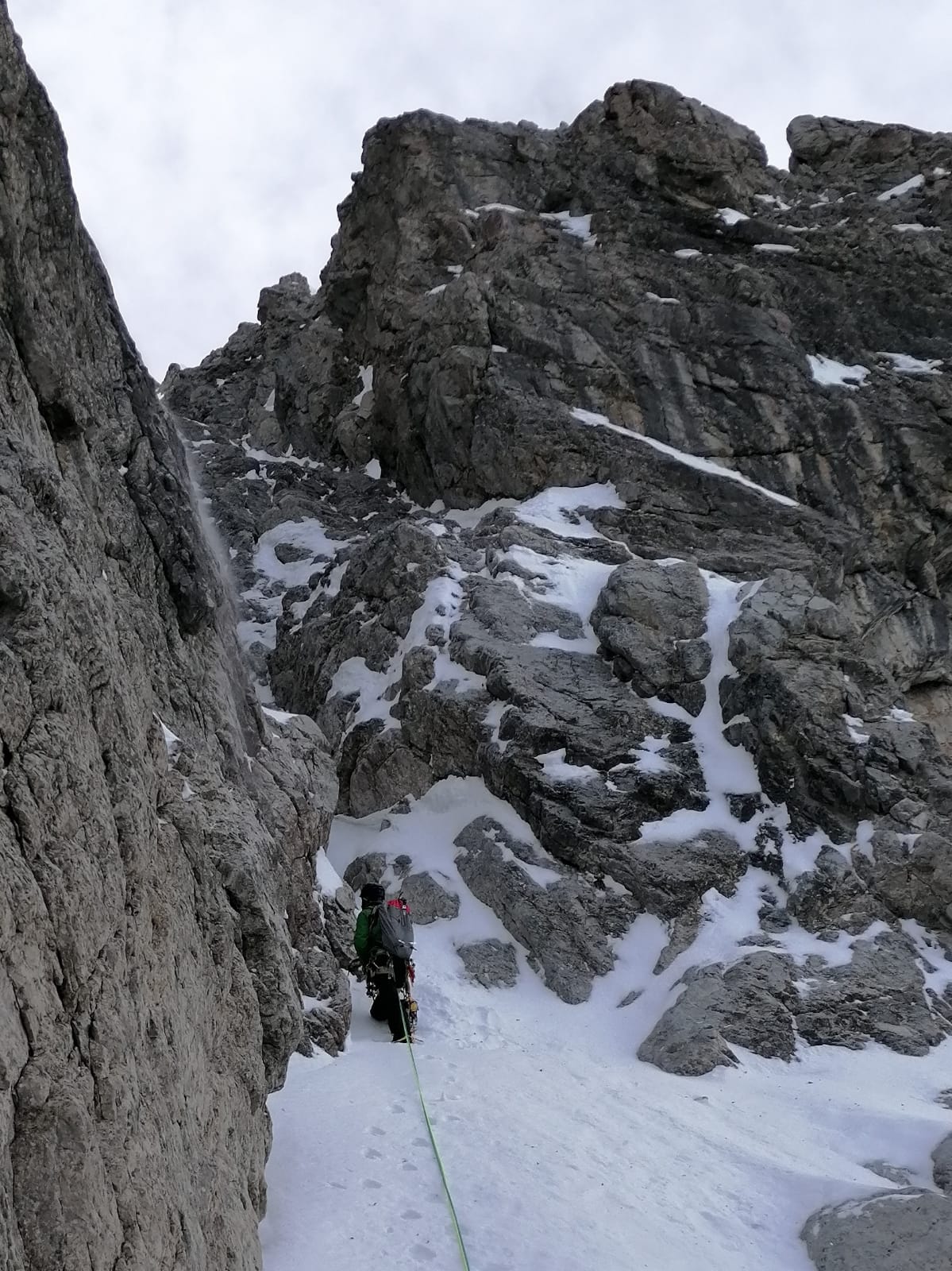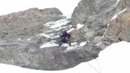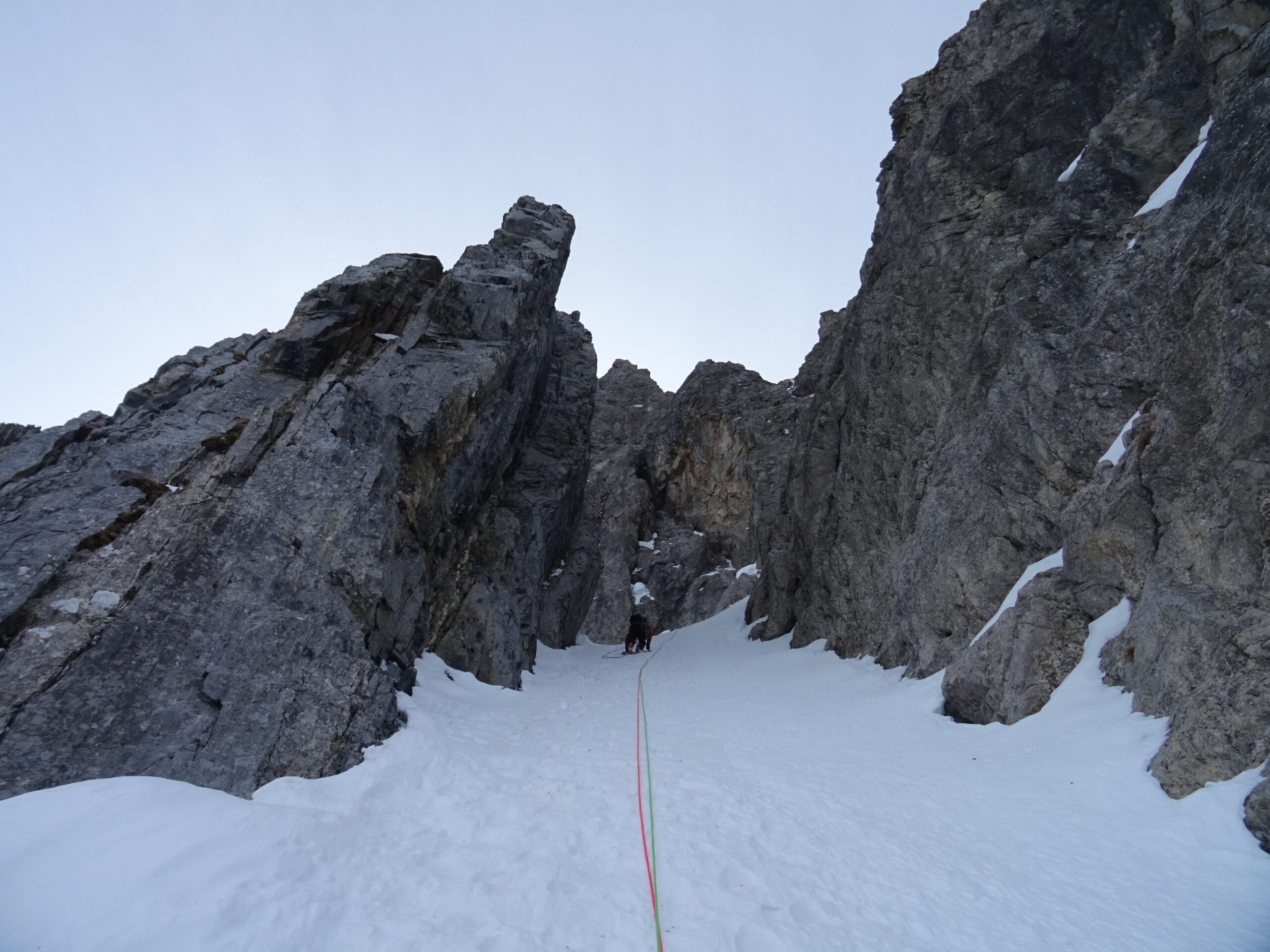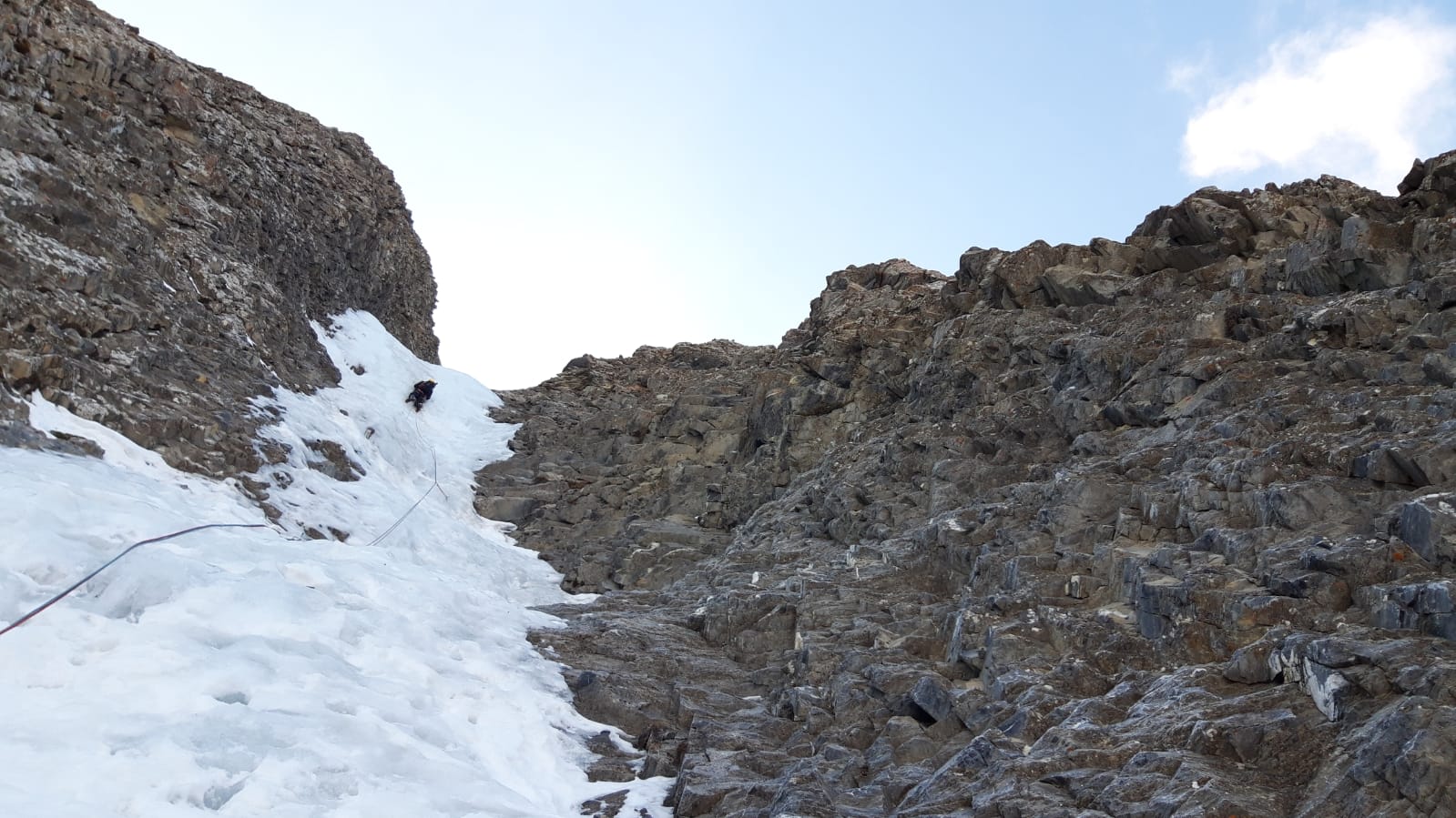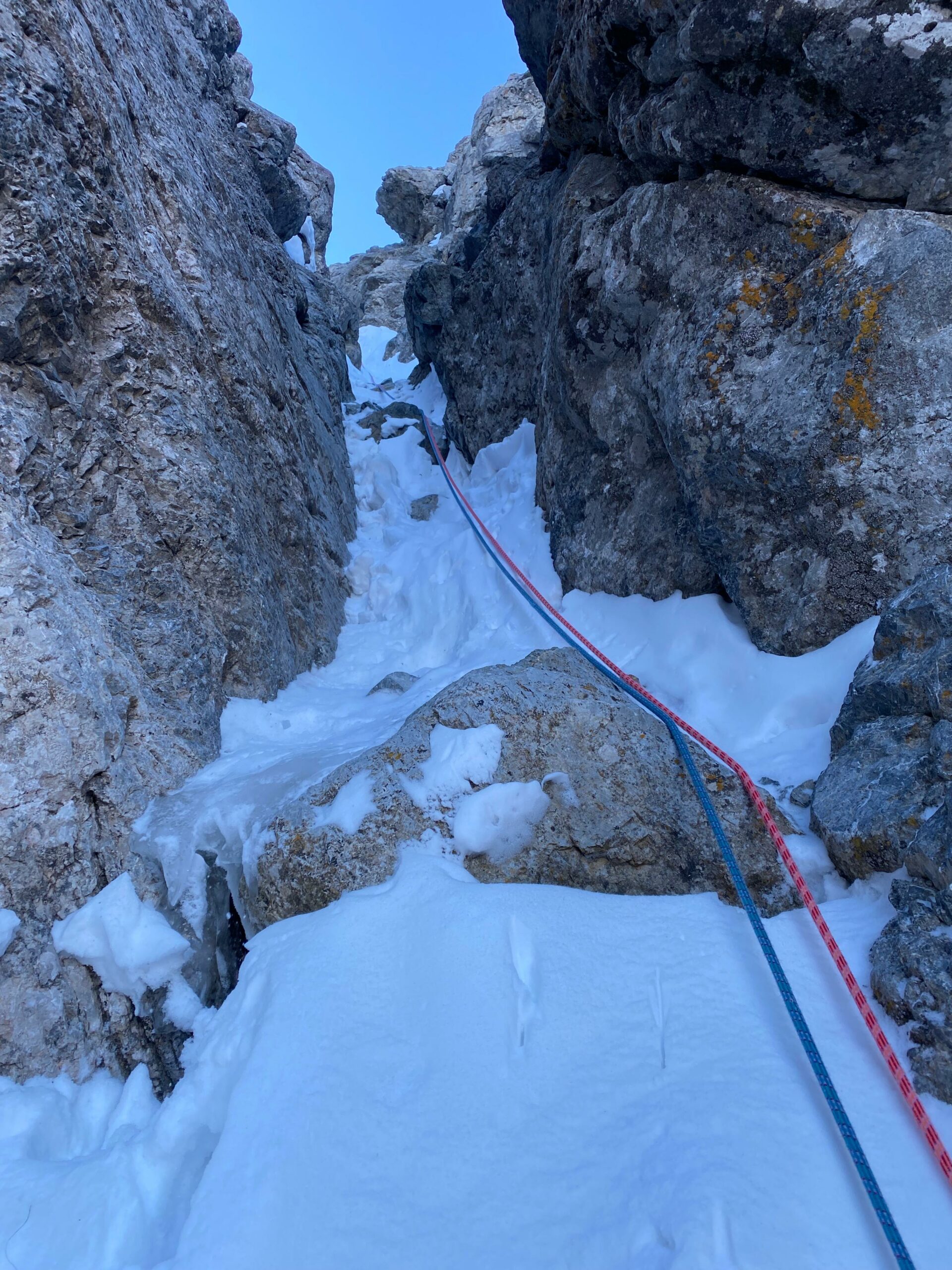 Finita la cascata, se si decide di continuare, proseguire lungo il facile canale nevoso lungo 150 m, che si va a restringere. Poco prima del suo termine, si intuiscono a dx dei camini. Sostarne alla base.