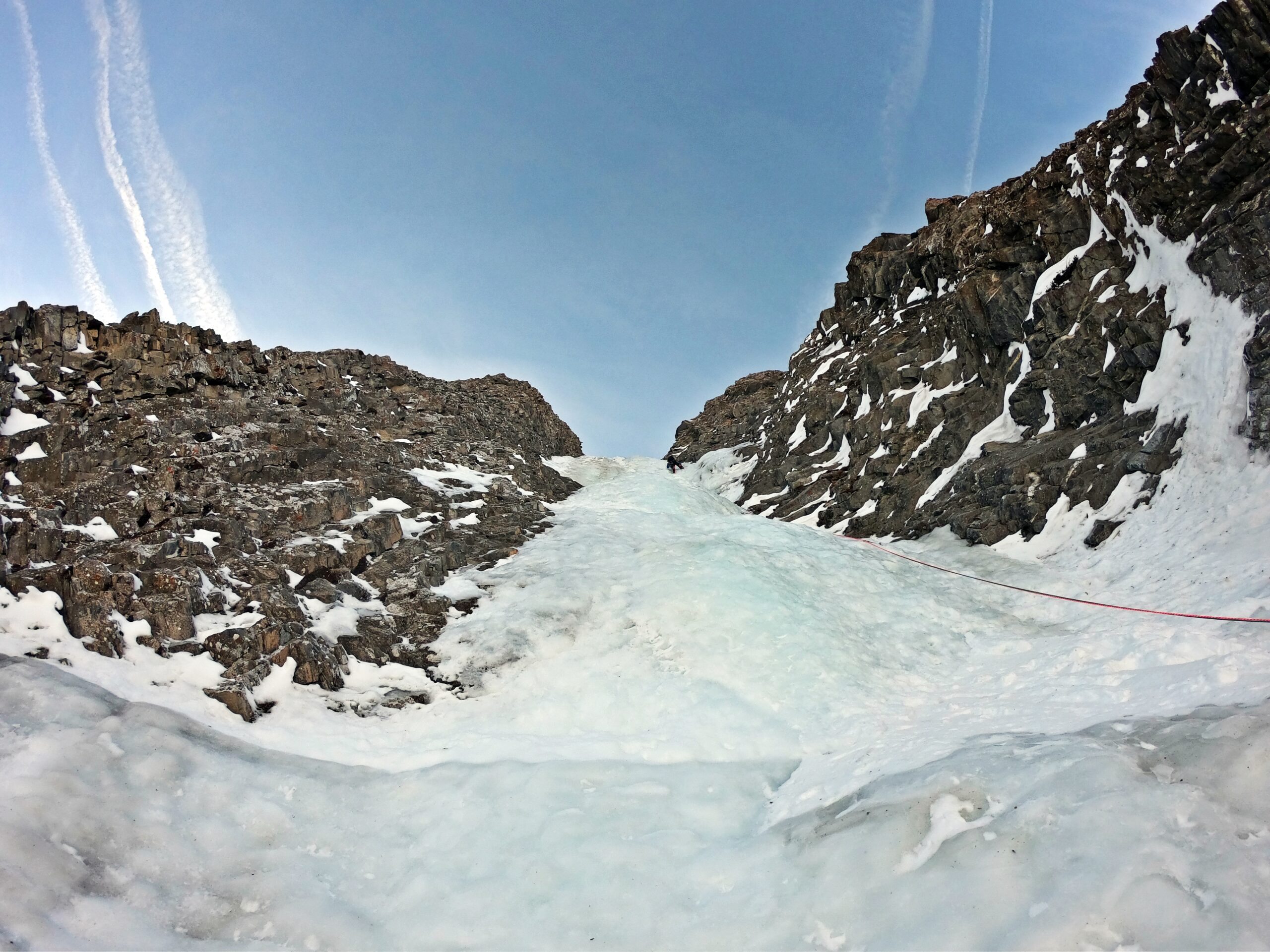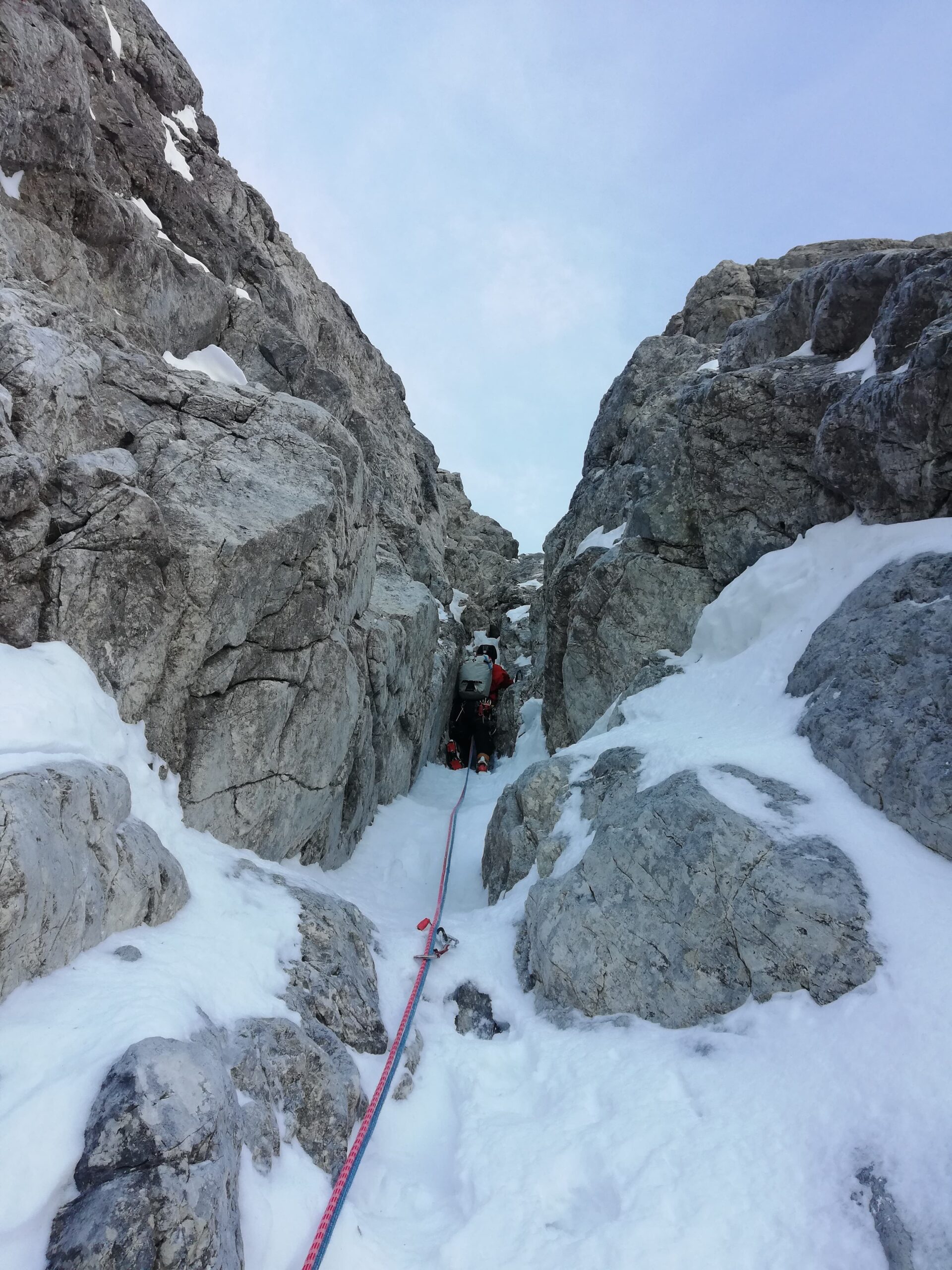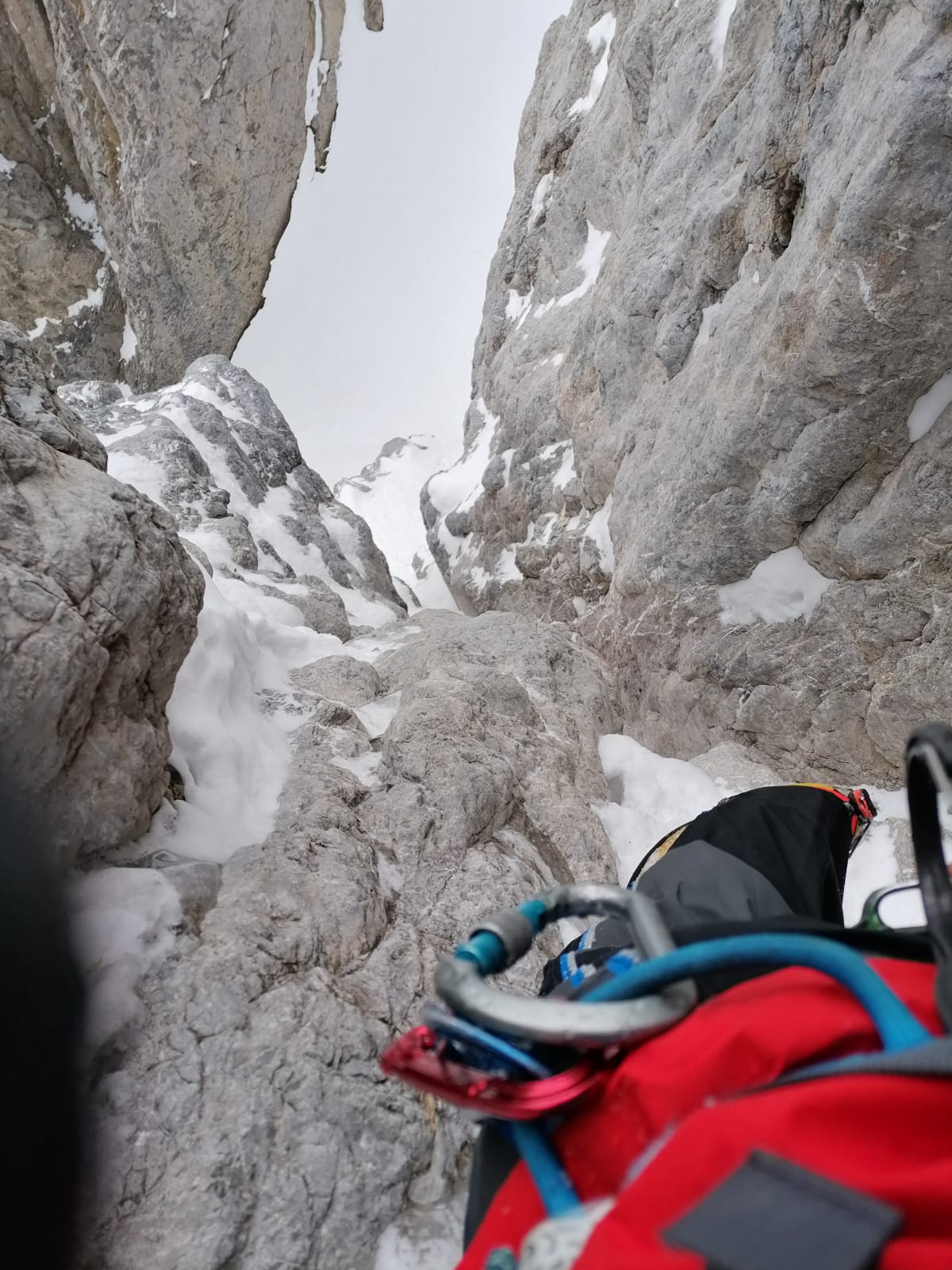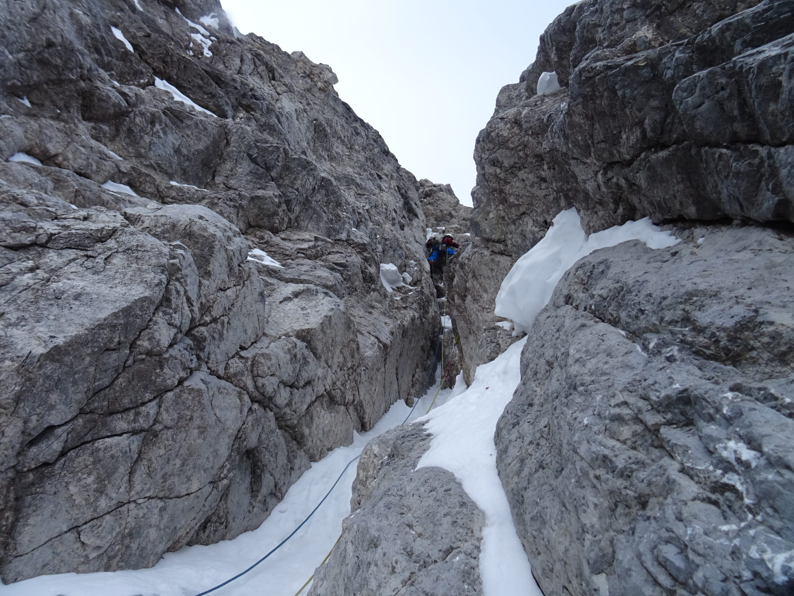 Finita la cascata, se si decide di continuare, proseguire lungo il facile canale nevoso lungo 150 m, che si va a restringere. Poco prima del suo termine, si intuiscono a dx dei camini. Sostarne alla base.