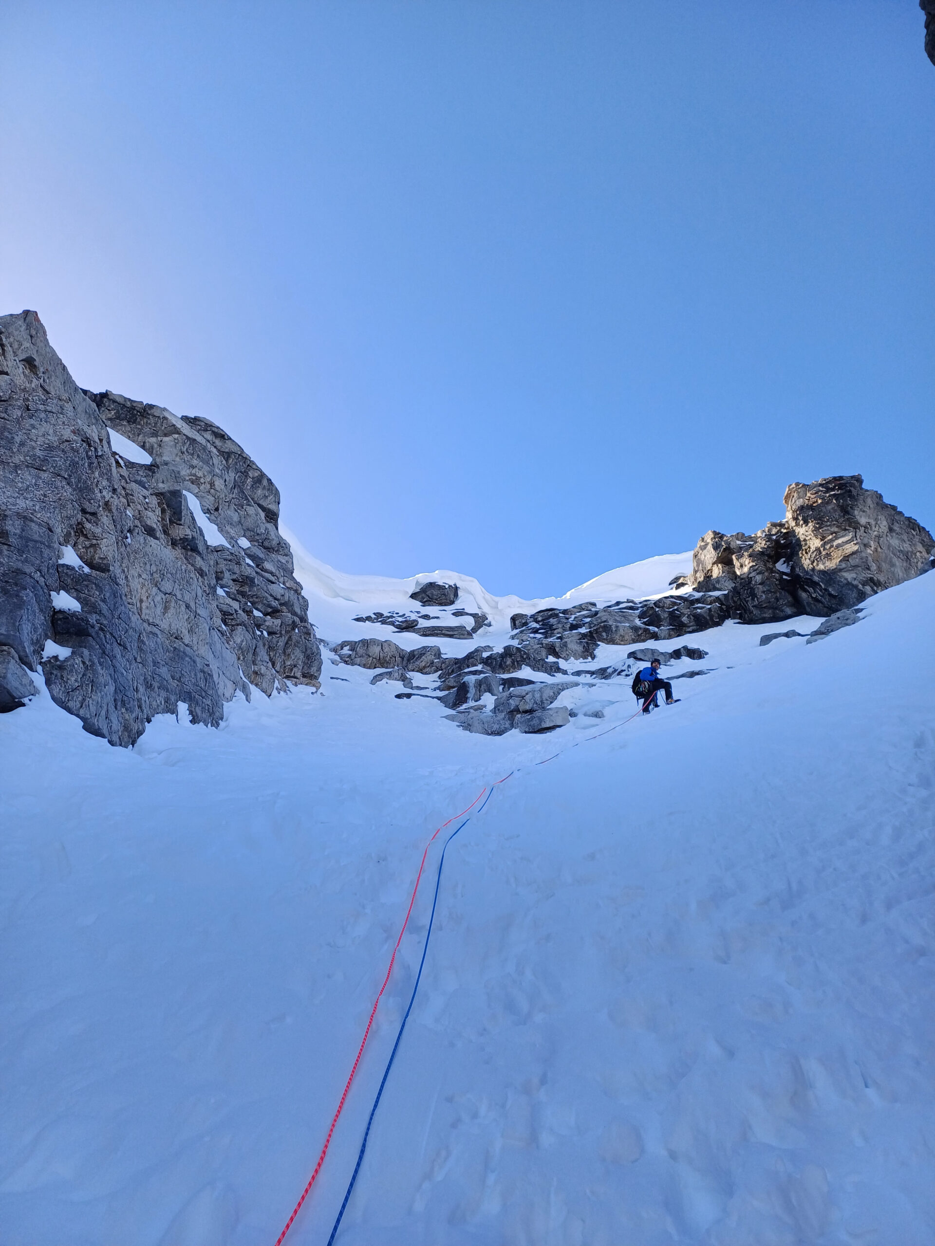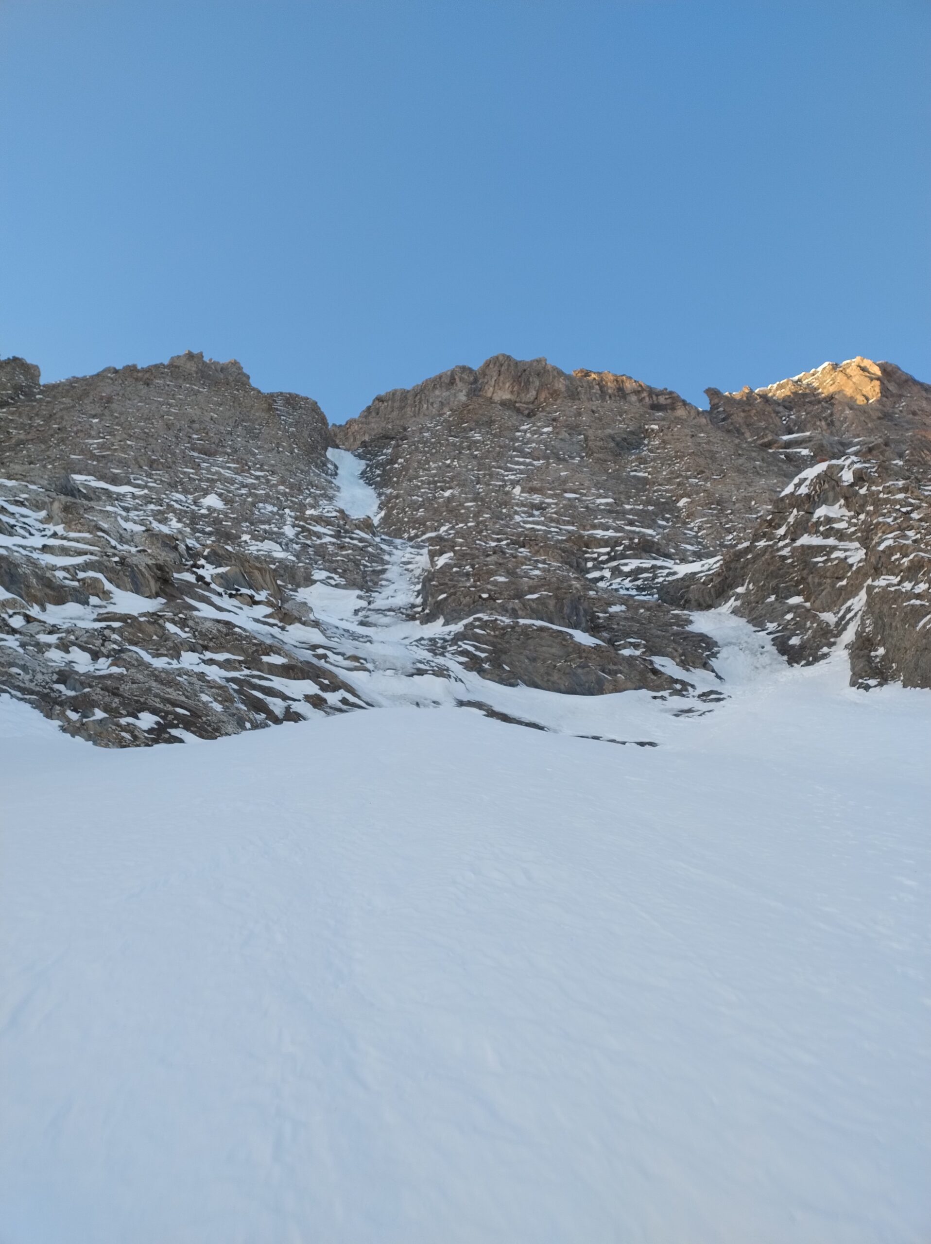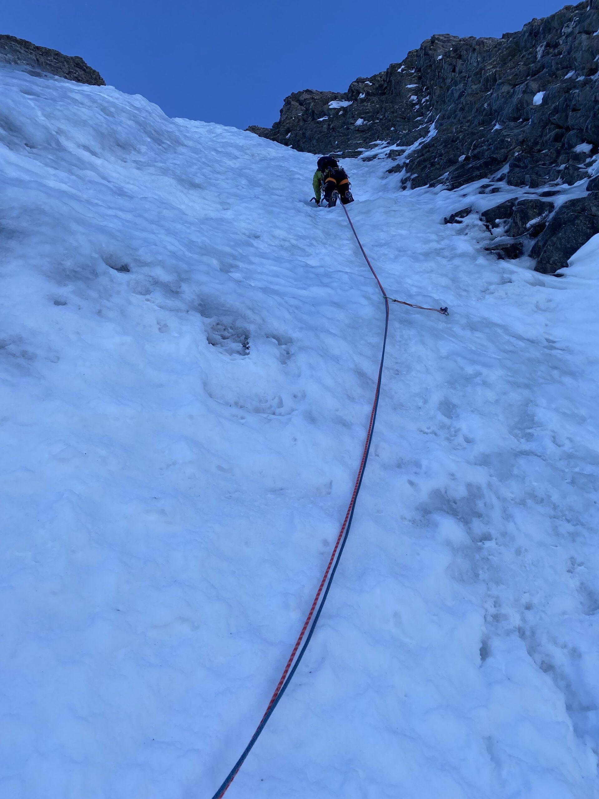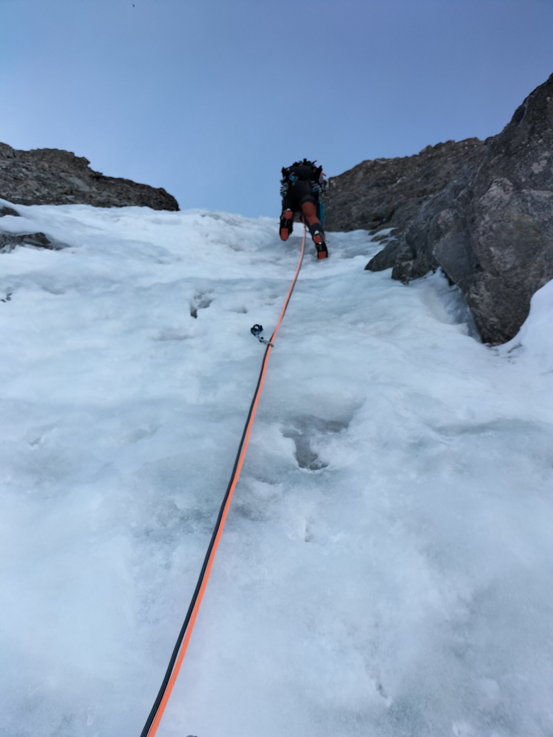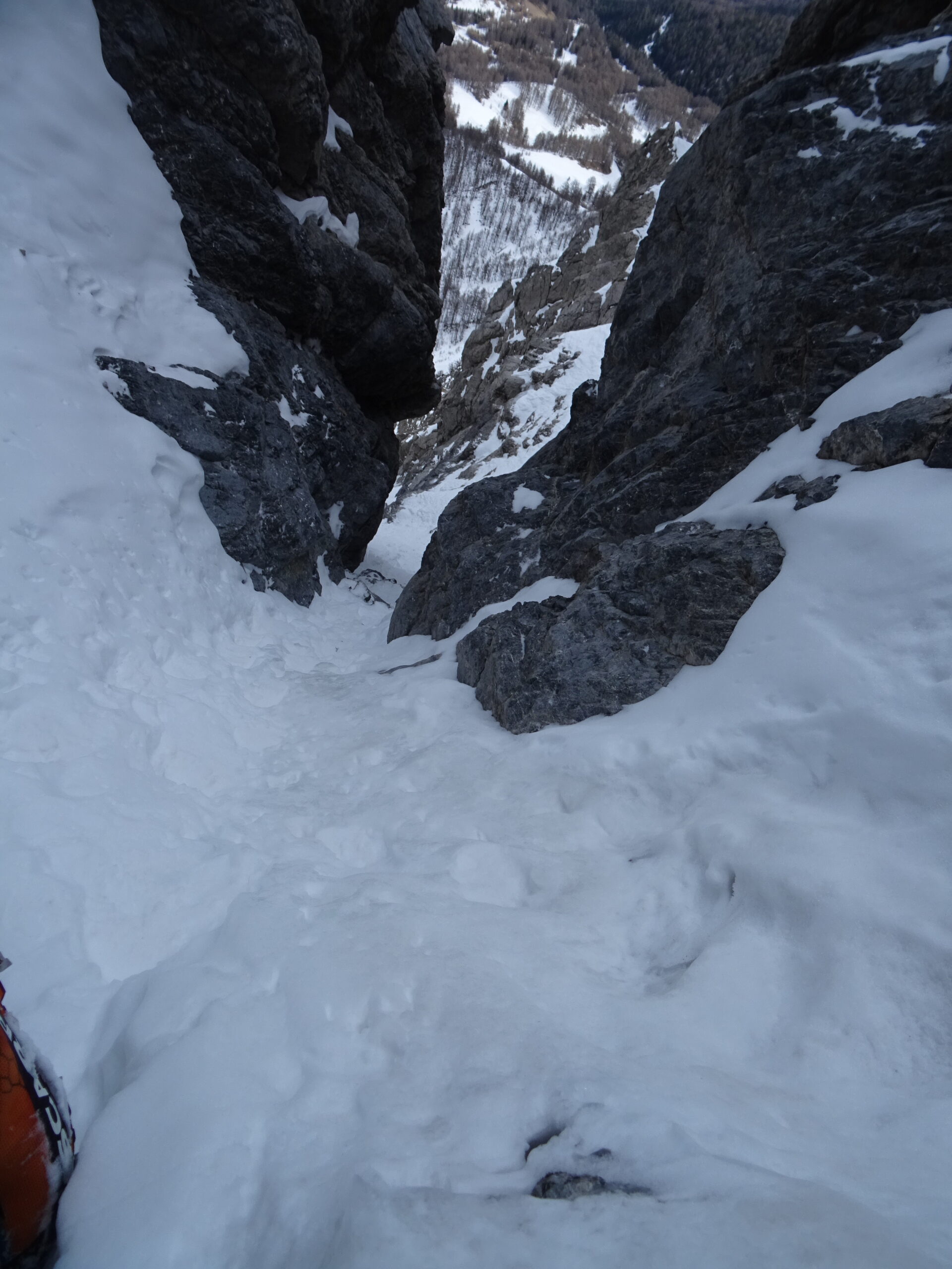 Si entra così nella stretta e impervia goulotte scovata da Grassi. Un passo di IV+ permette l’uscita dalla strettoia, seguono tratti di misto più o meno difficili a seconda delle condizioni. Si sosta a piacimento (50m). Si accede dunque al canale nevoso vero e proprio, inclinato a 50° e con qualche strettoia ancora ostica se pur breve, si esce in cresta (cornice spesso delicata) fra la Grand’Hoche e la Guglia d’Arbour, a breve distanza da quest’ultima.
