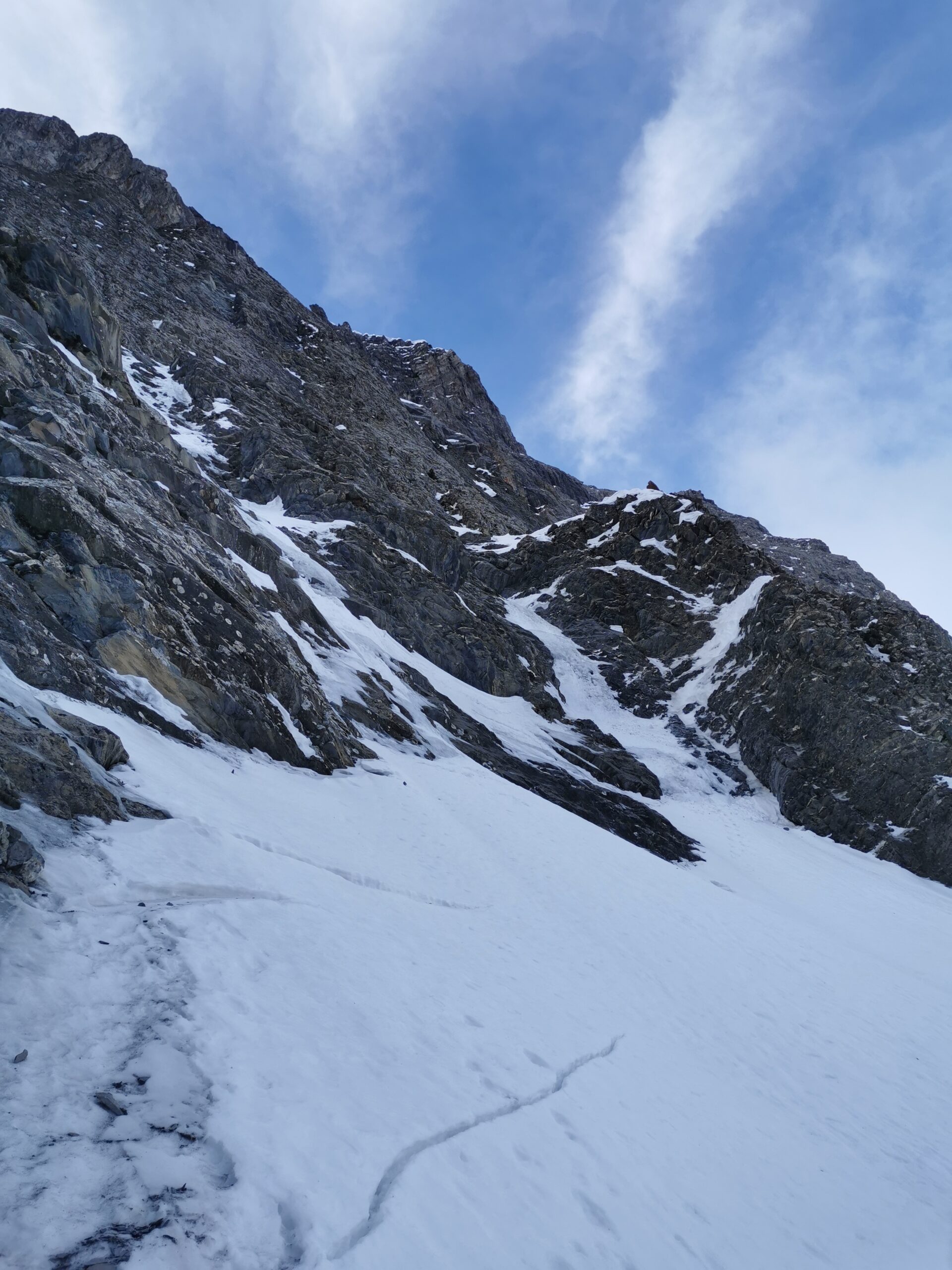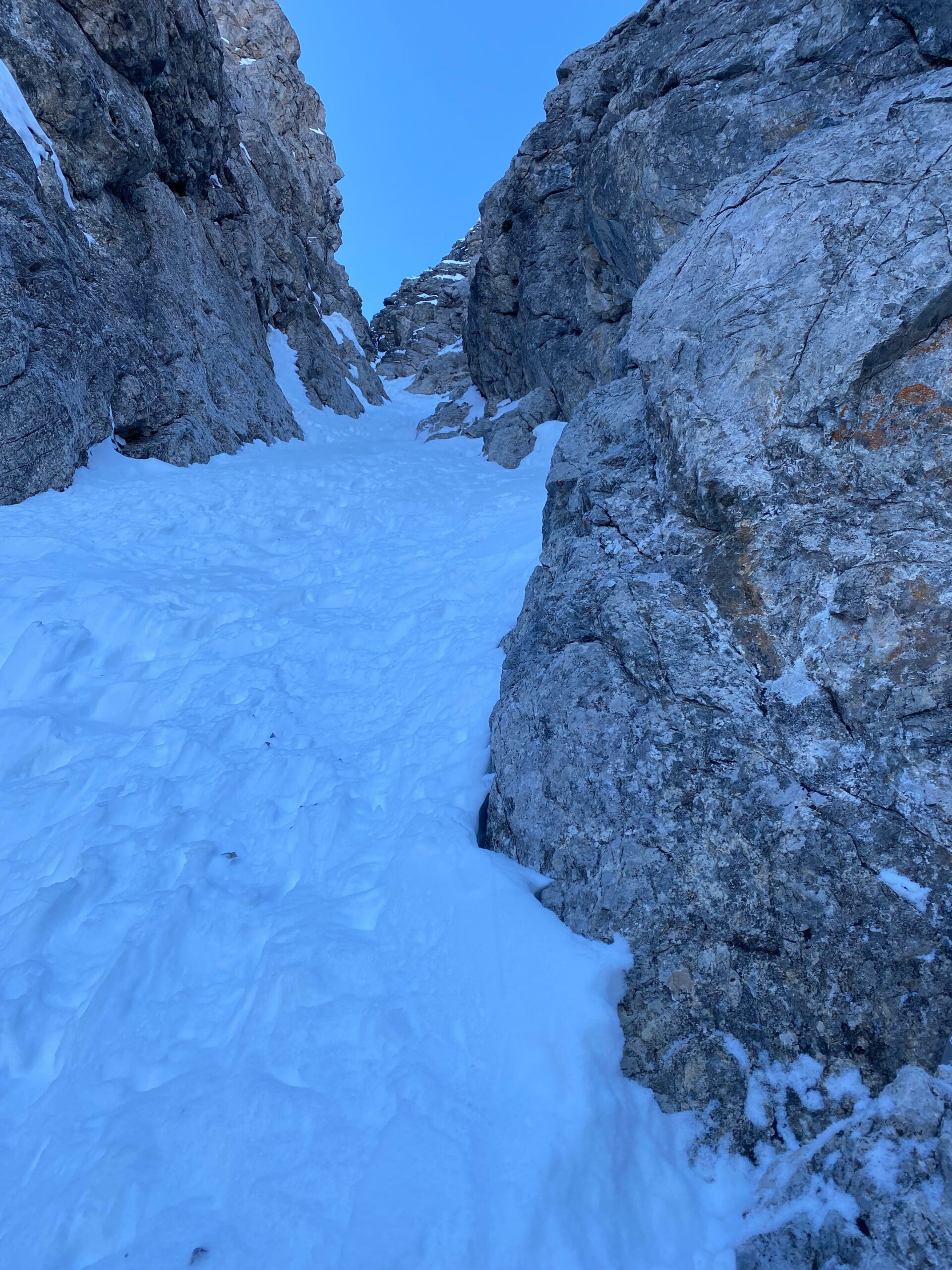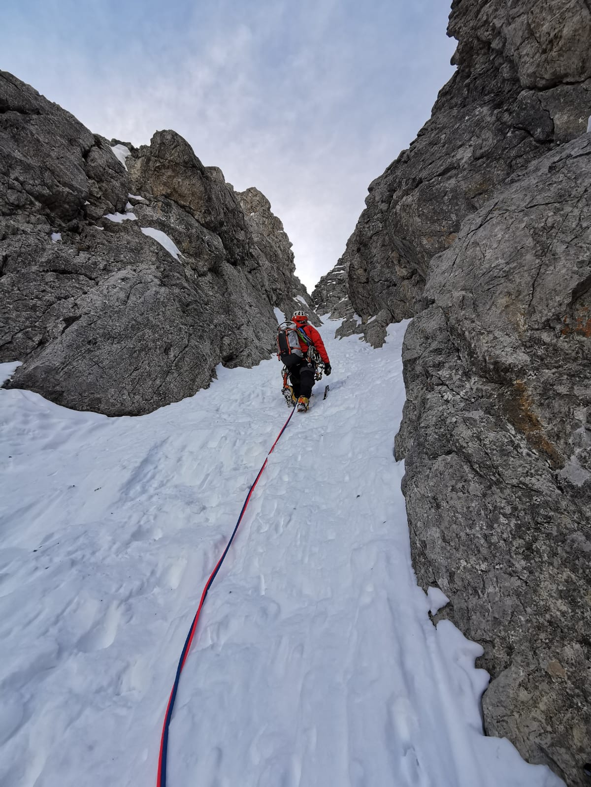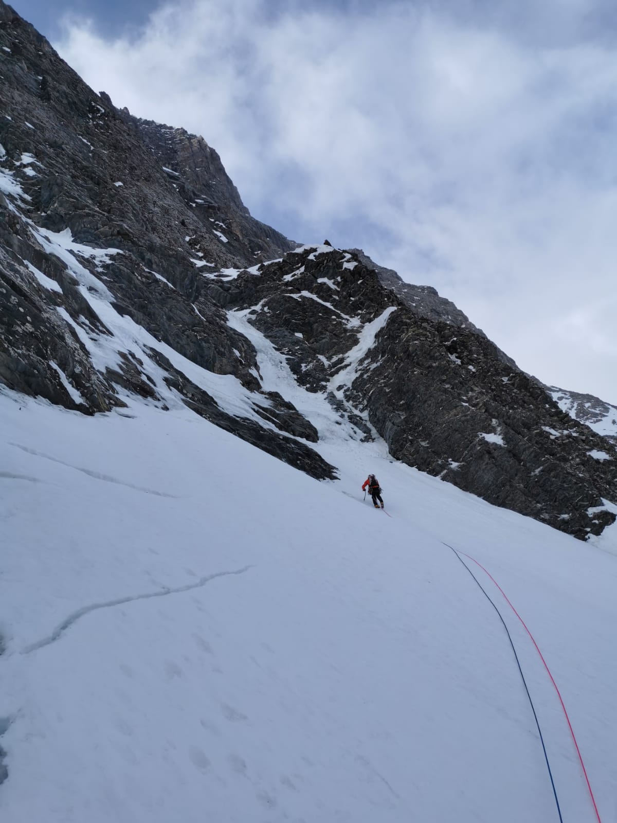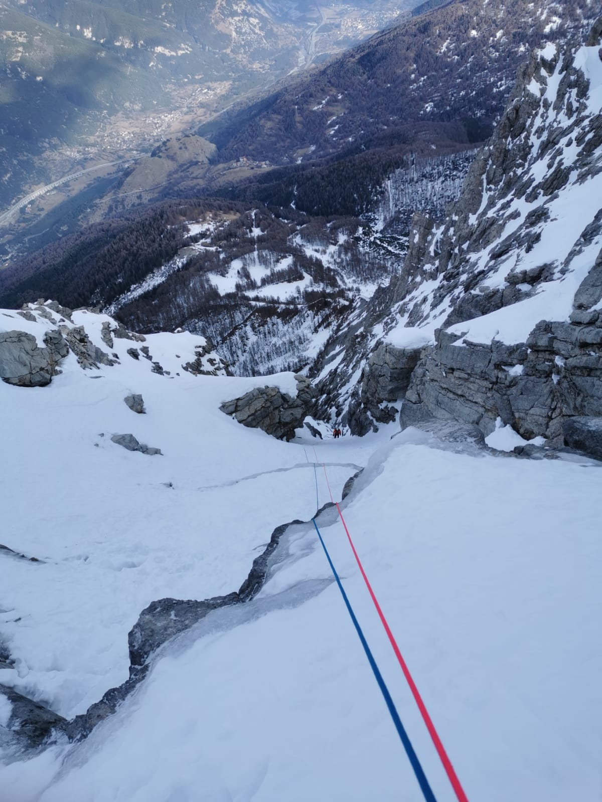 Si entra così nella stretta e impervia goulotte scovata da Grassi. Un passo di IV+ permette l’uscita dalla strettoia, seguono tratti di misto più o meno difficili a seconda delle condizioni. Si sosta a piacimento (50m). Si accede dunque al canale nevoso vero e proprio, inclinato a 50° e con qualche strettoia ancora ostica se pur breve, si esce in cresta (cornice spesso delicata) fra la Grand’Hoche e la Guglia d’Arbour, a breve distanza da quest’ultima.