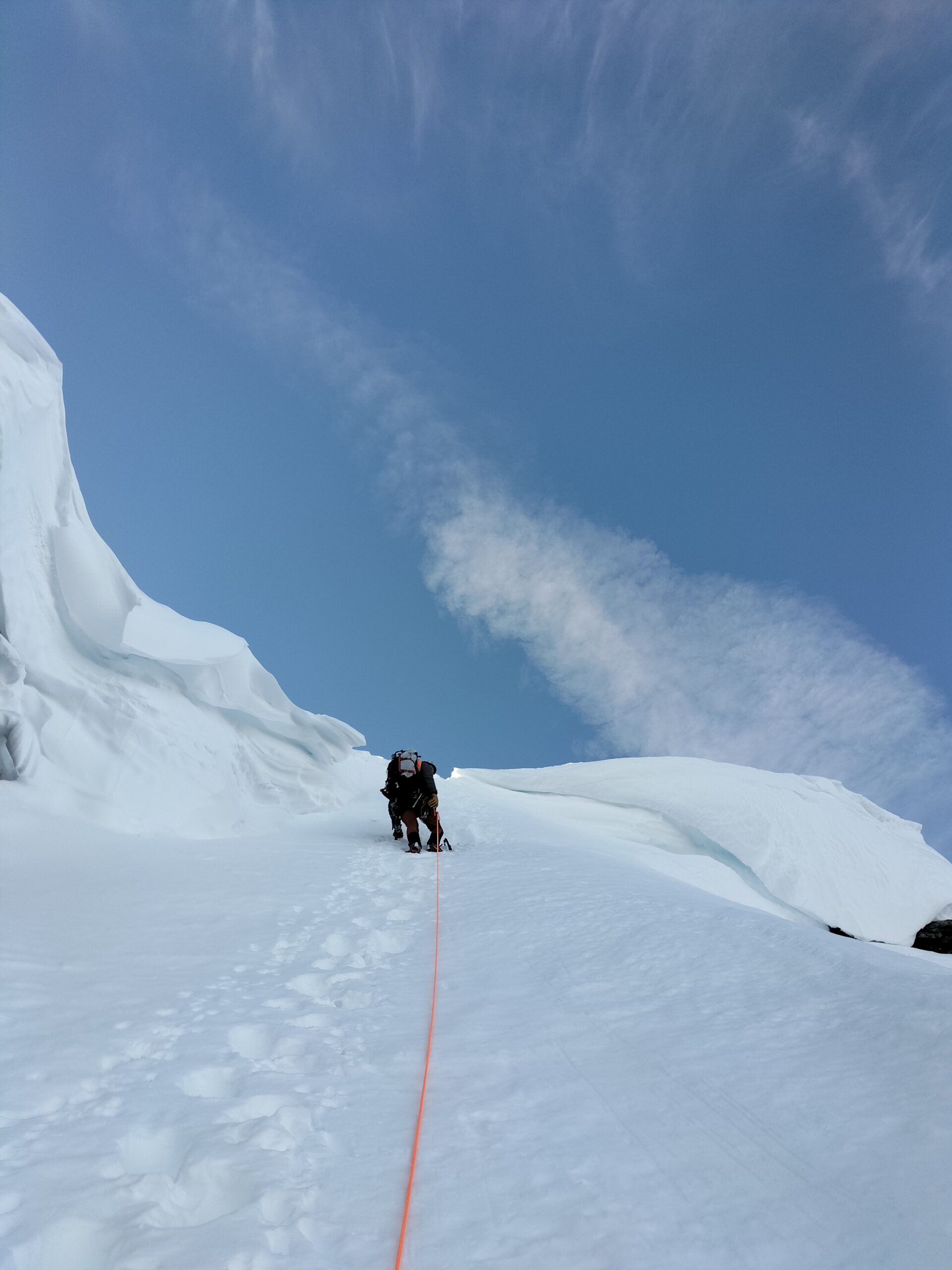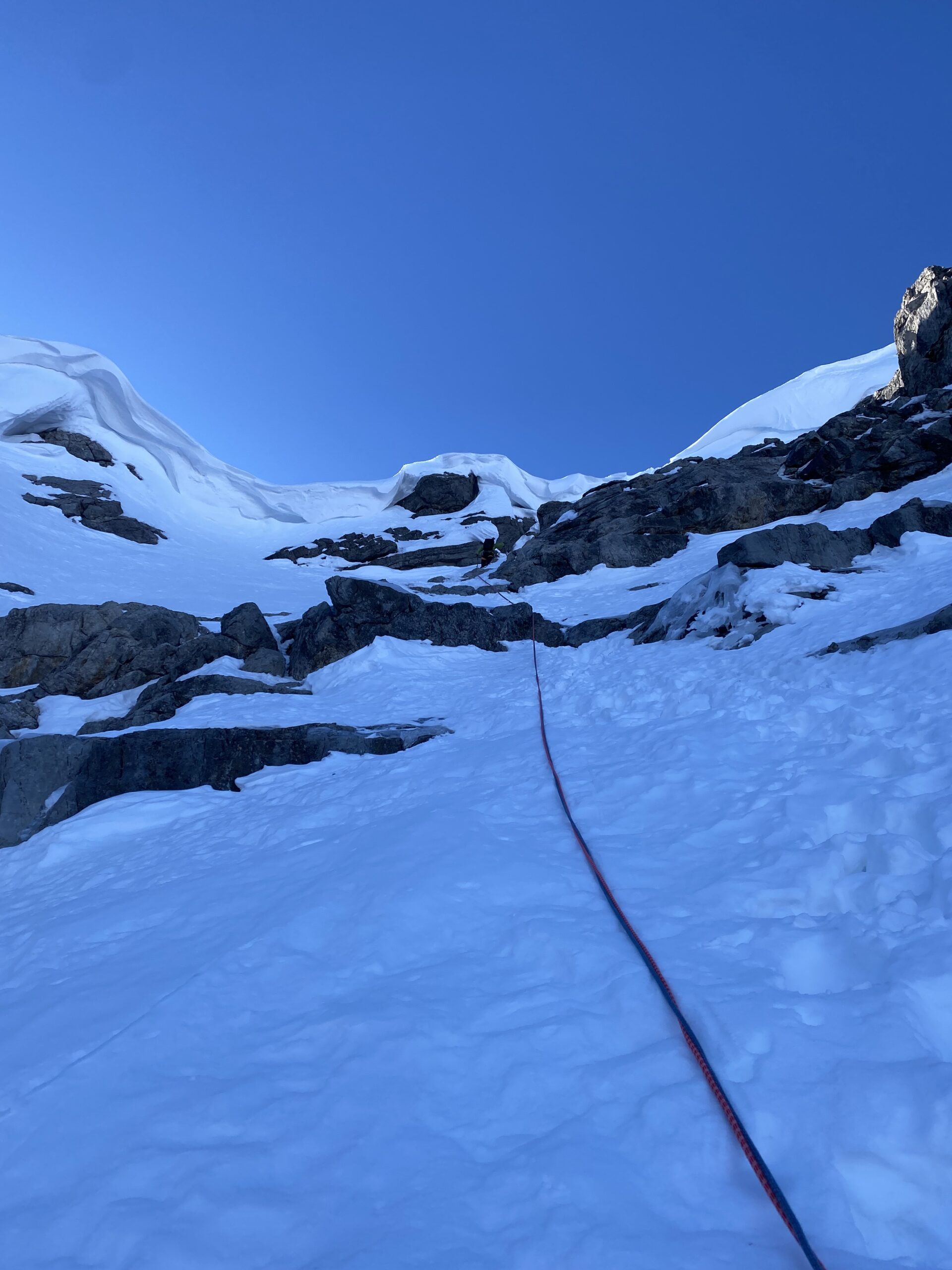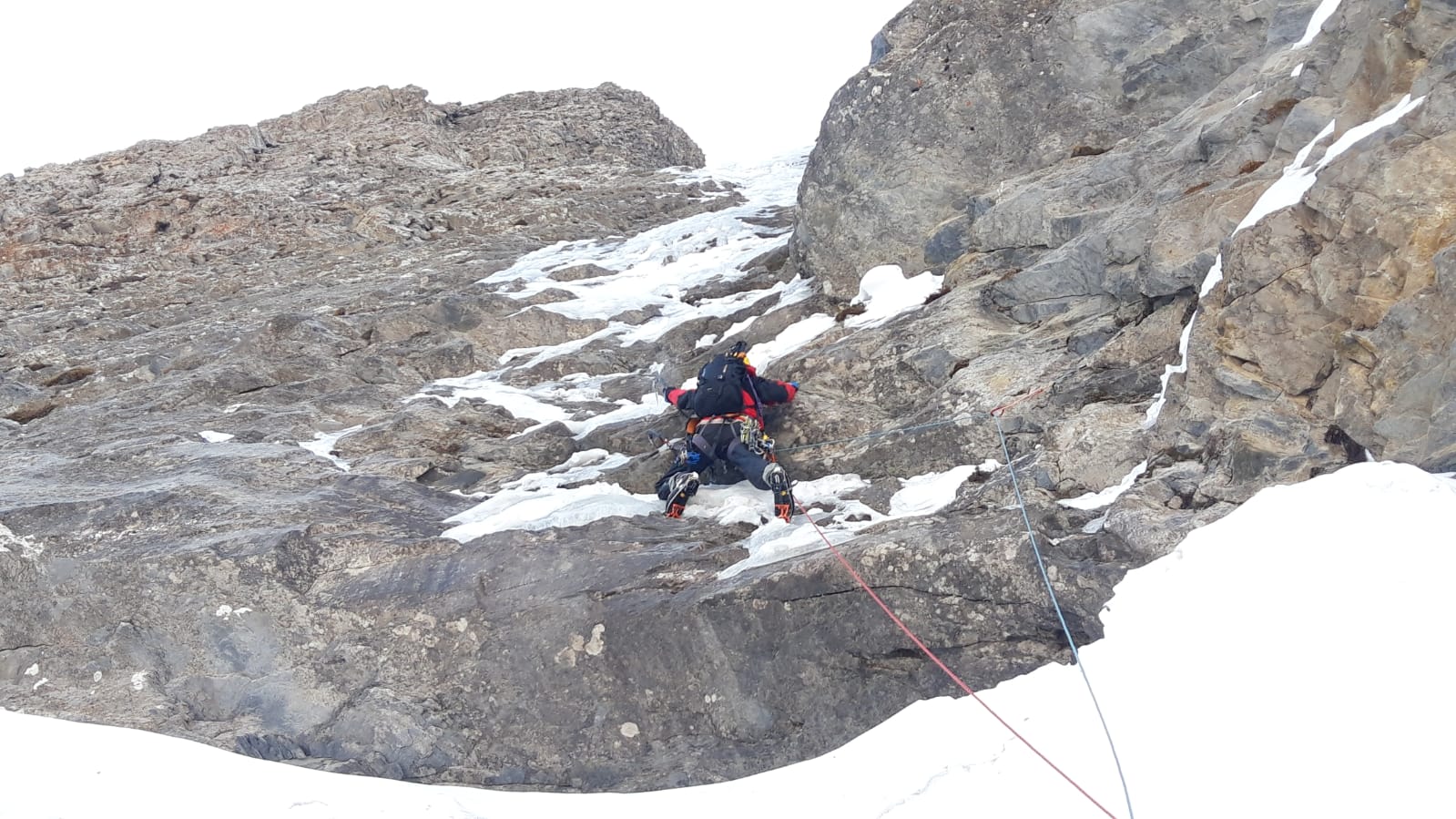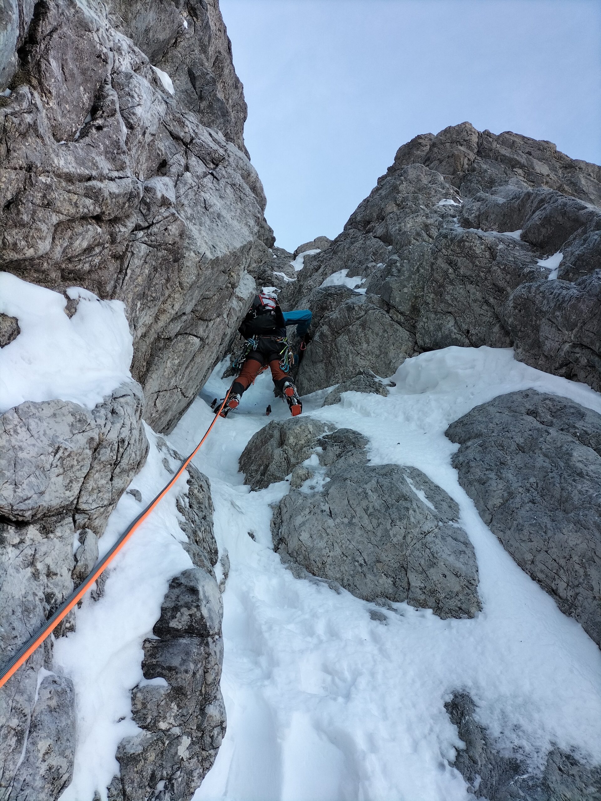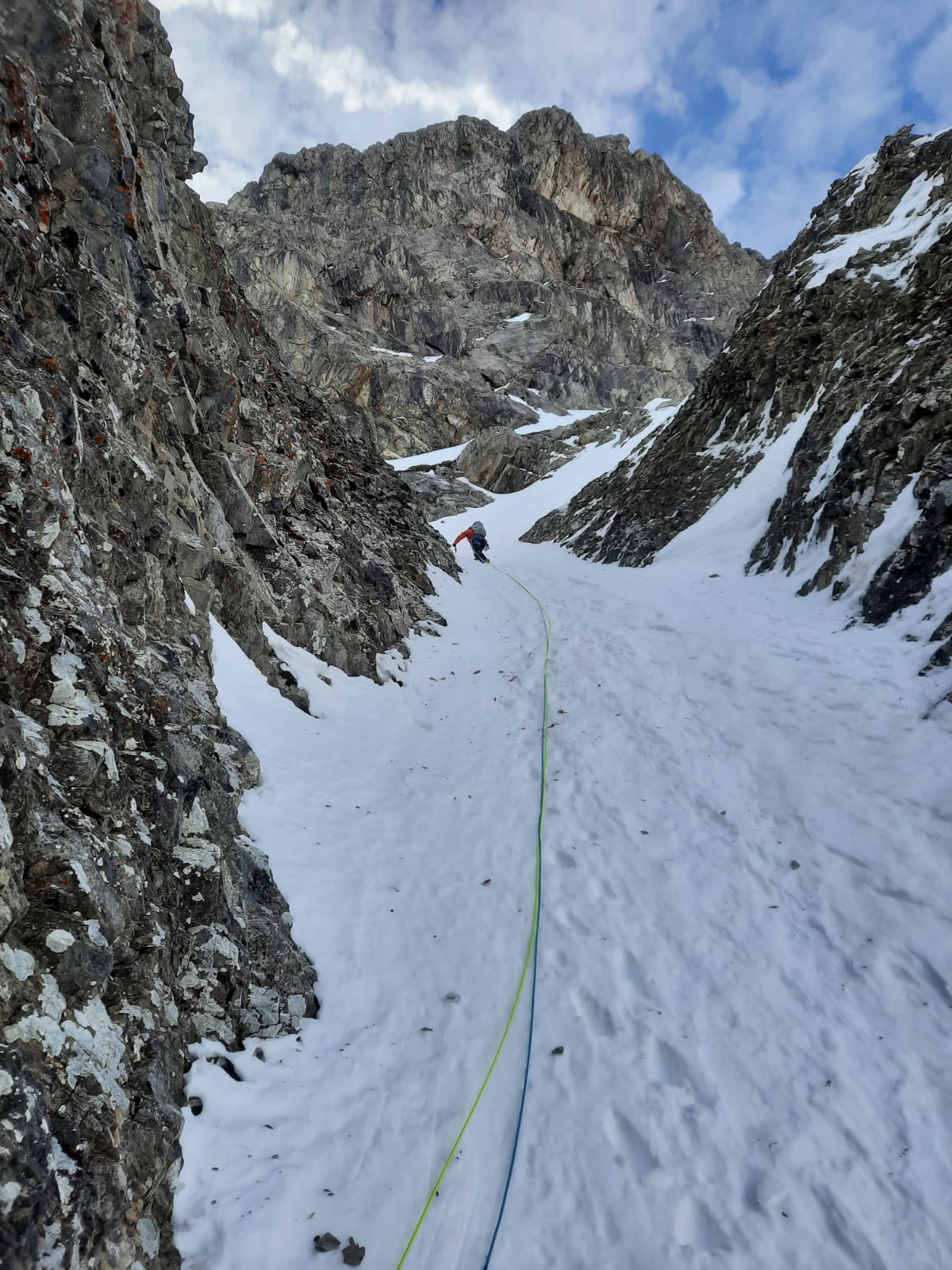 Si entra così nella stretta e impervia goulotte scovata da Grassi. Un passo di IV+ permette l’uscita dalla strettoia, seguono tratti di misto più o meno difficili a seconda delle condizioni. Si sosta a piacimento (50m). Si accede dunque al canale nevoso vero e proprio, inclinato a 50° e con qualche strettoia ancora ostica se pur breve, si esce in cresta (cornice spesso delicata) fra la Grand’Hoche e la Guglia d’Arbour, a breve distanza da quest’ultima.