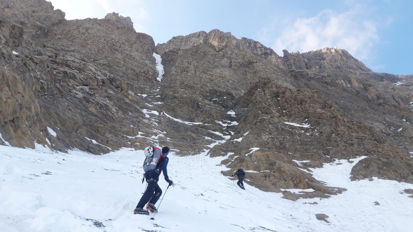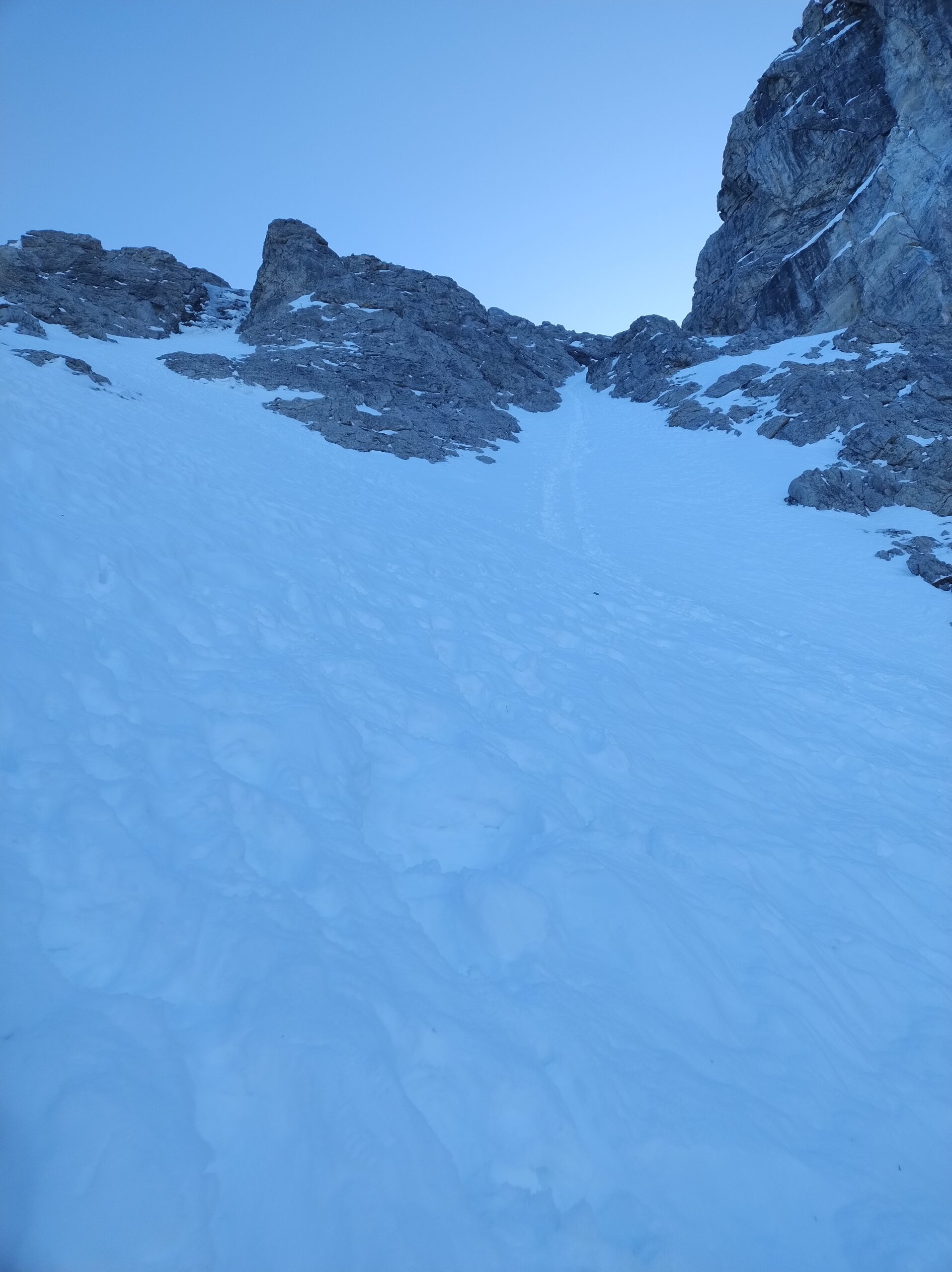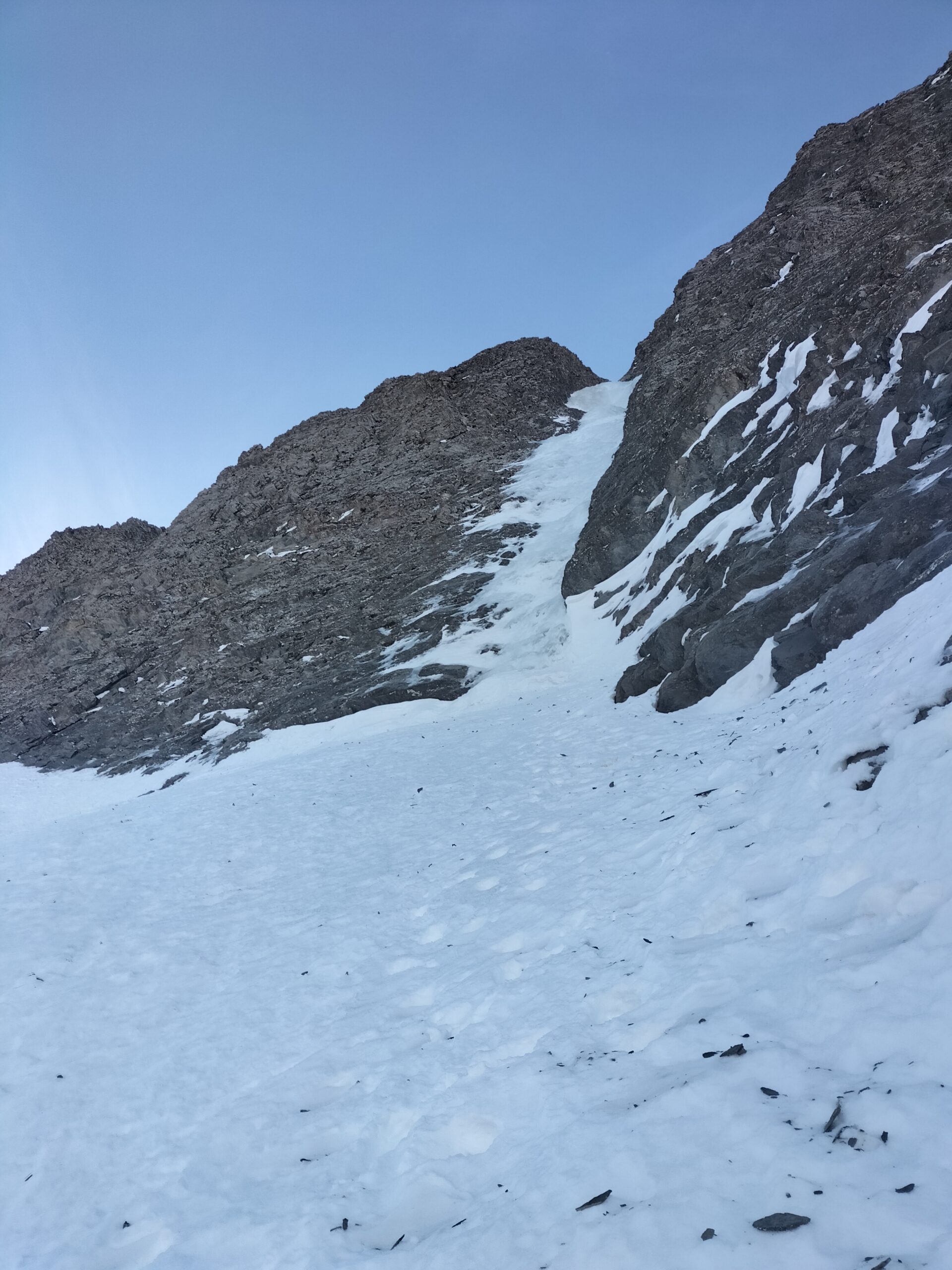 - Opzione2: imboccare il ripido e stretto canale (45/50°) che scende dal Passo dell’Orso restando inizialmente verso la Grand’Hoche quindi verso la Clotesse. Quando il canale muore su un salto di roccia reperire sulla dx (faccia a valle) una sosta 3ch. e cordini che permette con un calata di 40m di superare lo zoccolo roccioso. Continuare lungo il canale, via via meno ripido che punta diretto verso il rifugio.